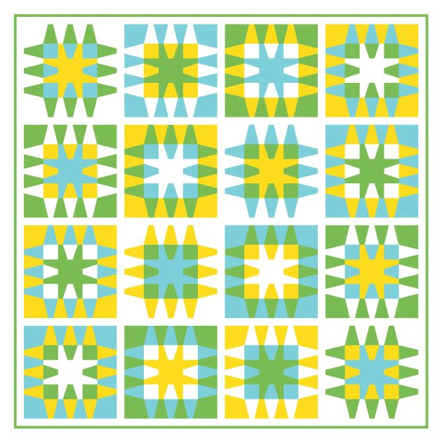 So – can you see how I’ve followed this rule in the versions below? Pick an element and a colour and check if it appears more than once in any column or row. For example, in the next version, look at the inner stars – how many green ones can you see? And where are they? What about white ones? Or yellow ones? Or blue? Do the same for the other 3 elements. They’re all distributed evenly across the whole design. It’s like some kind of Sudoku for quilt design haha.