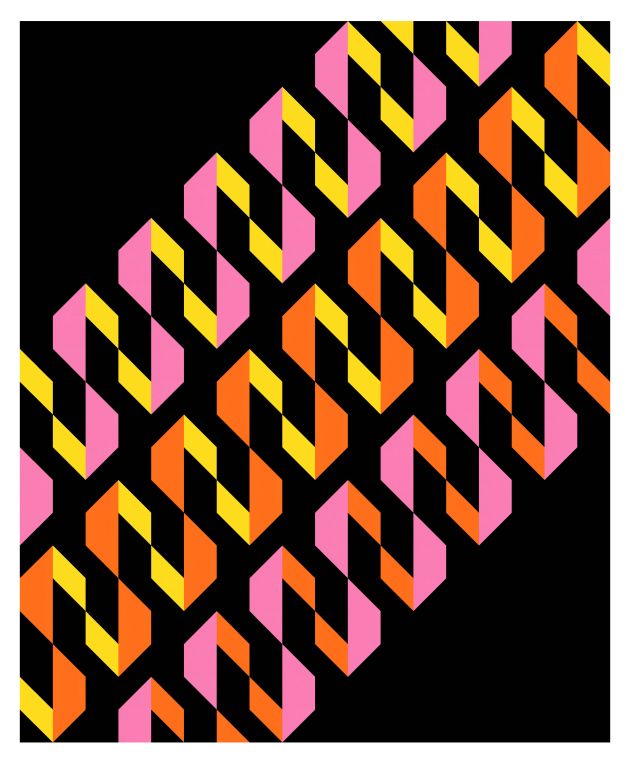 Multiples of this shape can be connected by just their tips, once again creating ascending rows of loop-like structures. But unlike last week’s design, this week’s has only elongated diamonds as the secondary shapes. Colouring them (in white, below) helps to see them more clearly, and ties the three rows together.