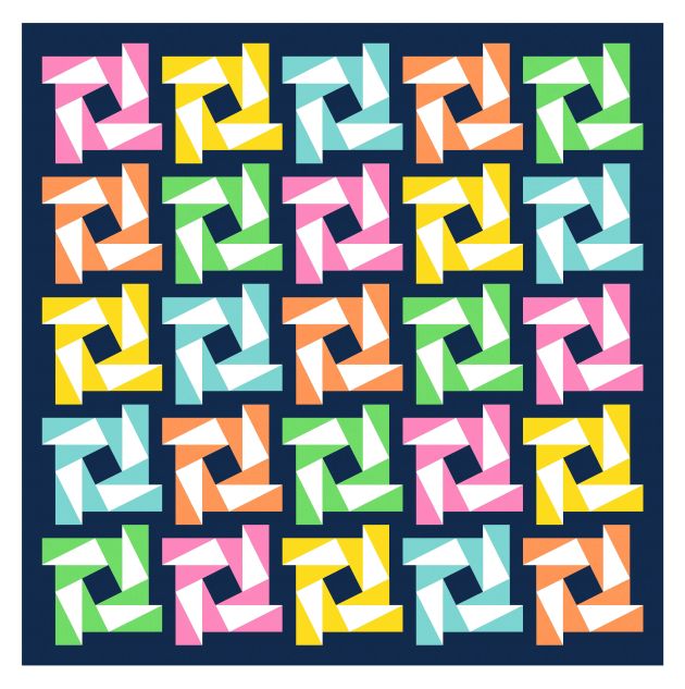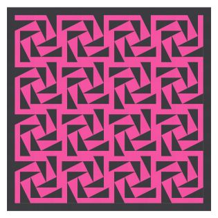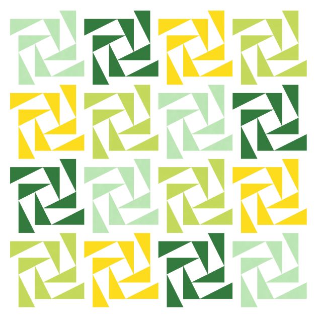 This Sunday sketch is a block-based design using multiple half-rectangle triangles. They’re joined to each other primarily by their diagonal angles rather than their short or long edges. There are three ‘sets’ of HRTs within each block; in the top design, two of the sets are in colour and one is in white. Here’s each set coloured differently: