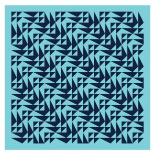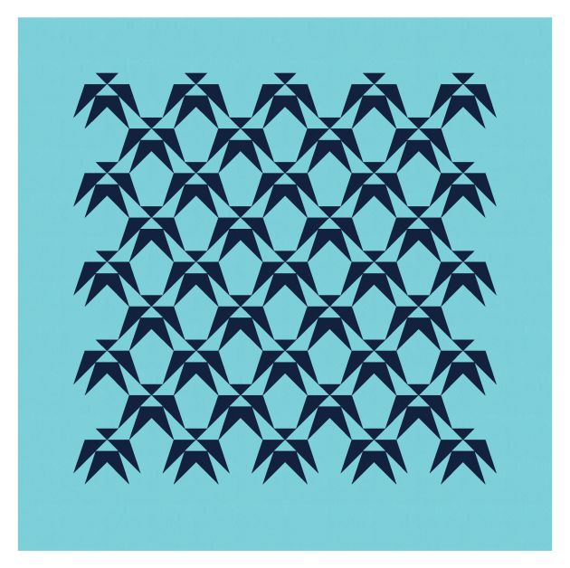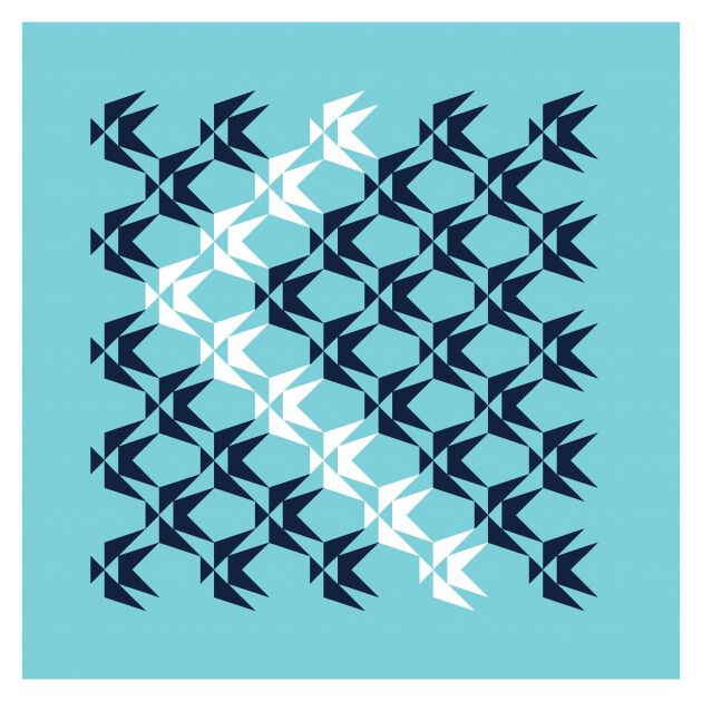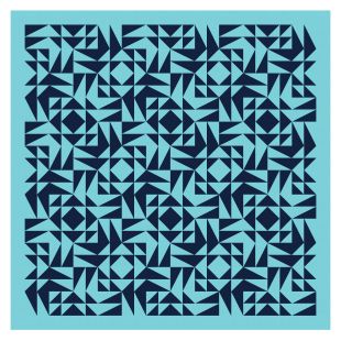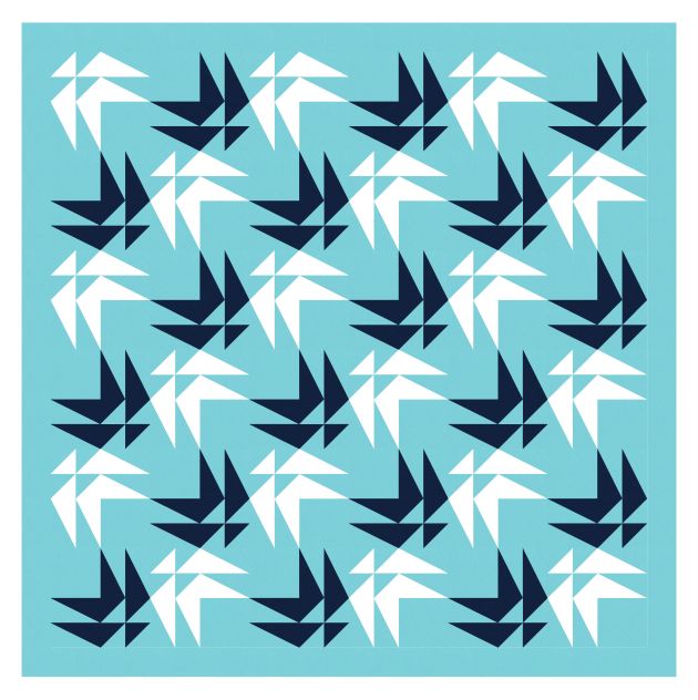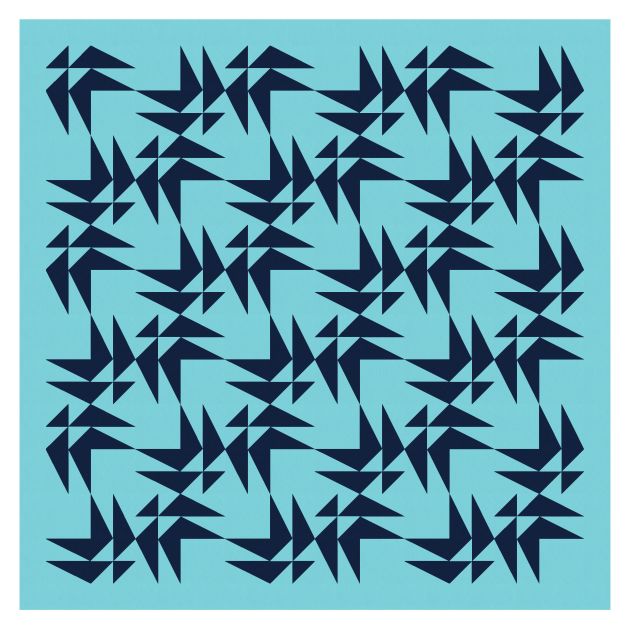 Here’s the same block in a different layout; the top rows of the two designs are the same, but from then on, the blocks are rotated differently. In this version, the spaces between the black and white shapes almost end up looking like they’re slightly different shades of light blue, depending on which diagonal line of blocks you’re looking at.