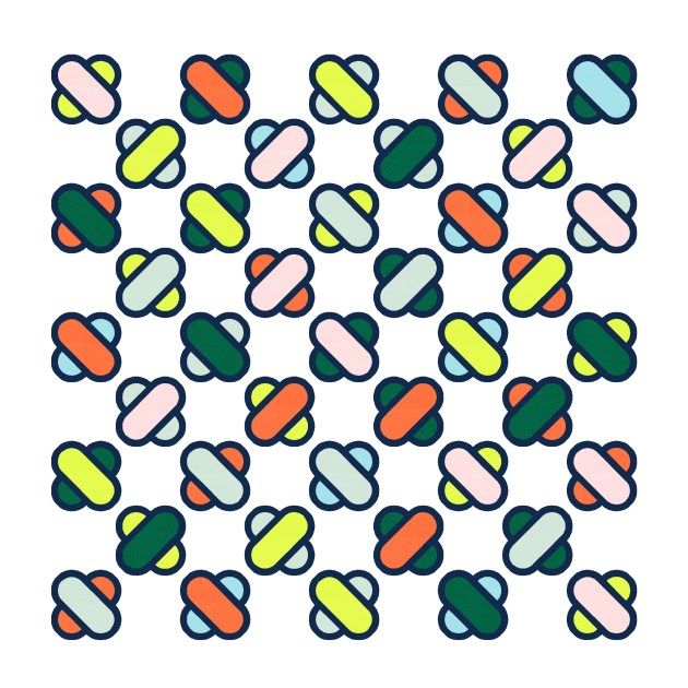 I started thinking of these little shapes as knots, but the more I played with them, the more they reminded me of little cross-stitches. So I re-coloured them as if the same thread was winding its way across a canvas.