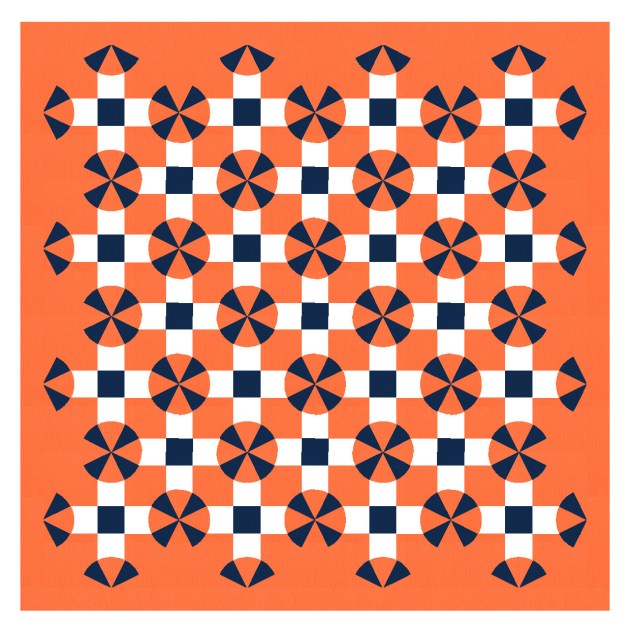 This week’s sketch is made up of circles (comprising 8 sectors of equal size) and squares. I really don’t know how I’d make this one. How would you join the sectors to the adjacent cross pieces? I guess you’d have to use templates and probably partial seams? It might be easier for hand-piecers rather than for machine-piecers? Part of me wants to try it just to see if it’s possible (which I’m sure it is), but the other part of me knows I have many more (easier) sketches to make first 🙂