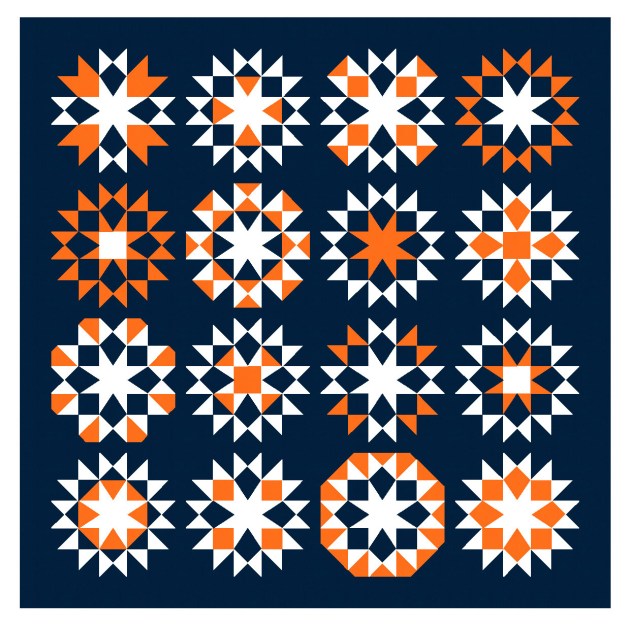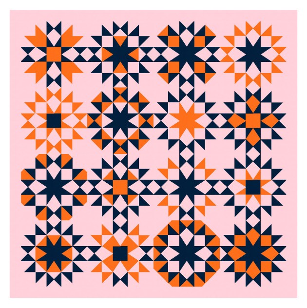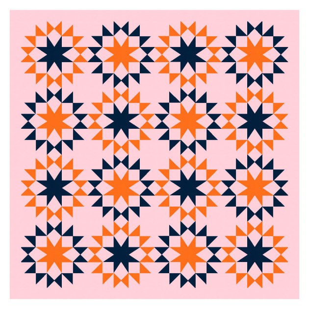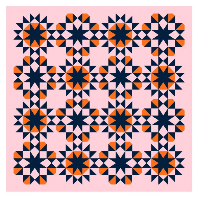 I don’t have a favourite quilt block (I don’t really do favourites), but I do love a good eight-pointed star. (Basically a nine-patch where each pair of pointy bits fits into one square; contrast that with a sawtooth star, which is essentially a 16-patch where each pair of pointy bits takes up two squares). Here I’ve shortened the pointy bits so they’re half-way between a sawtooth star and an eight-pointed star.