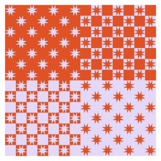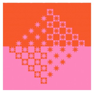 This is one of those apparently simple designs that I feel is a bit more complex on closer inspection. Each of the two blocks in each quadrant extend into the two adjacent quadrants. For example, at the top left, the orange squares continue on into the top-right quadrant, while the light stars against an orange background continue down to the bottom-left quadrant. At the top right, the orange stars against a light background continue down the design, while the orange squares continue across. It’s the same for each quadrant; they’re all connected.