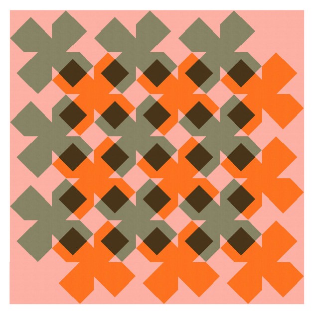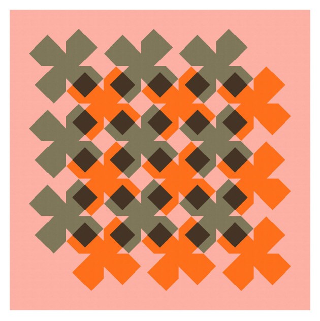 The first version of this week’s design could be made using squares, rectangles and half-square triangles set on point. The last version could be made using drunkard’s path units (or quarter-circles), rectangles and orange peels.