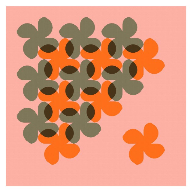 I tried to refine the design a little by curving the edges of the ‘flower’ shapes, which introduces lovely new secondary shapes (the orange-peel units in dark brown). The curves of the flower shapes are maybe not quite right – there’s a point at the tip of each petal where two curves meet that’s a bit sharp for me. But I love those orange peels!