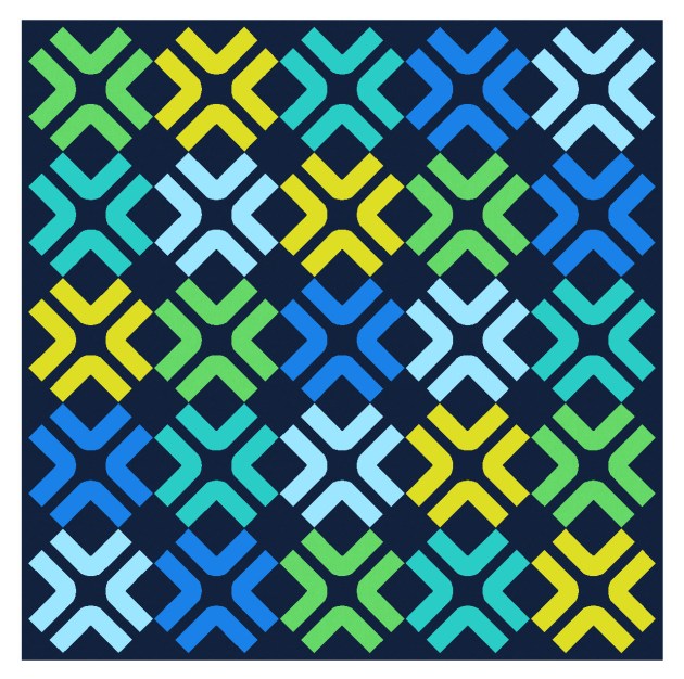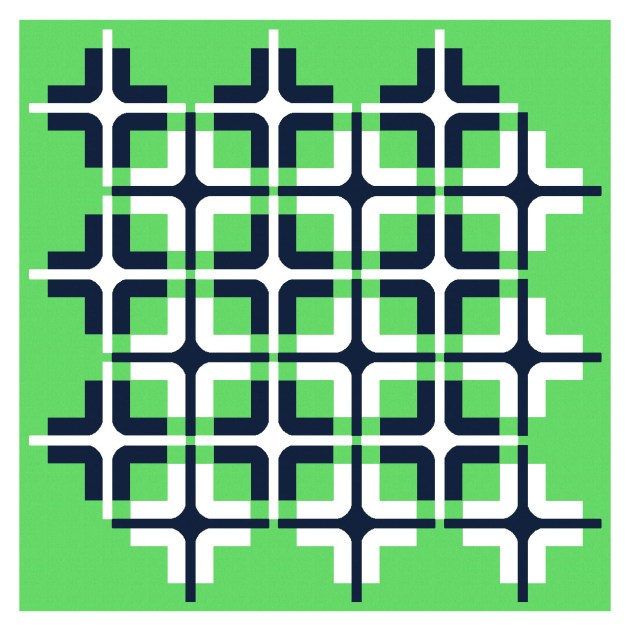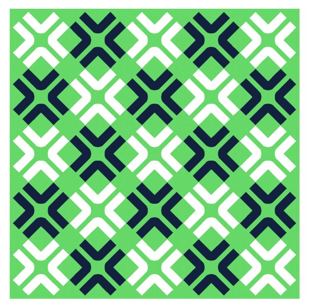 Last week, I ended on a layout in which the blocks were set on point. Both the rounded and the squared corners in each block were coloured the same as the background, and the block had a leaf shape (also in the same background colour) in the middle. I didn’t love those versions.So this week, I’ve removed that internal leaf shape and replaced it with the square that was there originally. I left the curved corners coloured in, but the squared corners are still gone (coloured as background). And then I mixed up the colouring to highlight a different set of shapes within the design. I really liked these retro Xs, with their arms separated by the sashing in between blocks.