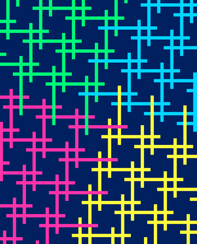I started off small (and with a limited palette), just to explore the motif and its layout. Obviously, joining the bottom-right arm of one block to the top-left arm of the next one will create a stepped layout, which eventually resembles a slightly off-kilter square. All those intersecting lines create some shapes to colour in, too.