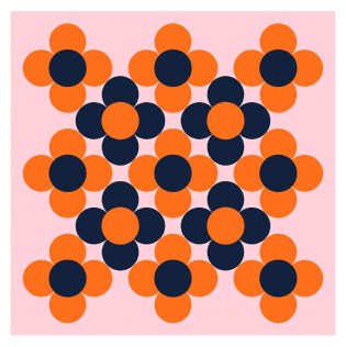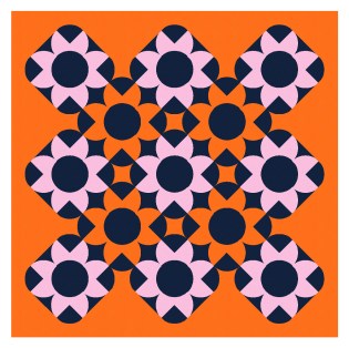 Each of the petals is made up of four quarter-circles or drunkard’s path units, so a natural iteration is to use a different colour in one of those. That introduces some new lines that create secondary shapes (squares) between the flowers. (I also changed the shade of pink that I used – you can see the difference in the background colours of these two versions).