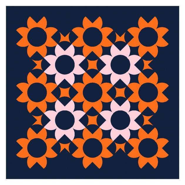 I’ll show you more designs along those lines next week. For now, here’s another version that makes the most of those concave curve-based squares (and partial pointy shapes) between the flower blocks. I’ll play with those more next week too.