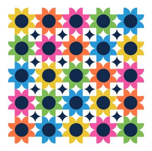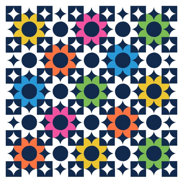 I like this multicolour palette – so bright and happy! – but I prefer the alternating colour/white flowers of the first version, which let your eye rest a bit while maintaining the repetition of the flower blocks.