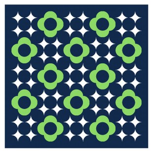 This makes three ‘areas’ per block for colouring in different ways (not counting the background)… the main flower or star shapes, the middle circle, and the centre star. In the previous version, I’ve used the same three colours per block but mixed them around a bit. In the first and last versions I’ve shown here, I’ve coloured one shape consistently across all blocks, for a more cohesive look: in the first version I’ve posted, the middle circles are all in the background colour. In the last version, it’s the centre stars.