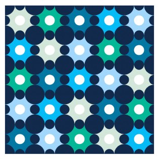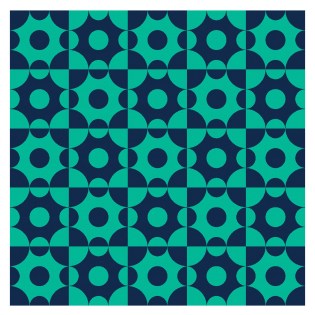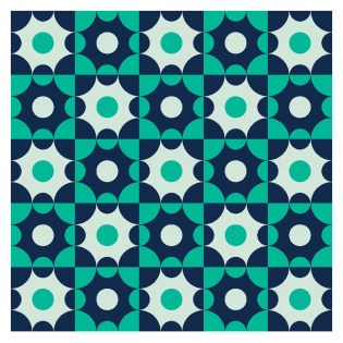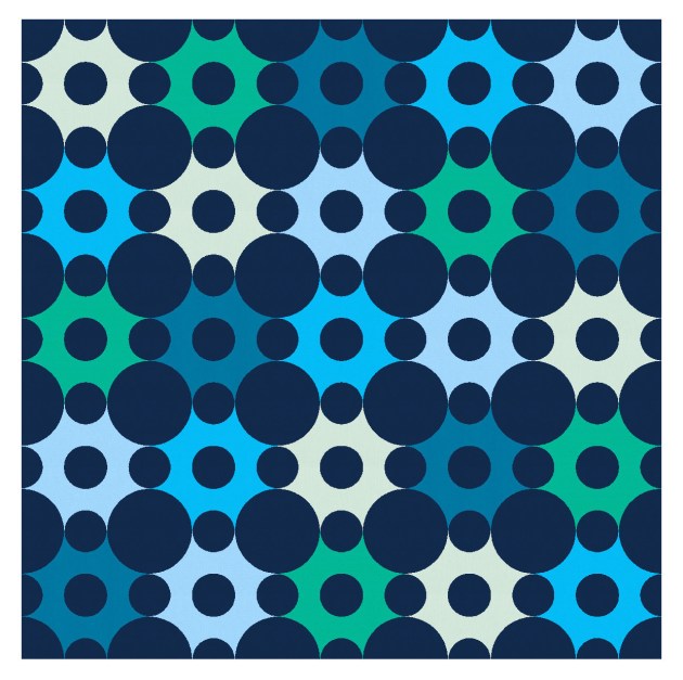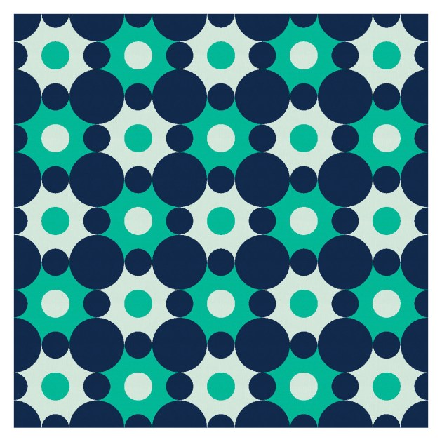 The rows and columns of secondary shapes are still there, but the circles are now a mix of small and large. The block has a circle in the middle, and then half- or quarter-circles around the edges that combine with those of adjacent blocks to make more circles.