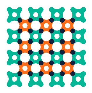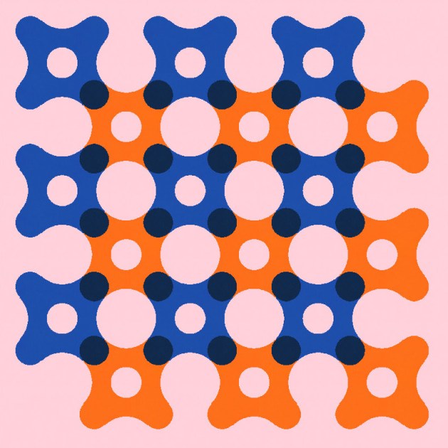 Because those small dark circles form between adjacent blocks, they provide an opportunity for playing with colour and introducing transparency. Removing any dark circle (by replacing with the main block colour) where there isn’t an overlap helps to emphasise this effect.