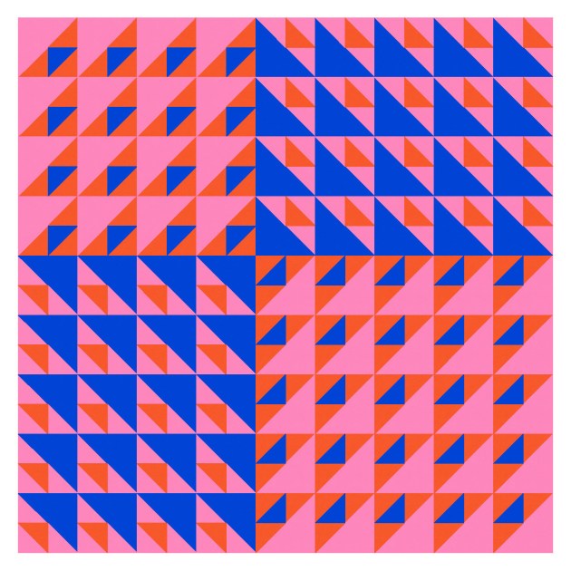 Adding a third colour to the palette changes the whole look again. Using three colours in a block with three parts (the big triangle on one side, the three small triangles on the other side, and the last small triangle in the middle of those three small triangles), where you don’t use the same colour more than once, gives you six colouring possibilities in total (3 x 2 x 1). I’ve only used two of them in this next version.