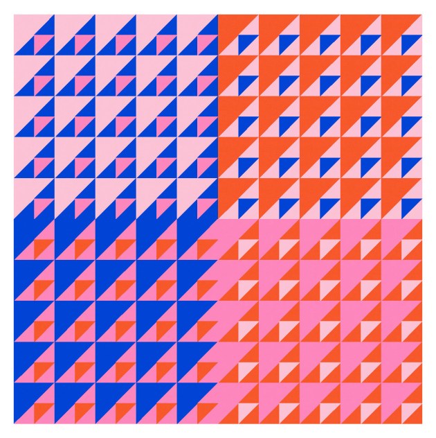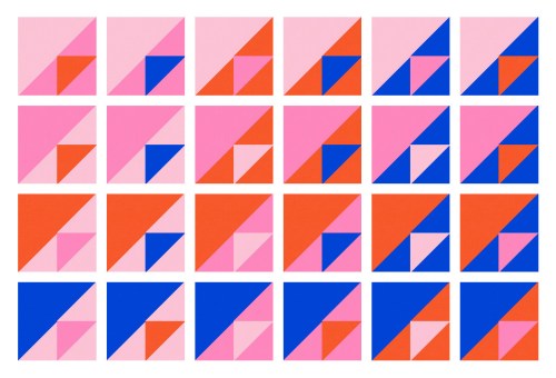 In case you don’t believe me, here are the 24 possible combinations of those four colours in a block with three discrete parts. In each row, the top/large triangle is the same colour, and the remaining colours are cycled through the other shapes.
