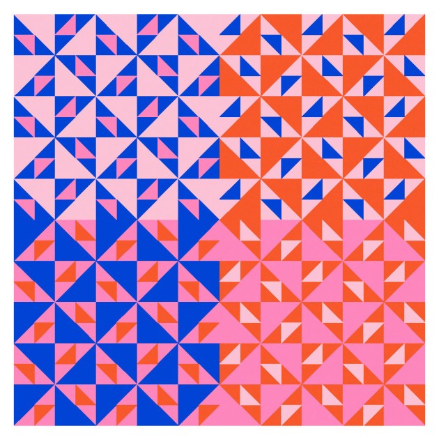 This is obviously a single block on repeat, and I’ve used a simple two-colour palette. But alternating the colours within the block and rotating the blocks can produce a slightly different look. I think maybe I do like this next one more?