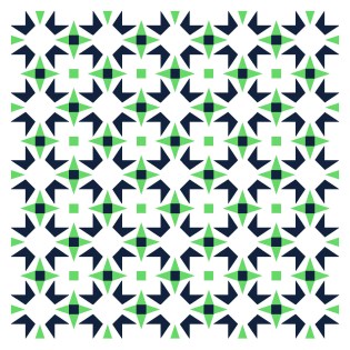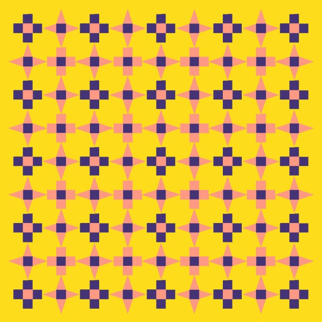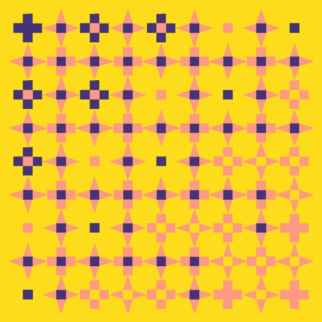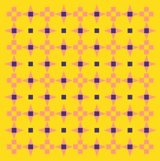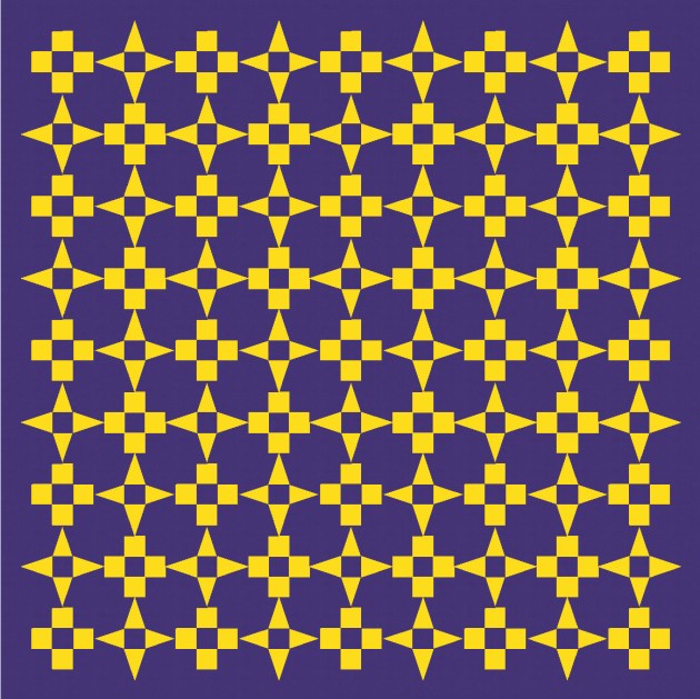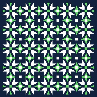 The design started out a little more complicated (more on that later), but I pared it back to an alternating arrangement of four-pointed stars and crosses. Emptying out their centres (by colouring the squares in the background colour) helps to introduce consistency across the blocks. And the angles between the blocks help to trick the eye into seeing curves.