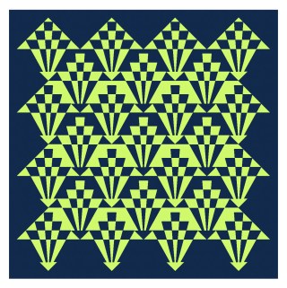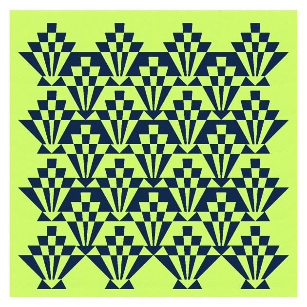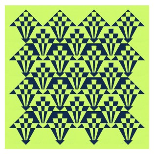 The design is block based, with the setting on point. I’ve alternated the colouring between adjacent blocks: acid lime on dark blue (which looks black here), or dark blue on acid lime. That lets the elements along the sides of the blocks merge into those of the adjacent blocks, so it’s less obvious where the edges of the blocks are.