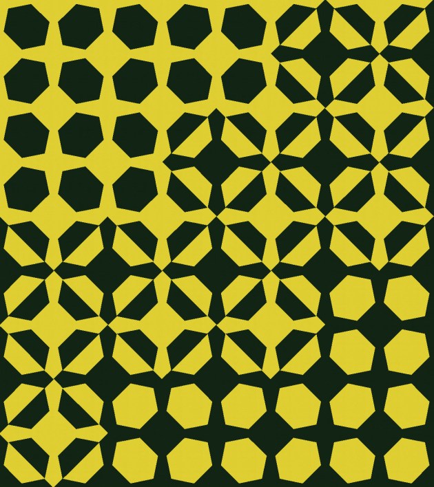 The block can be arranged in a bunch of interesting ways. I like the centre of this next design – those split hexagons nest with each other nicely, a bit like teeth or cogs – but I’m not sure I love the bold stripes that result. I guess I could’ve extended the blocks to the edges of the design, but I wasn’t so enamoured with that.