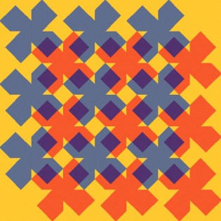 I played around with colours for a while – but decided that I wanted to use solids from my stash. I always seem to have orange on hand, and I managed to dig out a dark green and a bright yellow, plus a light teal that worked as a believable mix between those two. They’re undoubtedly Kona Solids, but I’m not sure which ones (and I can’t check now, because the quilt is in the USA!).