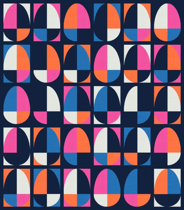 This design uses the long oval drunkard’s path shape from Jenny Haynes (Pepper, Sax, Sten), who’s created a series of templates that I have and love. I’ve used this shape in lots of designs, and in a quilt too. Combined with quarter-circles (or drunkard’s paths), it creates the perfect egg shape.