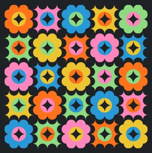 Oh, and I wanted to try a larger palette, so here’s my usual 5-colour palette for a 5 × 5 layout, where each colour appears twice in each row and column (ideally; it doesn’t always work out that way by the time I get to the last row…!). Again, you can see where I’ve used the background colour for the same components in each block: the stars in the first version, and the circles in the second.