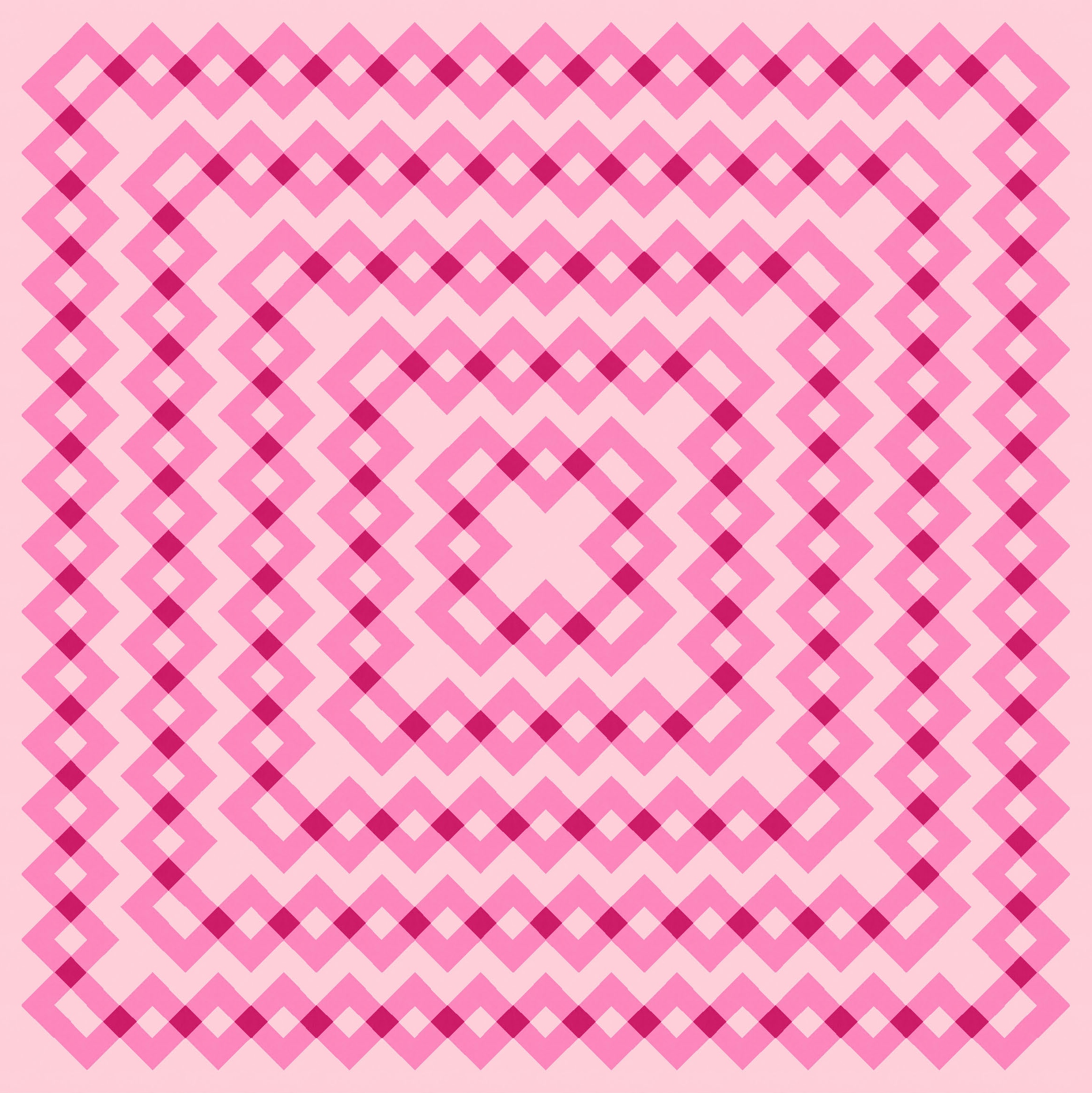 I started with my usual favourite combo of yellow, pink and orangey-red, but this design works in just two colours too (discounting the background colour for now…). The dark pink squares in the first version below are probably a smidge too dark, but I think your first instinct is to consider those squares as overlapping areas, which I guess is the point.