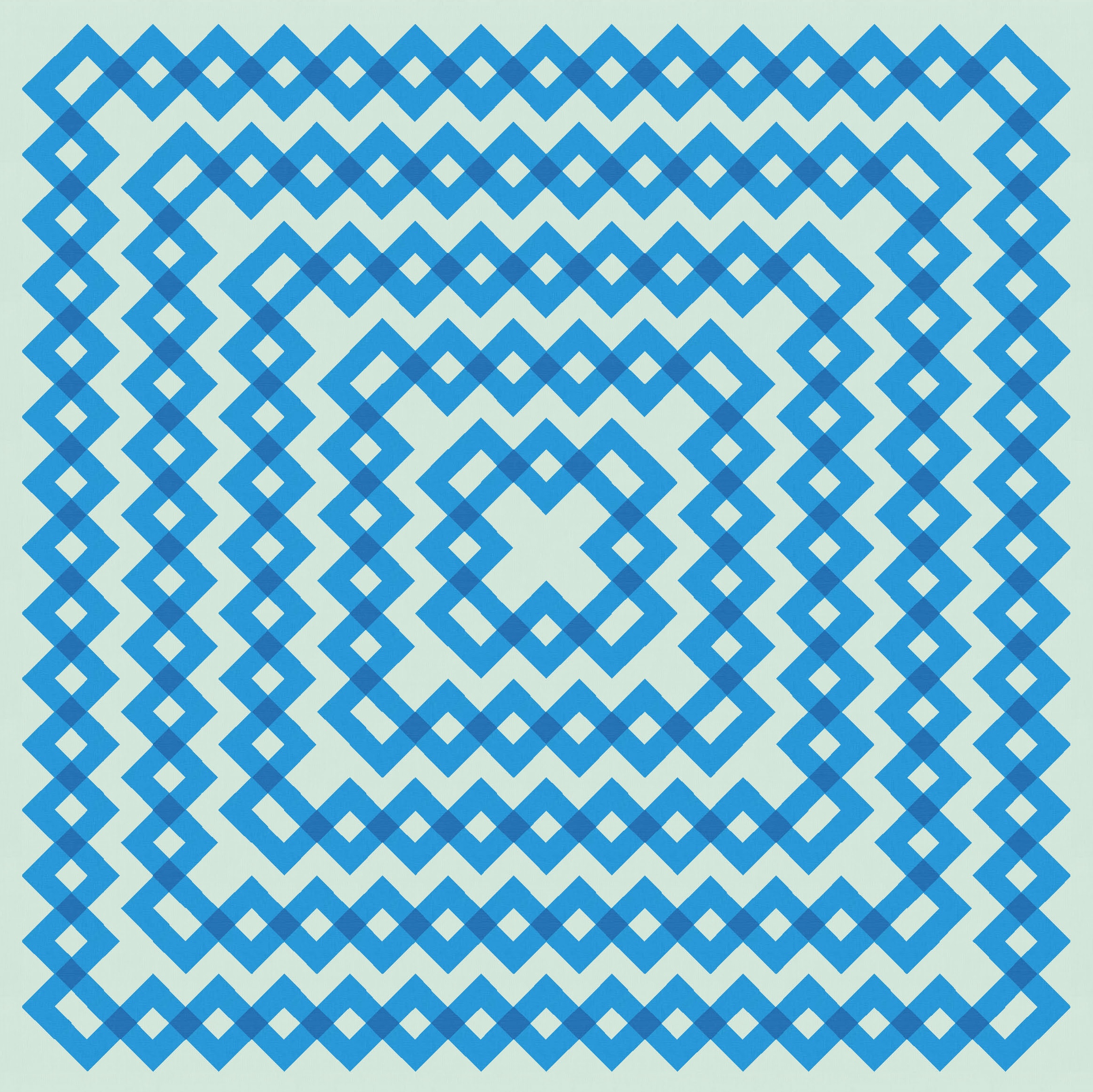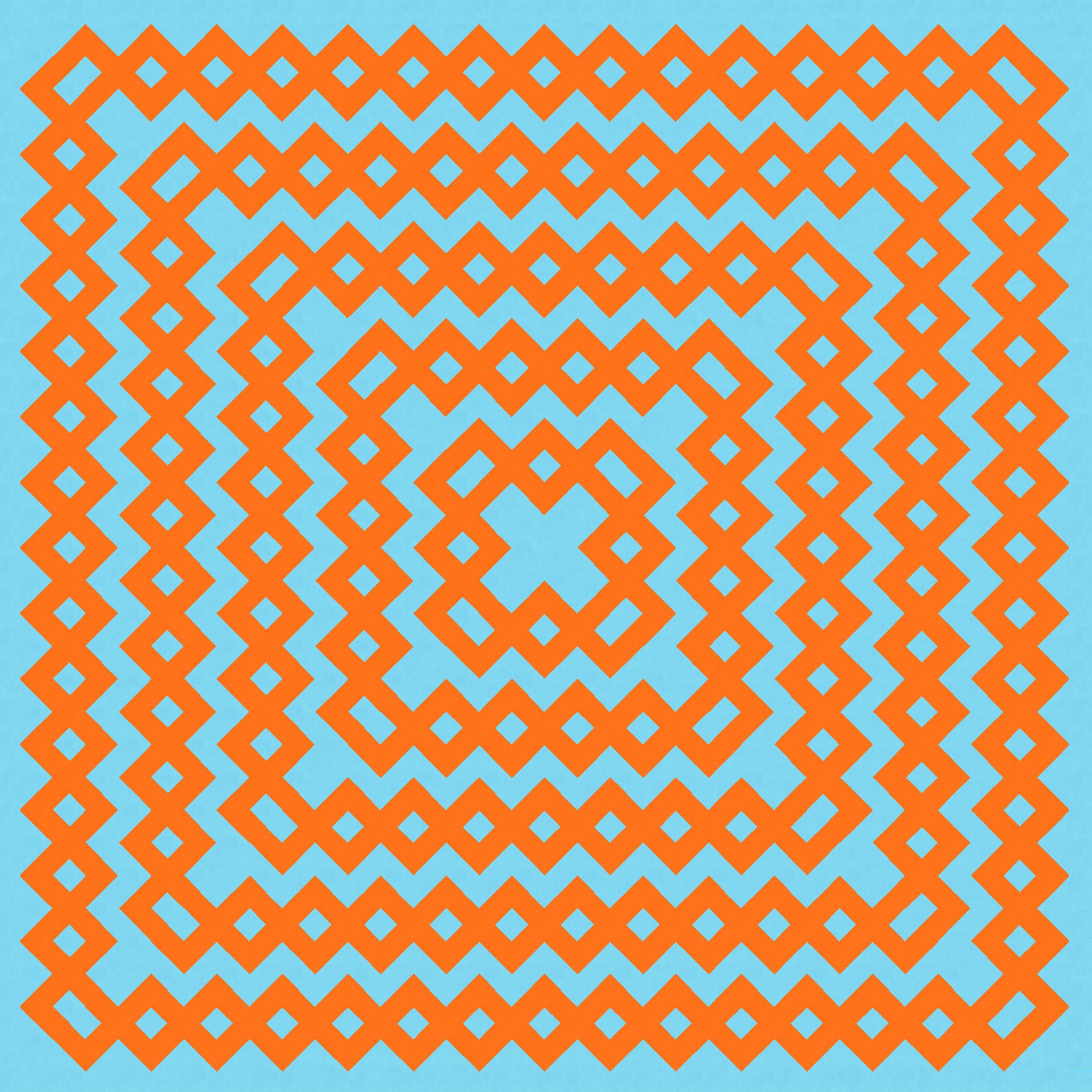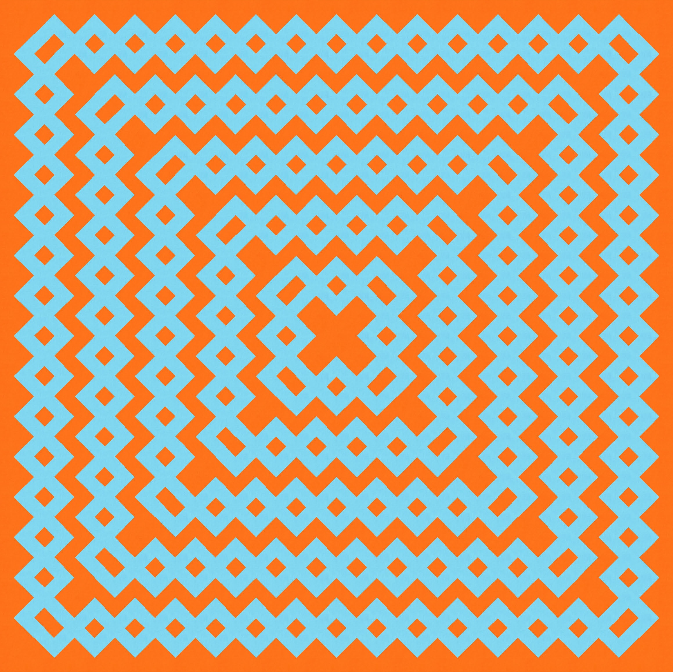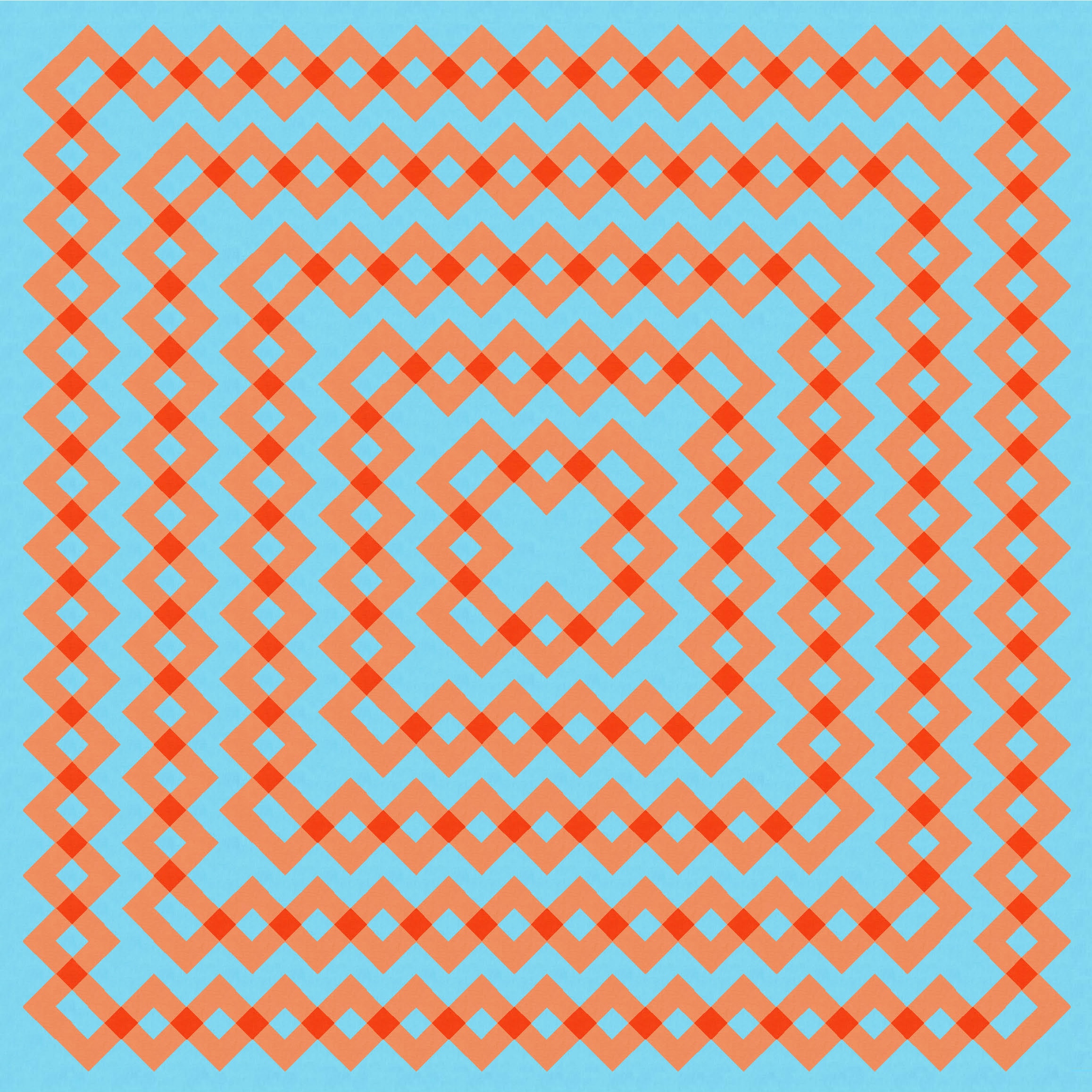 Removing the transparency changes the design in subtle and not-so-subtle ways. In the case of a blue and orange palette, I think the darker squares (where zigzagging lines overlapped) helped to anchor the design in some way; without them, the criss-crossed, accordion-like stretches seem to take on a lot more movement and energy. I guess it’s because the eye is just drawn to different areas now. The reverse colourways feel quite different to each other, too.