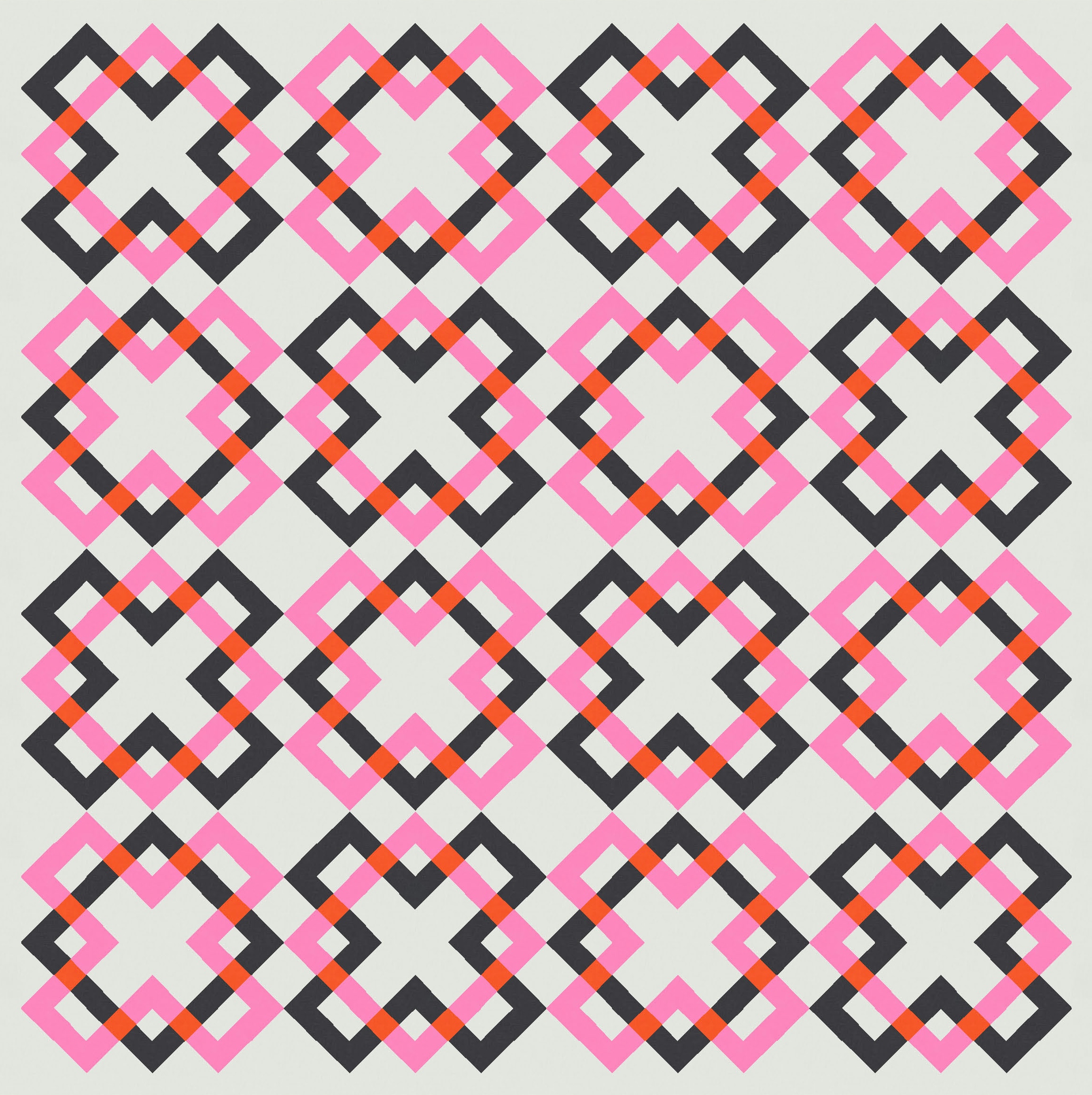 In the example above, black and pink are never going to overlap to give a bright reddish orange, but I think the transparency effect still works. Similarly, black and pale pink overlap below to produce a bright blue. I tried to create versions where the overlap produced a darker colour (bottom left) or a lighter one (bottom right).