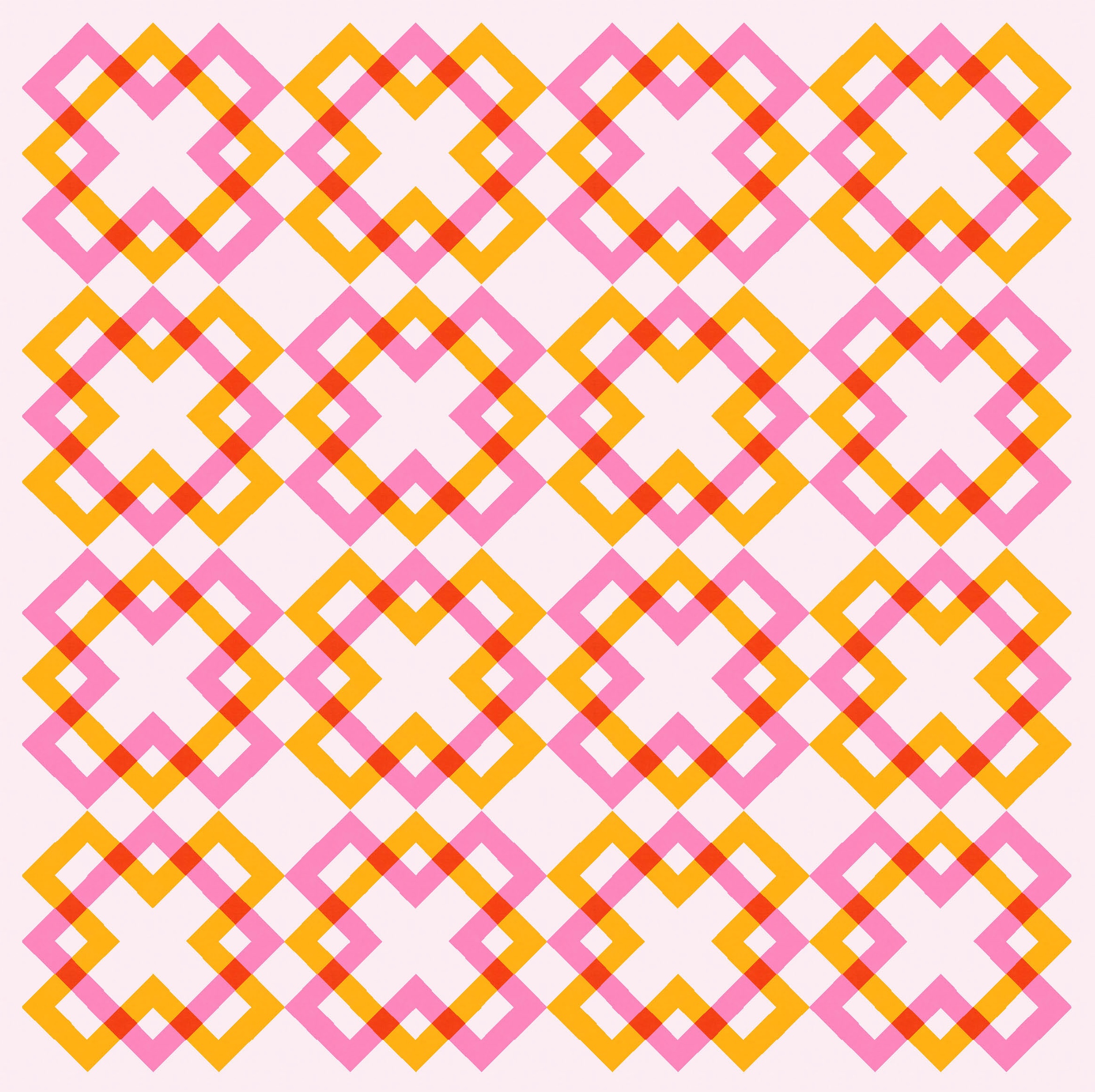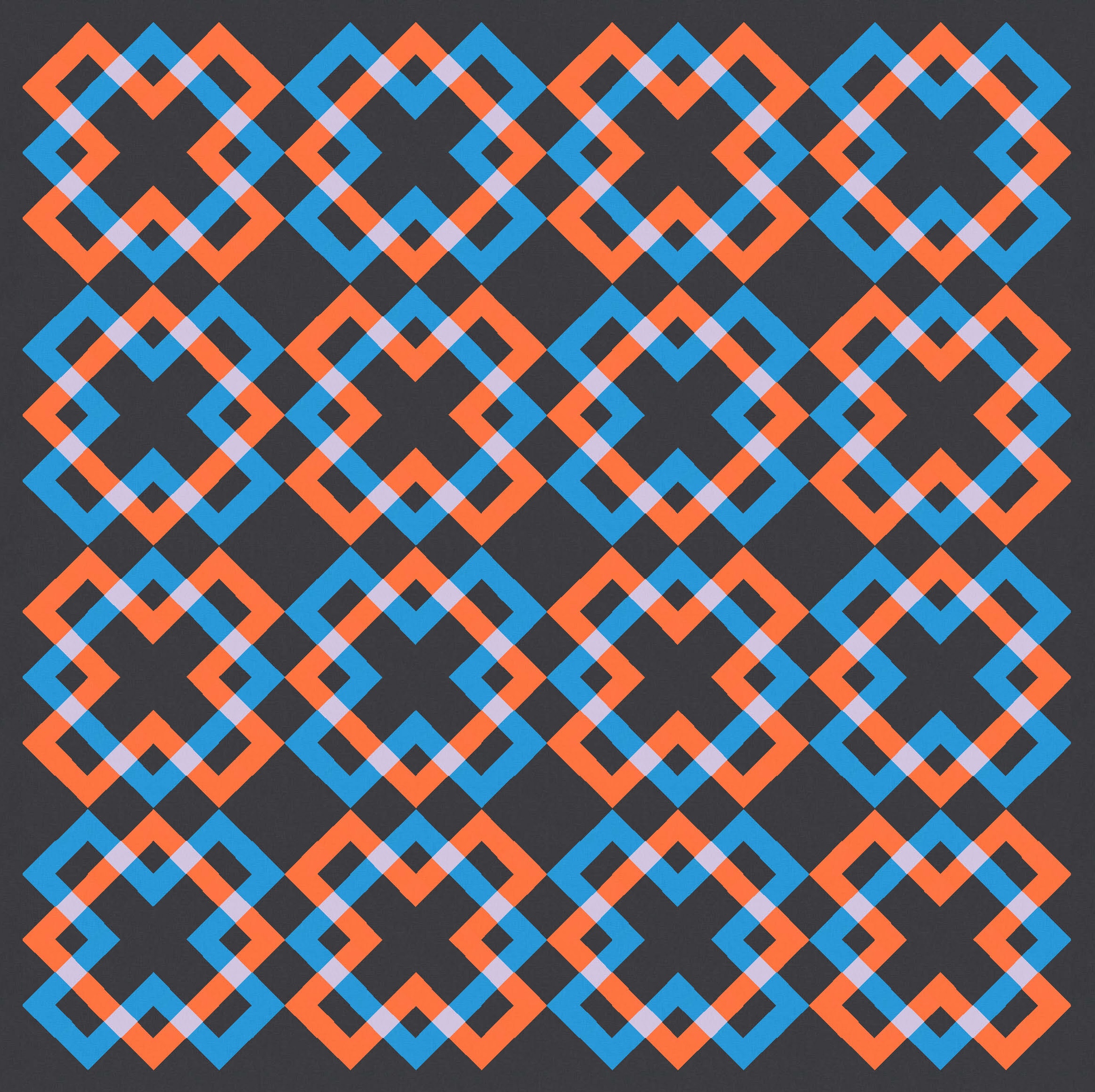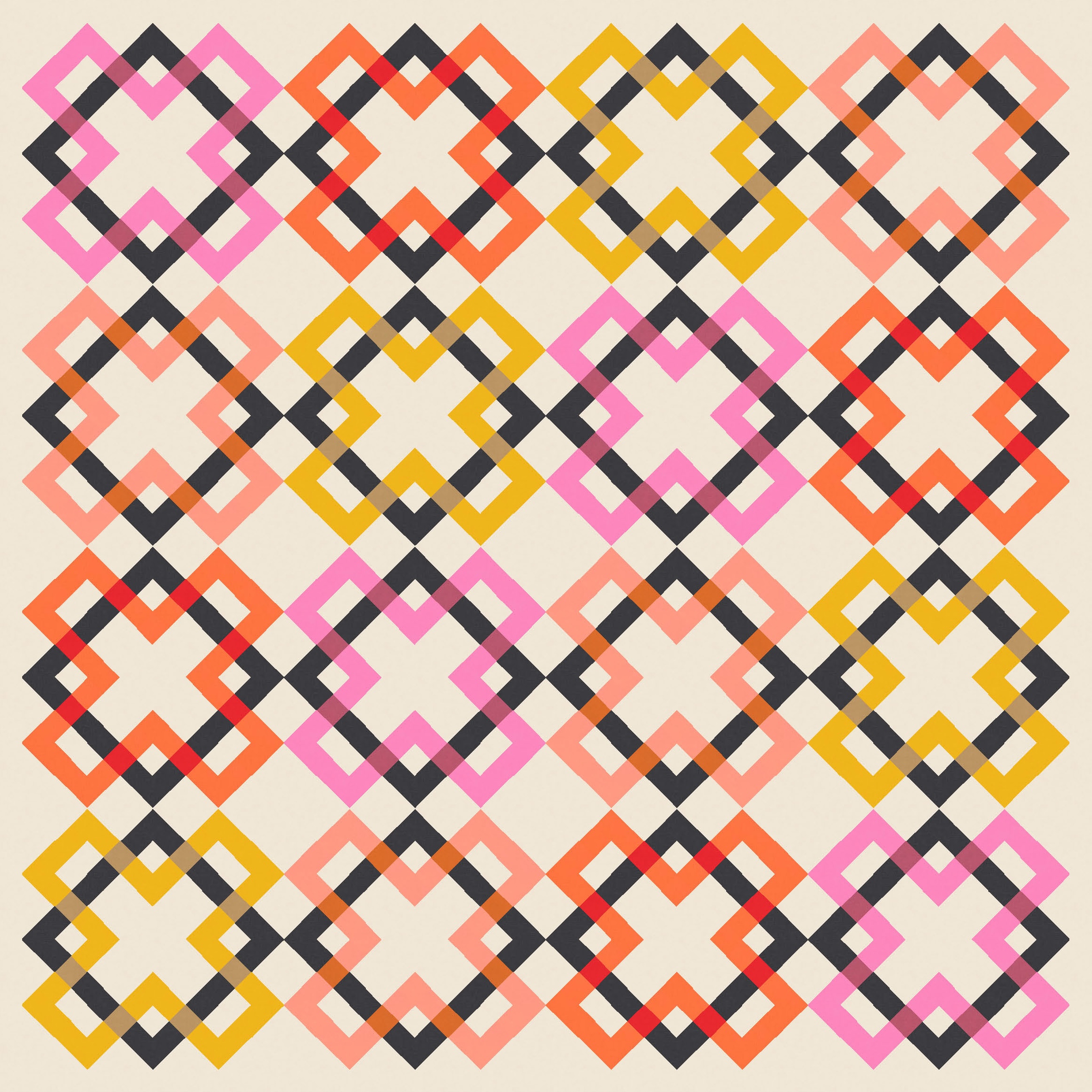 And, of course, so many shapes means so many opportunities for colour placement. In the next version, I’ve coloured all of the squares (or Os) in black, but changed up the crosses (Xs) in different colours (my usual warm palette). And I’ve still played with transparency (using a more sensible/logical colour in each case). There’s enough consistency between the blocks to not get too busy, although this is probably at my limit of busy-ness 🙂