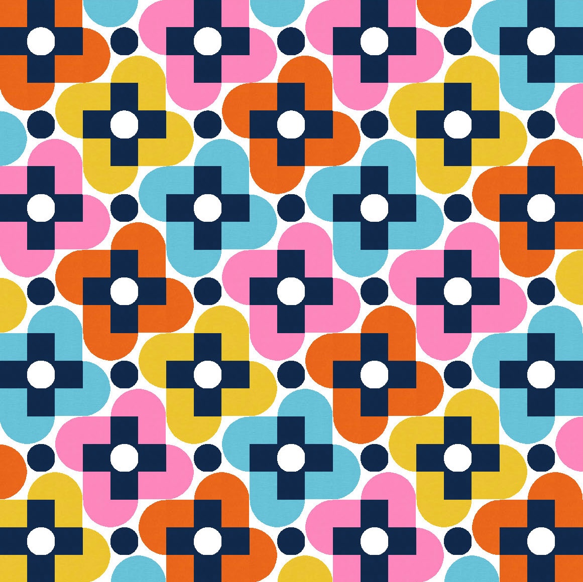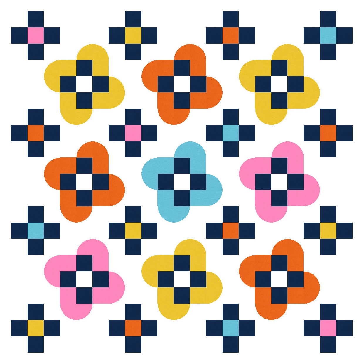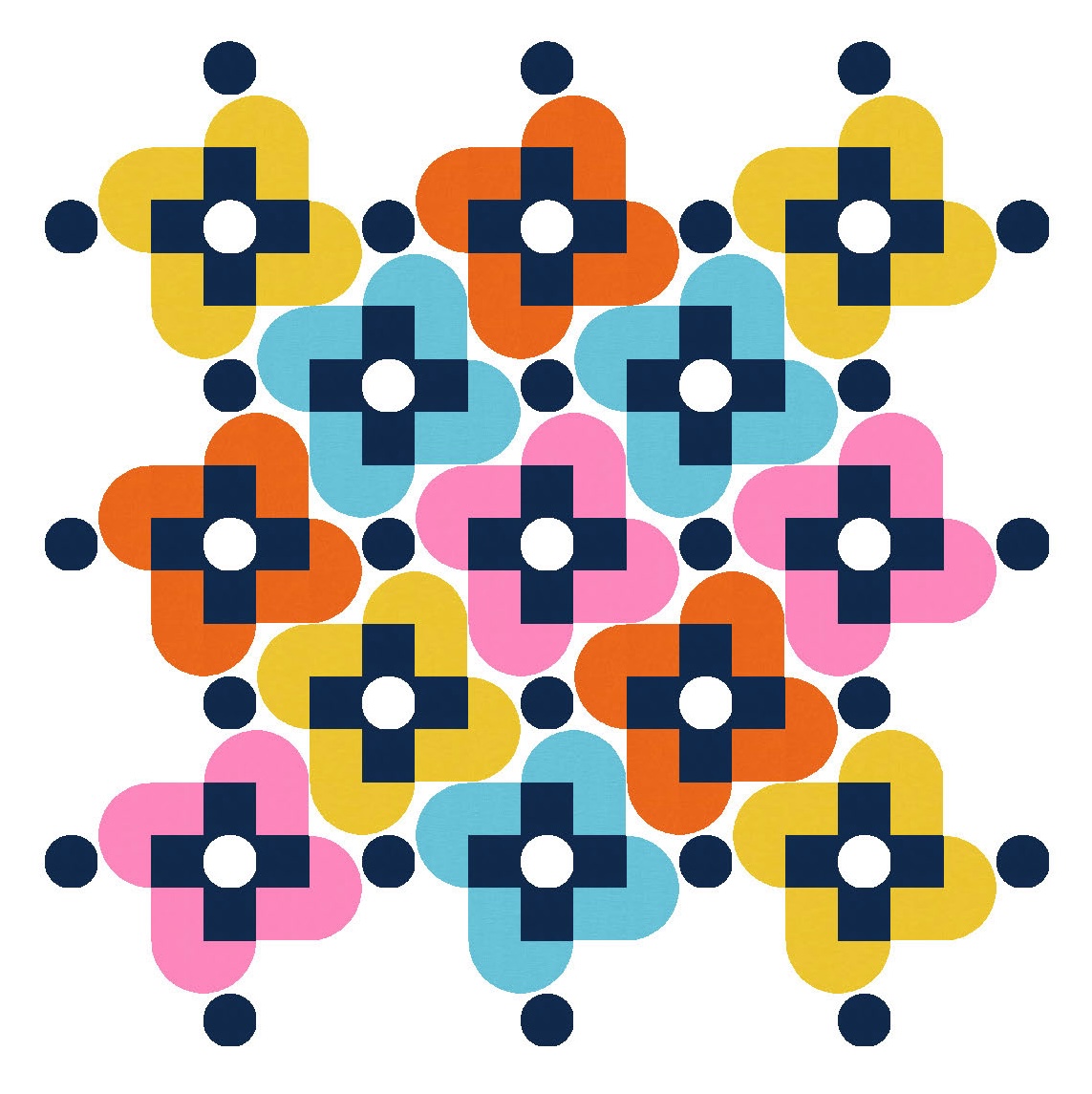 Before those centre curves created the curved pinwheels (shown in a dark bluish/black here), I had crosses in the centre of the main shapes. (I can’t really call those shapes blocks, I guess; maybe flowers or stars?). I added circles in the middle of the crosses, just to introduce something different that echoed the curves used elsewhere in the design. And then added more of the same circles between the flower shapes, for some visual consistency. It was all getting a bit busy though.