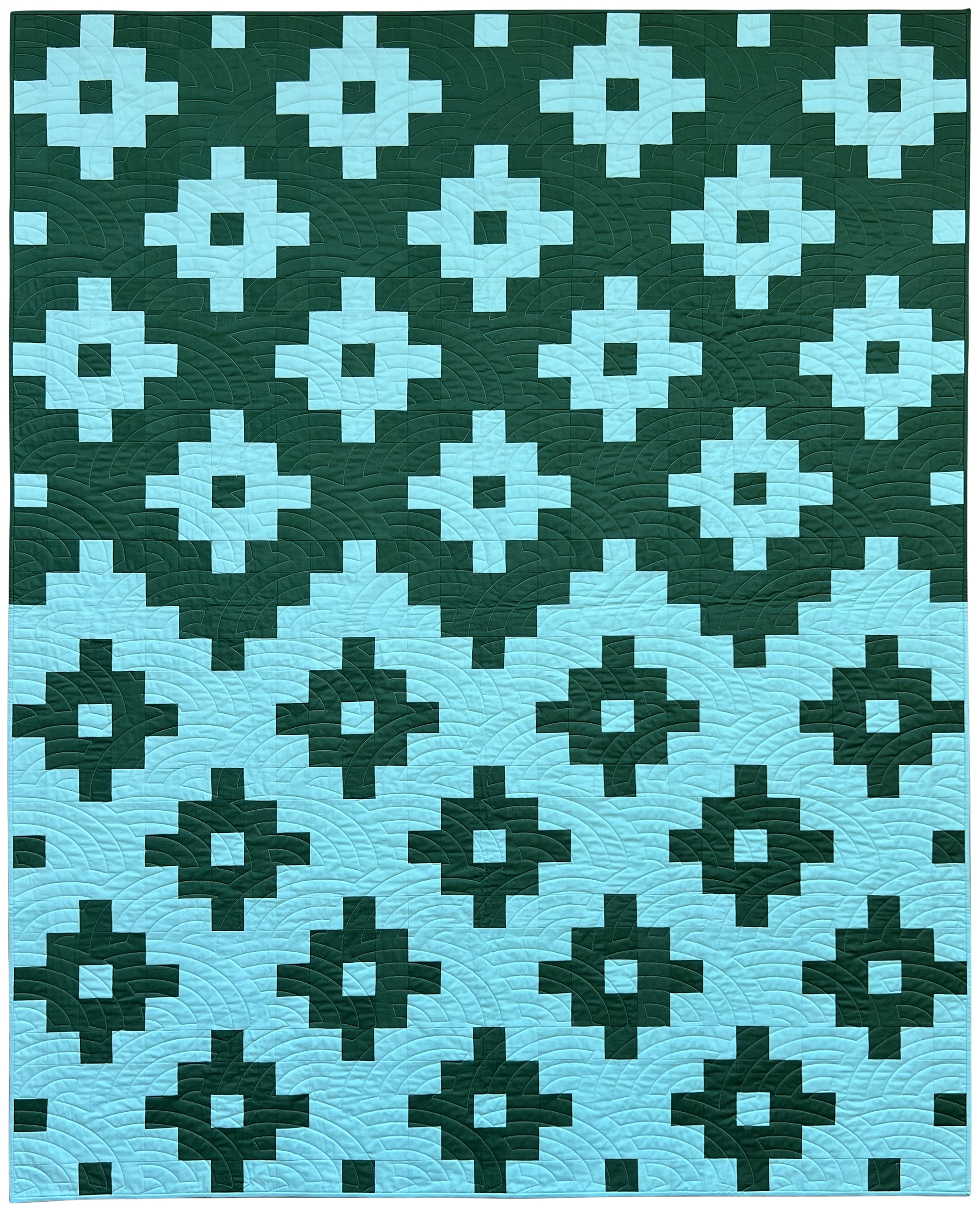 In the end, I broke the design into square blocks with pieced sashing, then came up with a simple strip-piecing approach to make assembly super-quick and easy. I chose an alternating baptist fan panto design, which was quilted by Valerie Cooper of Sweet Gum Quilting.