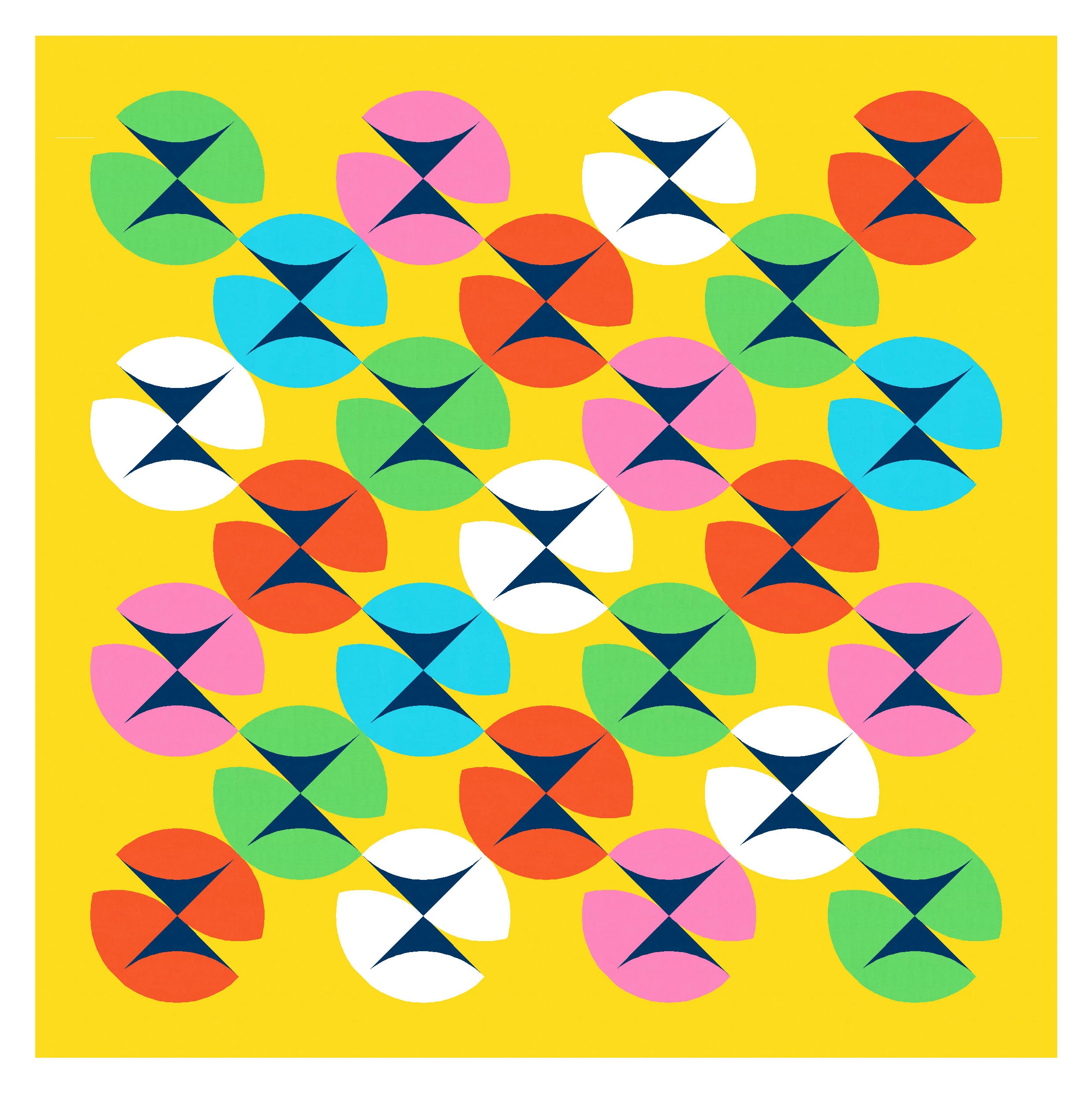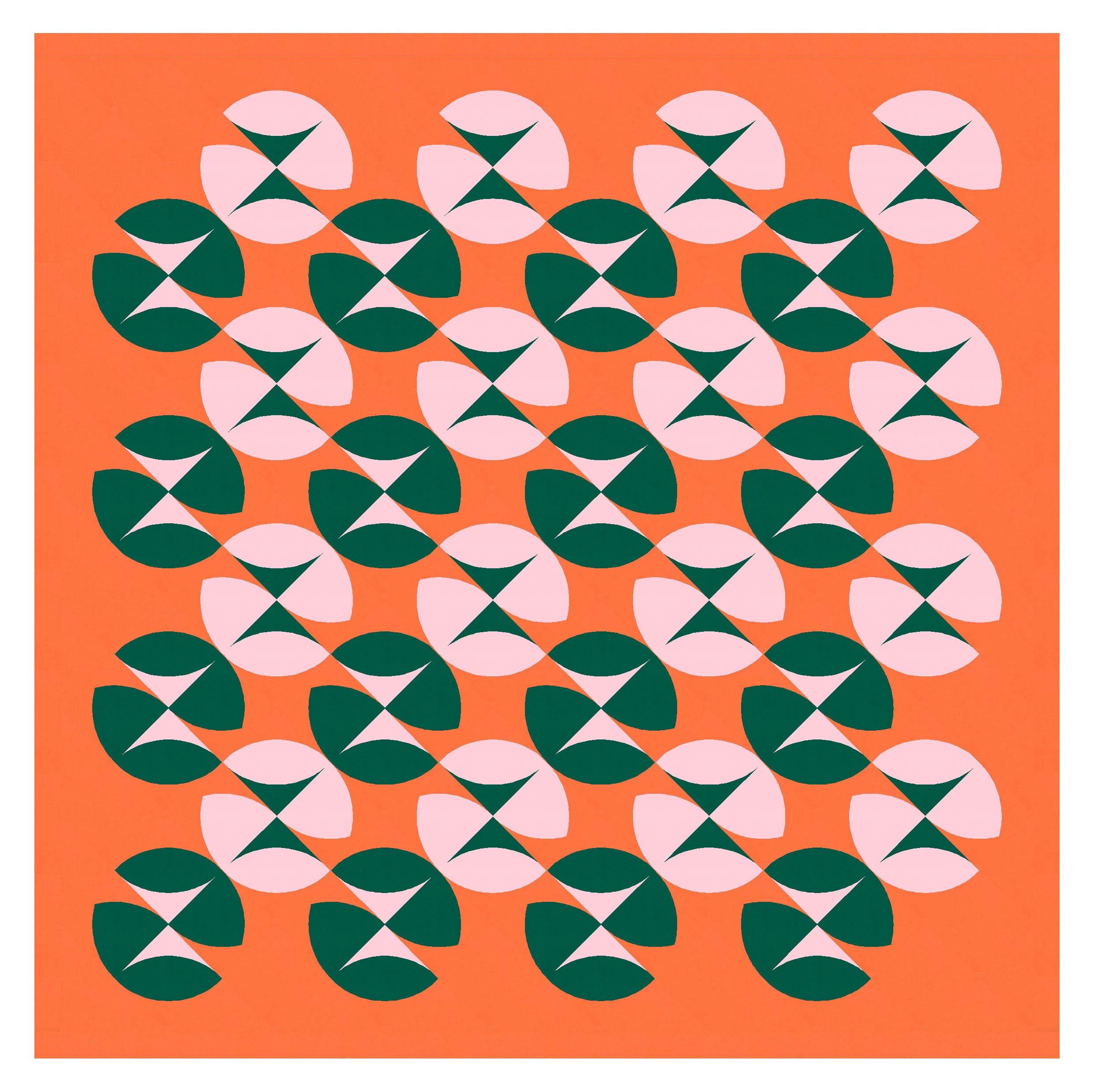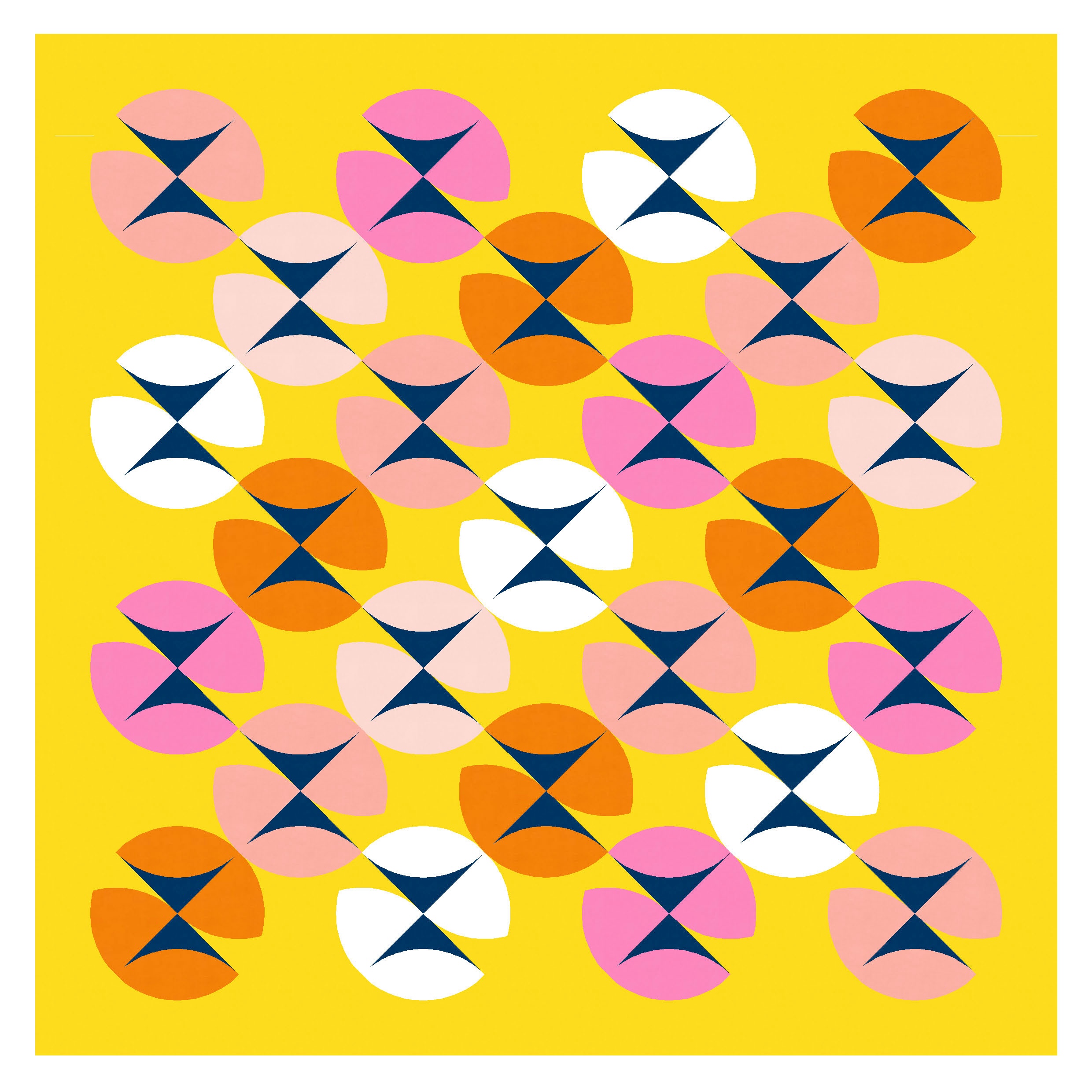 In the next version, I’ve gone back to colouring the inside corners of the orange peels, but using a different colour placement/arrangement. The circles are still there… but again, I feel like other shapes/movement come to the fore: the diagonal lines descending from left to right, and pairs of peels ‘kissing’ at their points (sandwiched between the diagonals). I really like this design too, but it feels quite different from the first version.