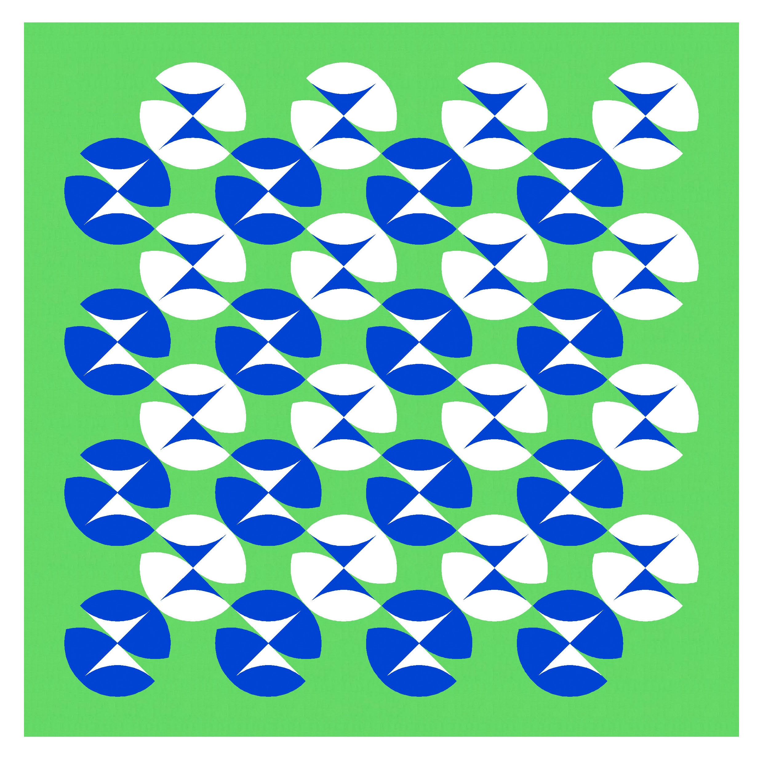 I tried another way of using two colours (plus background colour) in each circle. I like this version too. There’s still lots of movement, but now (for me, at least), the diagonal lines that criss-cross the design really jump out at me.