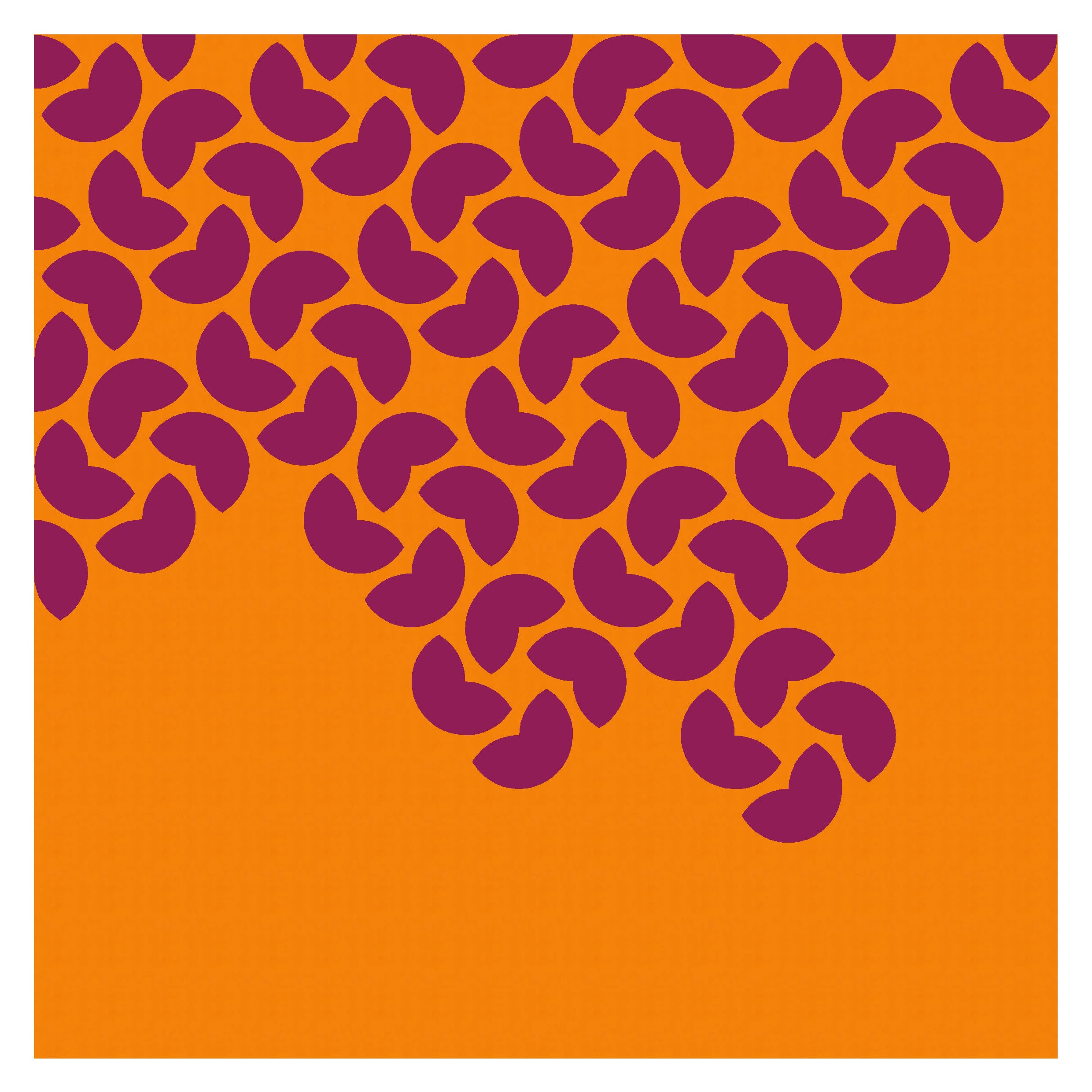 Here are some three-colour versions: the first one uses the same colour placement for each bean, but changes their direction. The others alternate both the colouring and the direction. In those others, the peel from one bean makes a hidden circle with the rest of the adjacent bean. Can you see them? They feel more obvious to me in the version with the orange background: overlapping pink and blue circles, interrupted by a criss-cross of orange lacework.