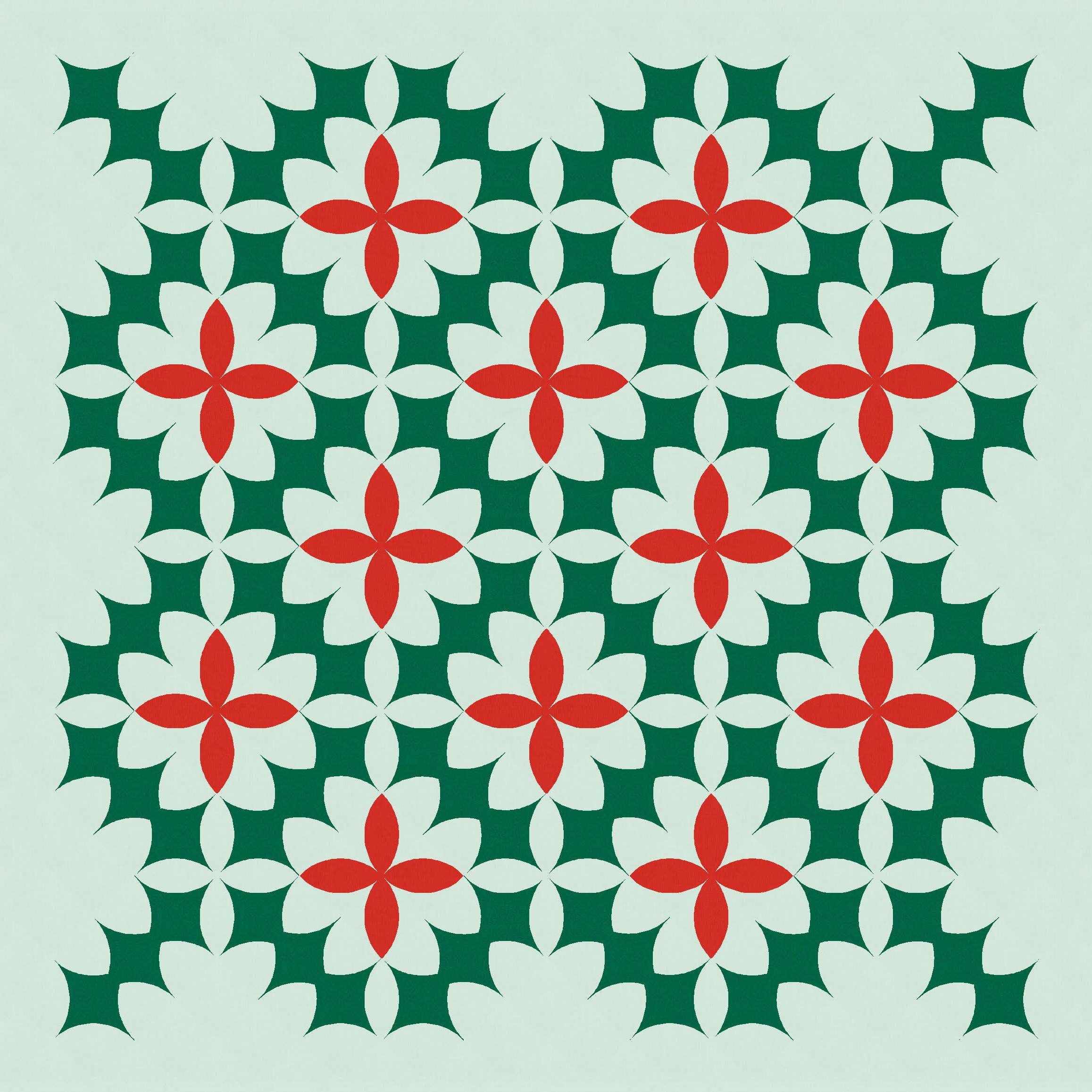 In the version above with the red background, suddenly those shapes between the holly jump out at me. There are four in the middle of the design – can you see them? They’re like an outline of a four-leaf clover, maybe. I’ll come back to that shape in a bit.