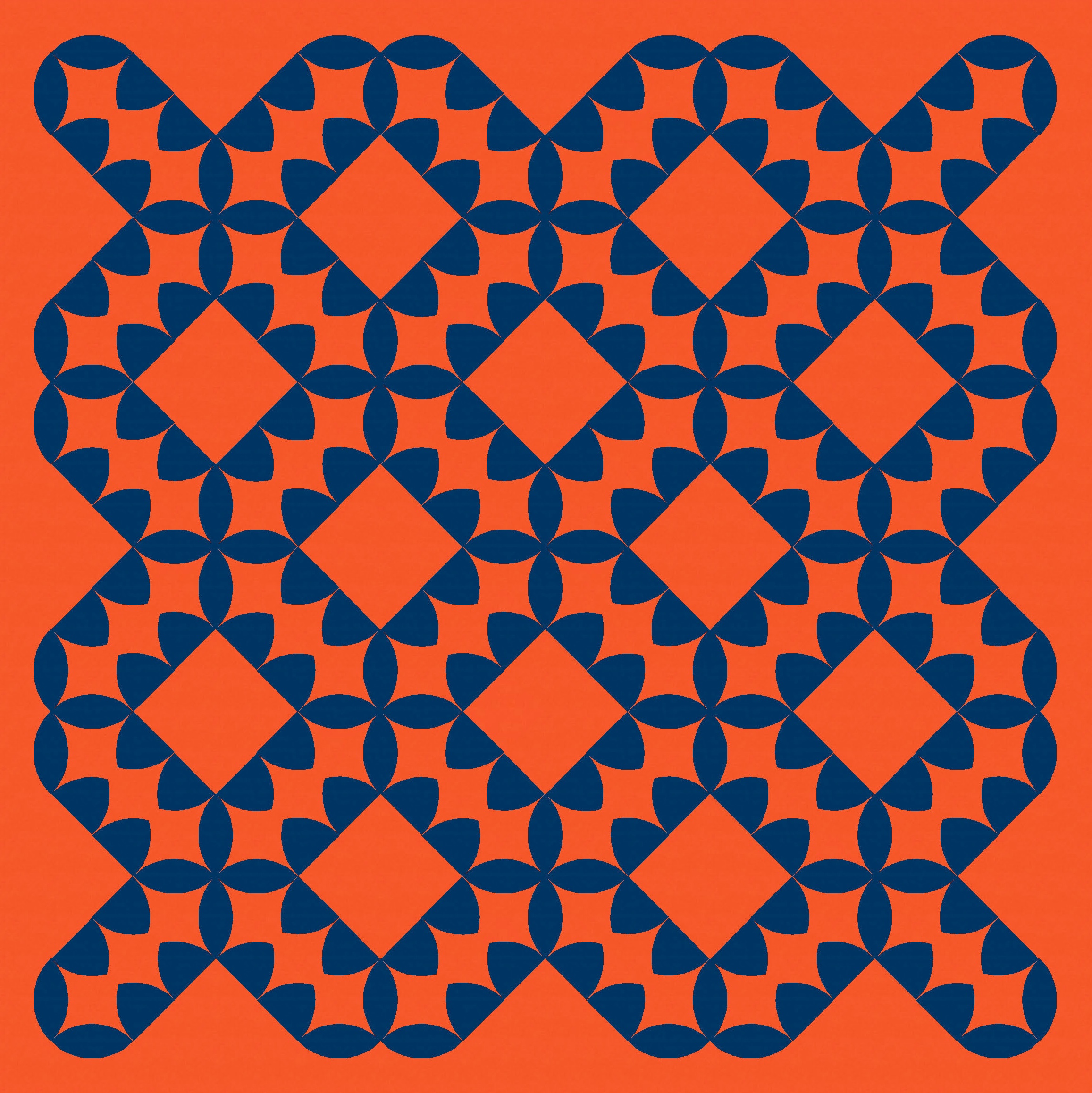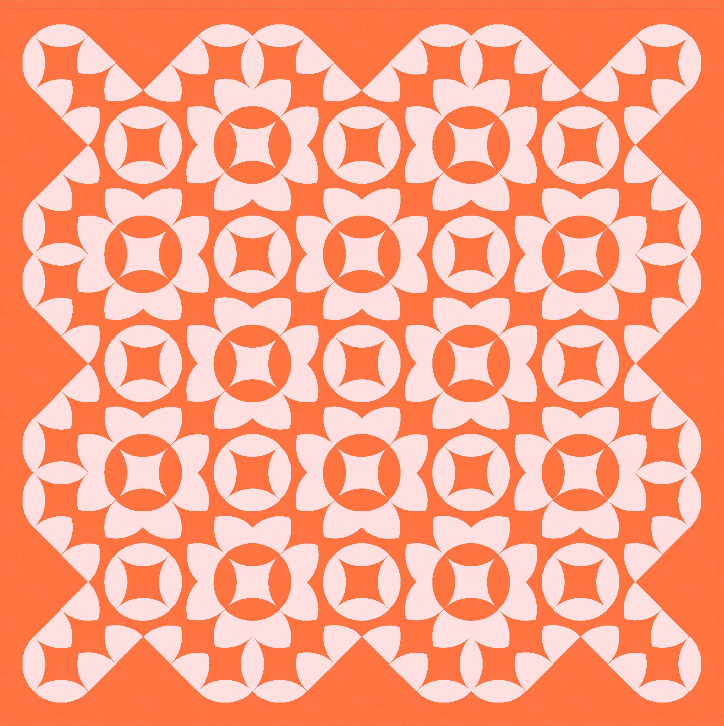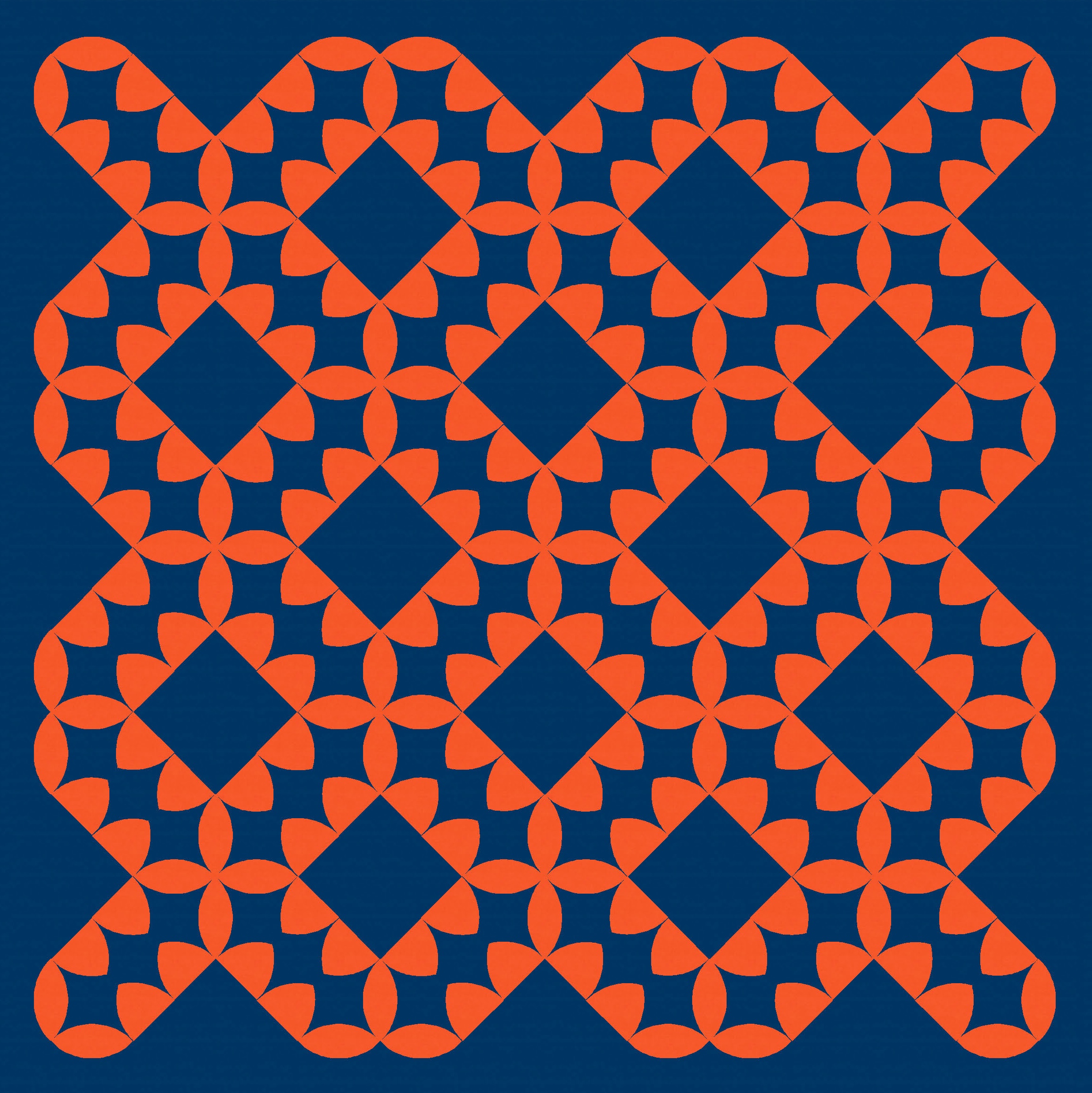 Now, there are two areas within these designs where orange peels meet: at the junction between 4 elongated ovals (where the peels overlap as a cross shape), and in the spaces where those squares were in the original blocks (where I arranged the peels first as a cross and then as a circle). Originally all the peels formed crosses; how about if I rotate them so they all form circles instead?
