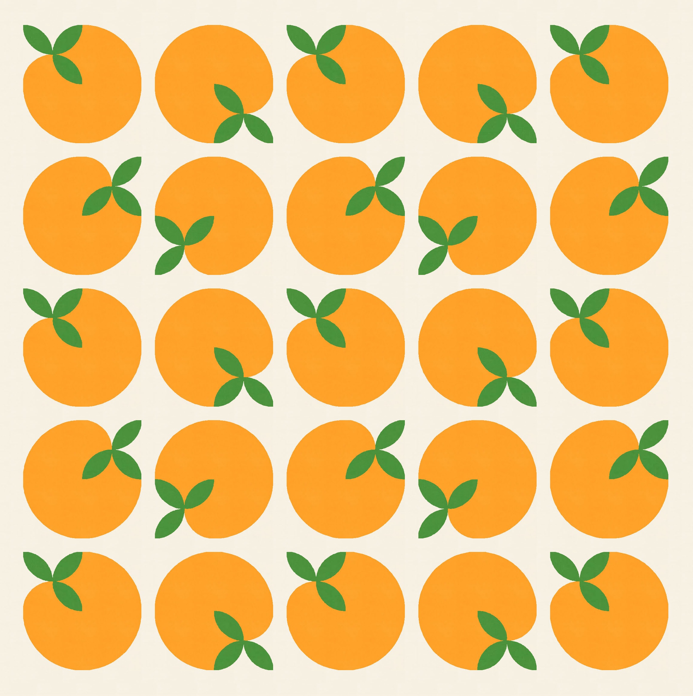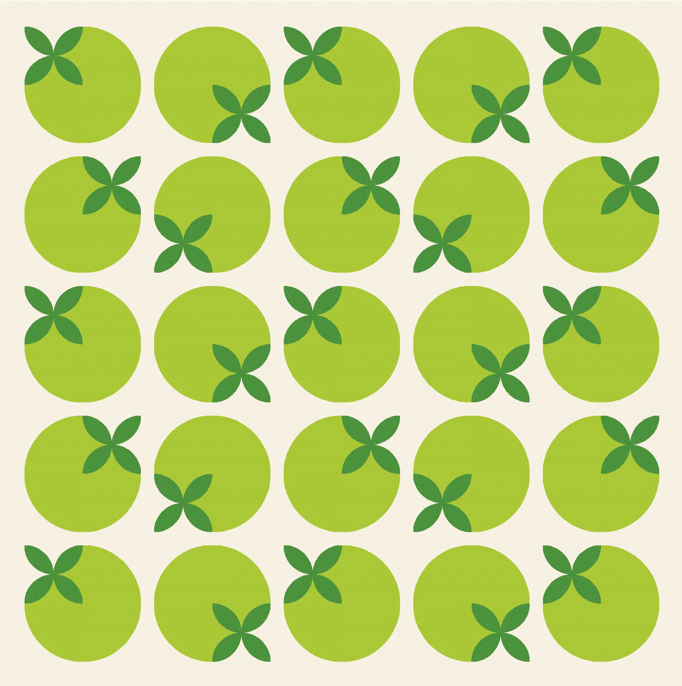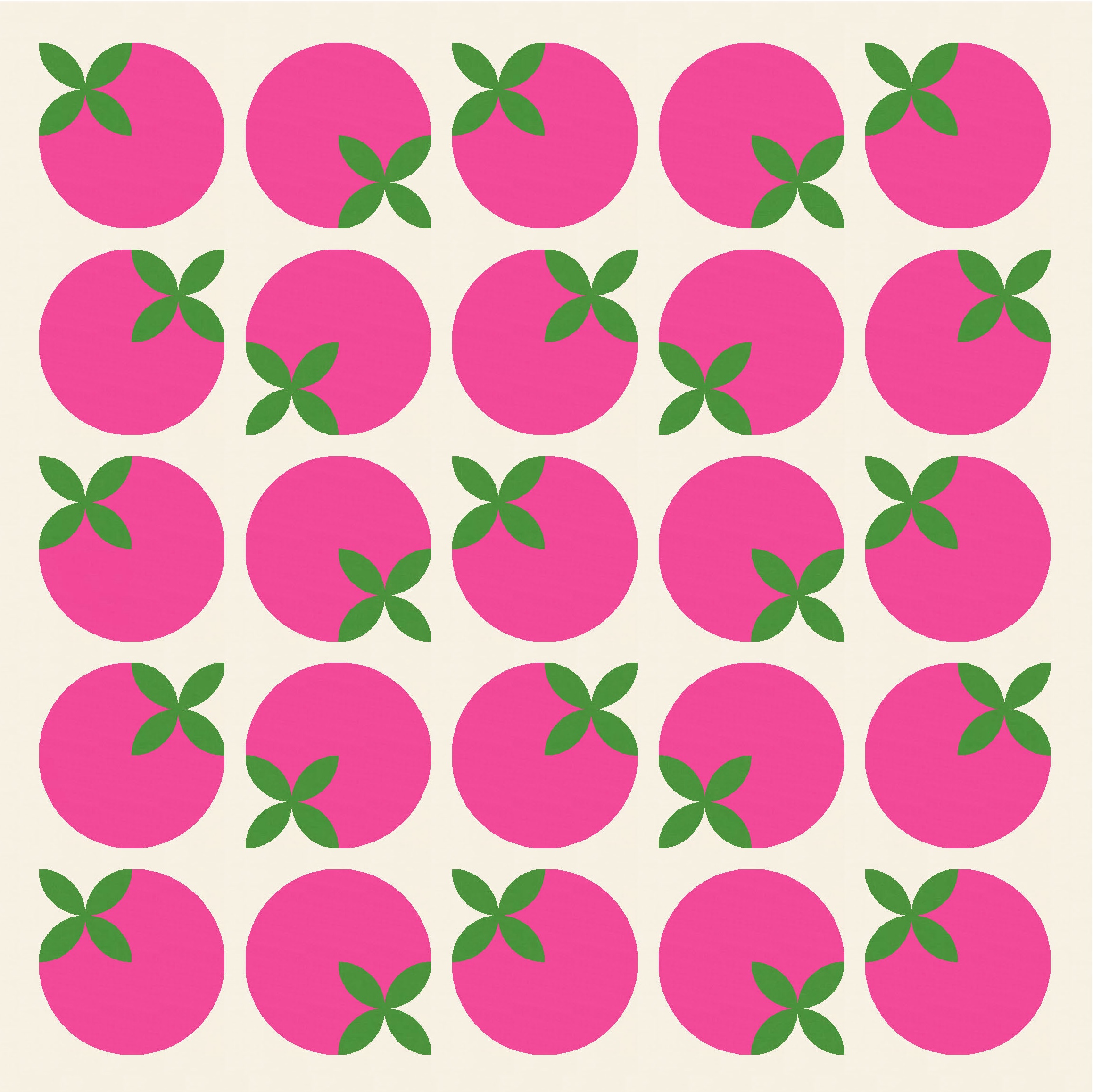 These designs use large quarter-circles and smaller orange peels to create a round fruit-like shape. The slight difference in the curve circumference between the quarter-circles and the orange peels creates a sort of dent in the middle, like the one that fruits have where they join the stem. I’ve changed up how many leaves (or orange peel units) they have, but it’s all a bit made up. I think the shape is evocative enough without getting too technical about the details!