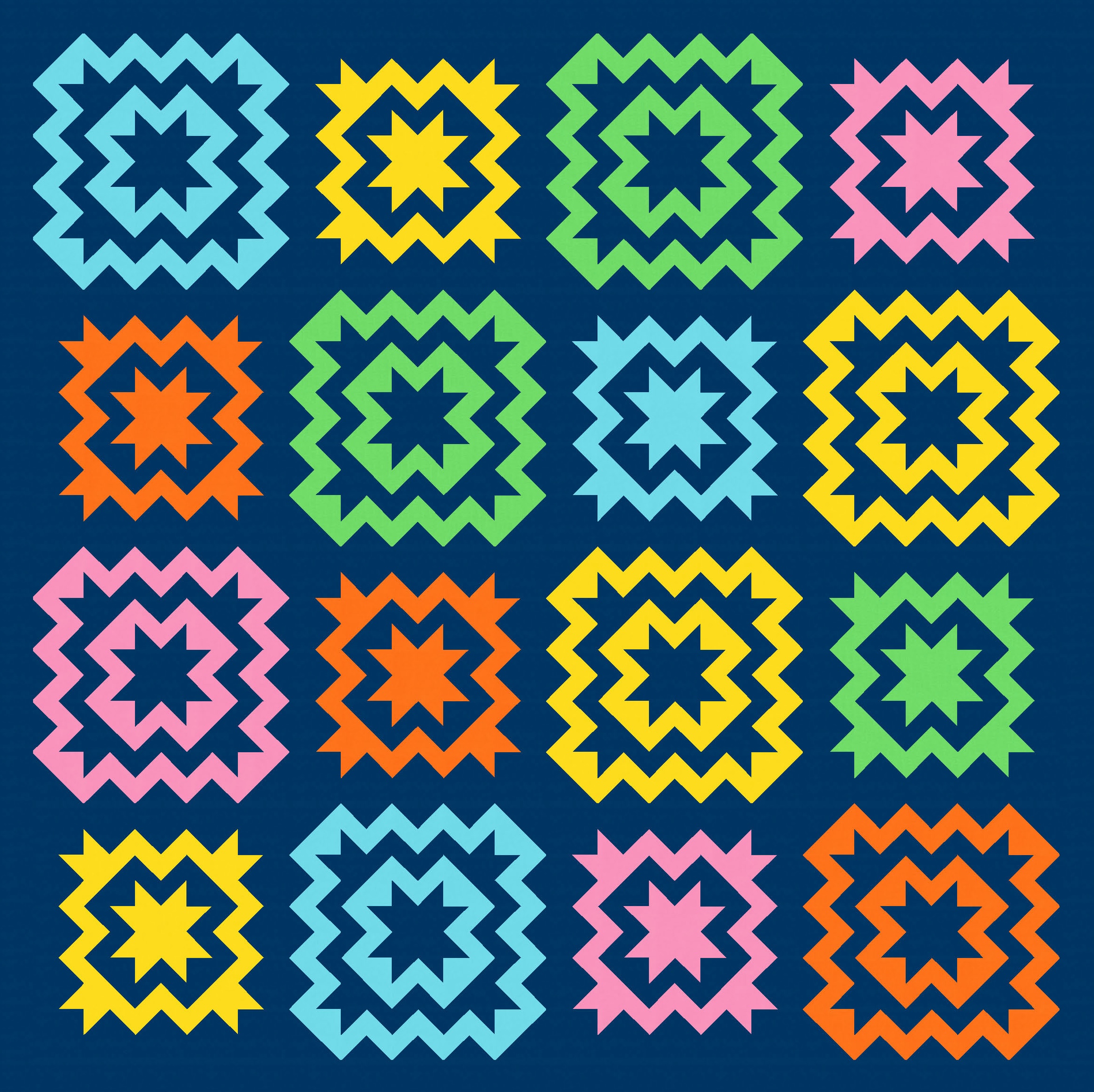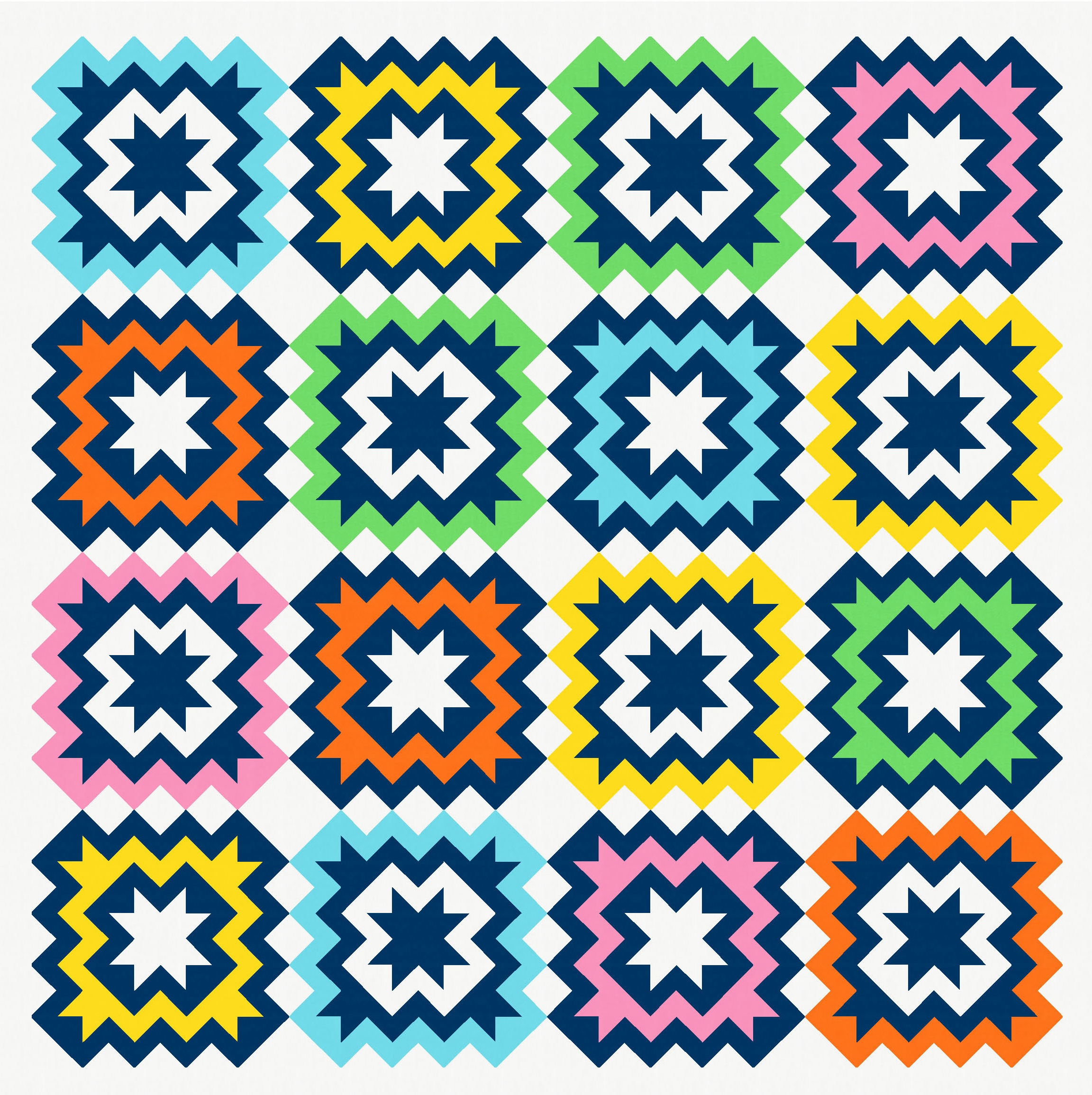 A bit of fun with sawtooth stars this week, surrounding them in layers of colour that end up looking like little explosions.