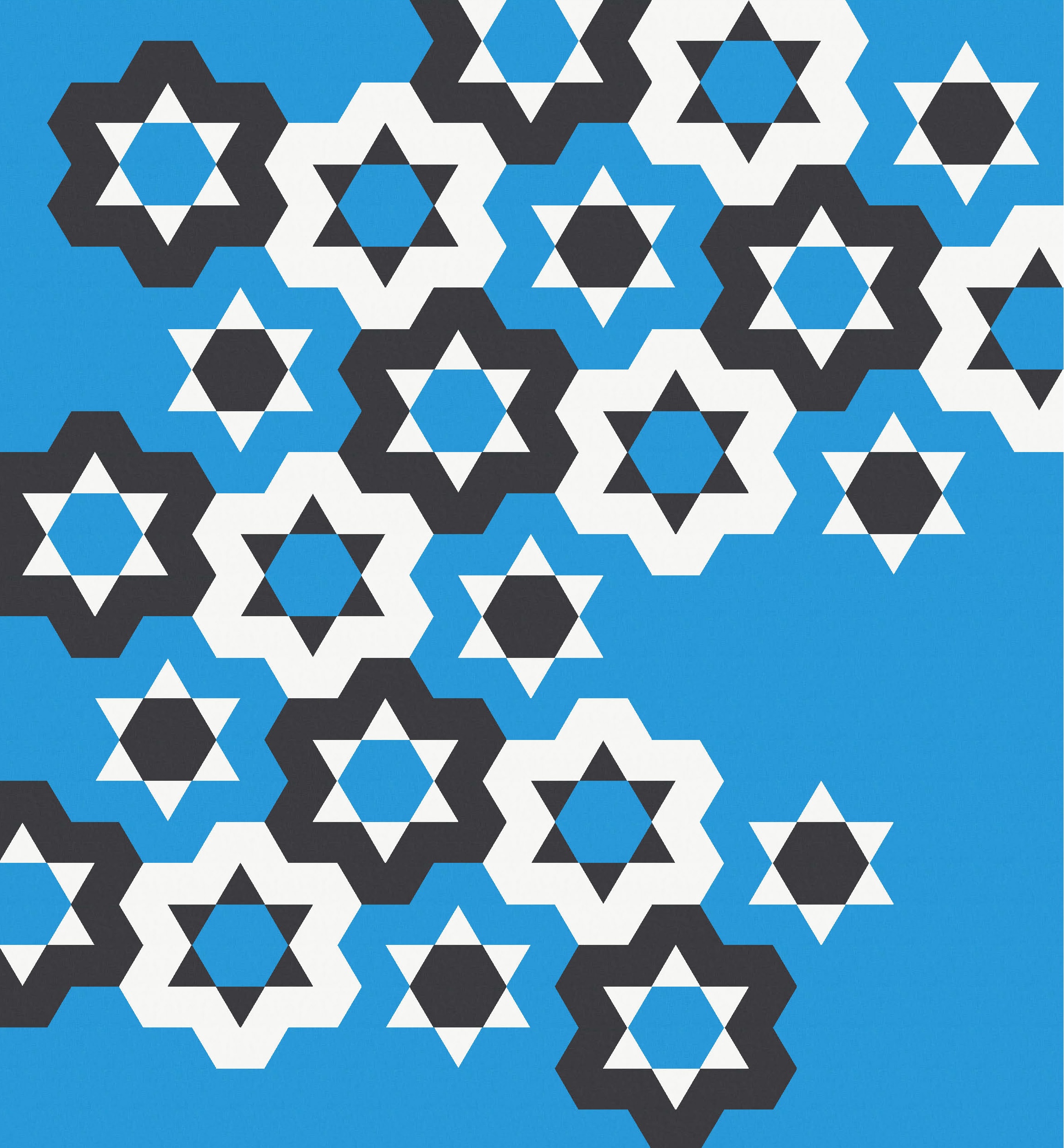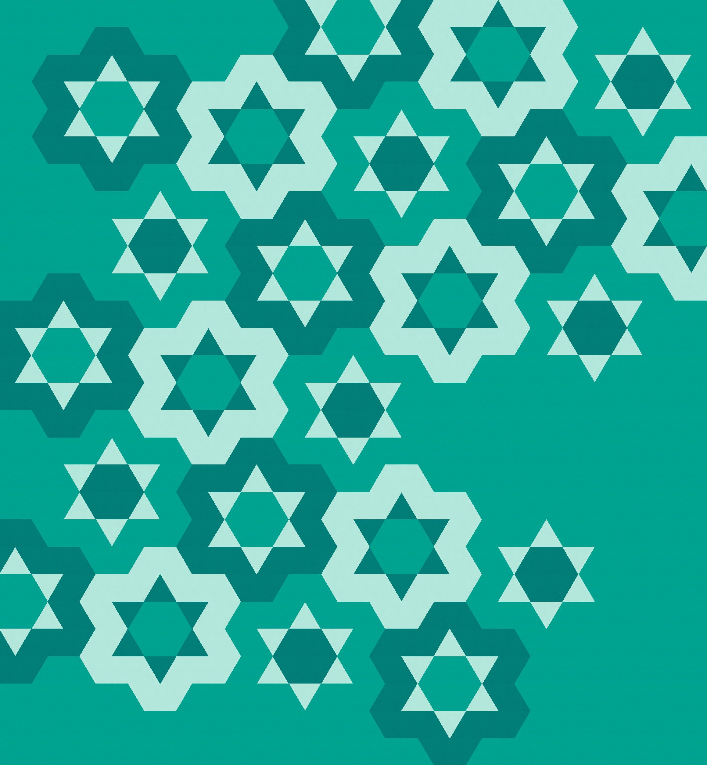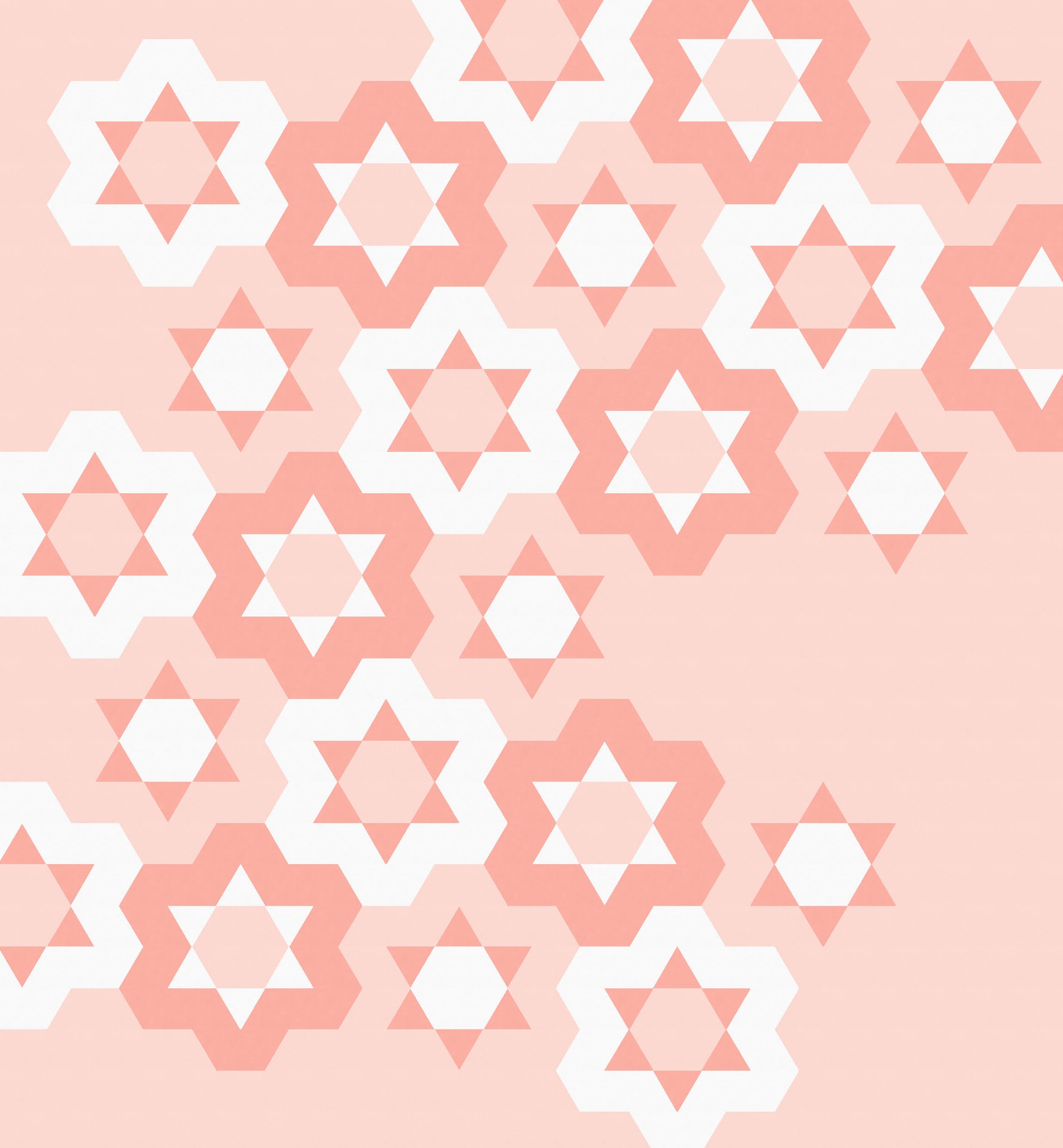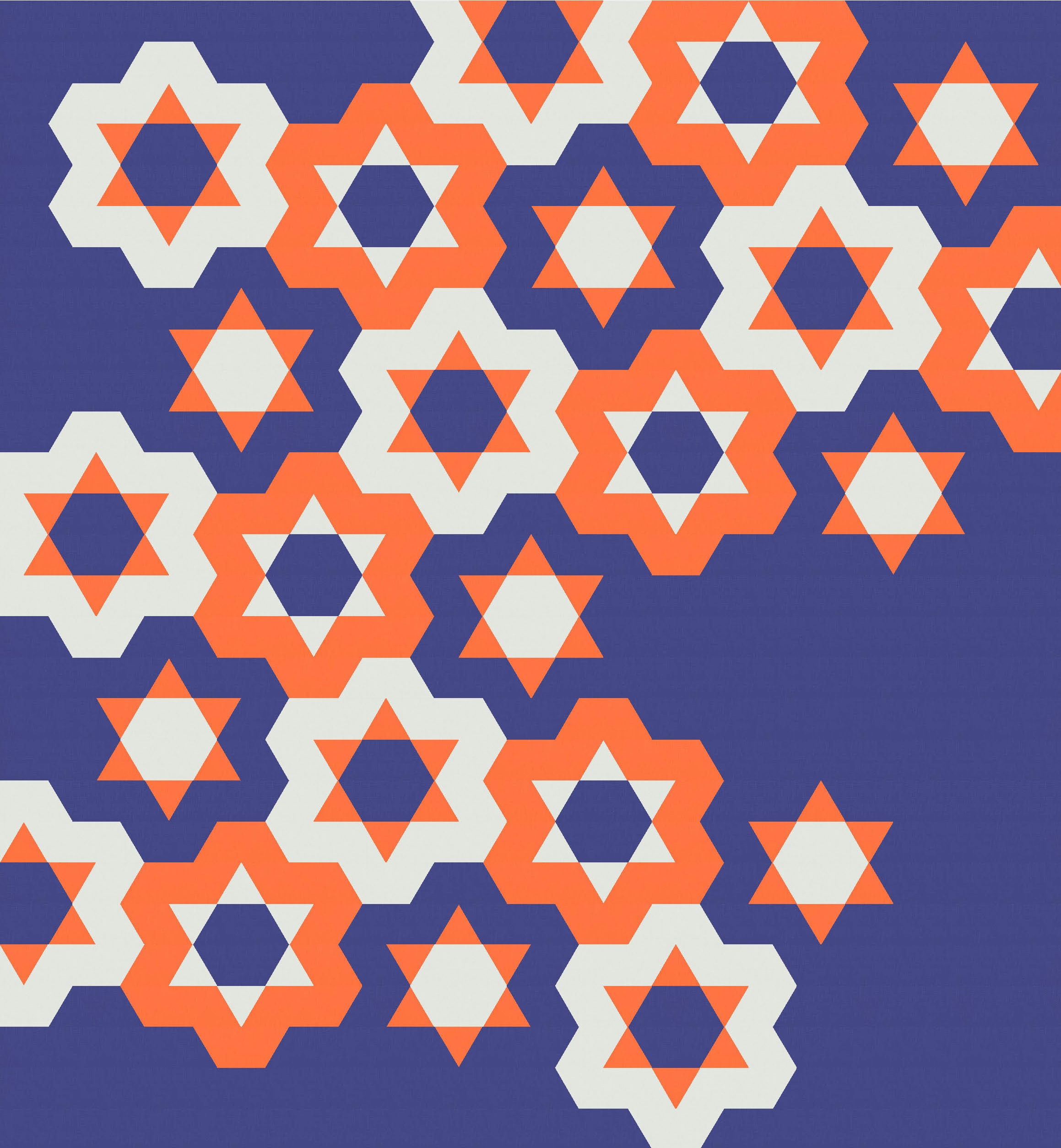 Because each larger shape that encloses a six-pointed star touches six others, I needed a palette of at least three colours (otherwise adjacent shapes would meld into each other). Rather than filling the full ‘canvas’ with these larger shapes, I decided to leave some empty spots. As the background colour is one of the three colours, some of the stars look like they’re just floating in space amongst larger shapes – but really, they’ve got their own chunky borders as well, you just can’t see them 🙂 If I changed the background colour, it would change which stars appear to float.