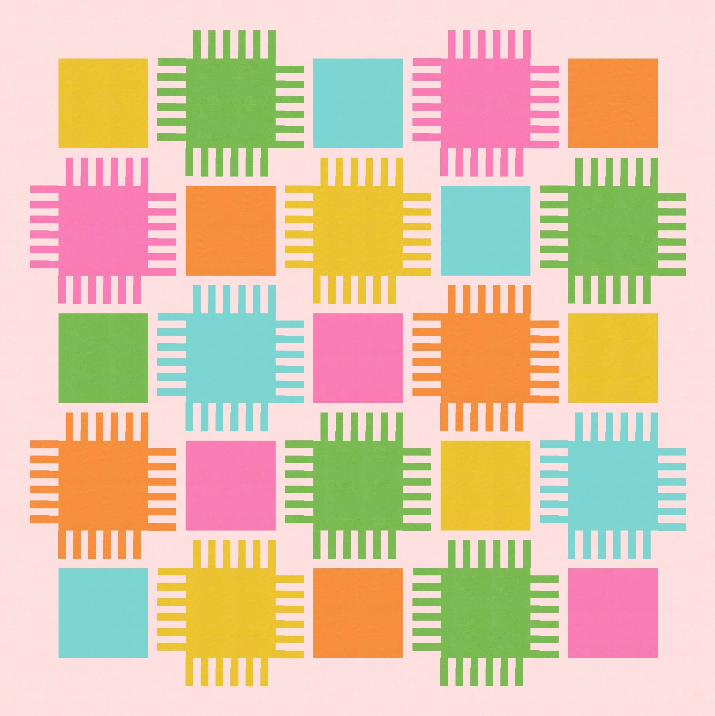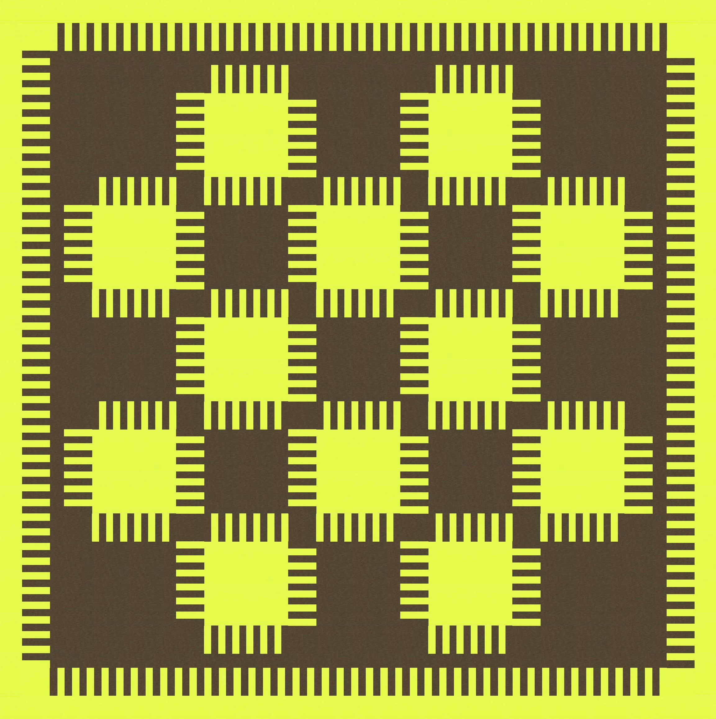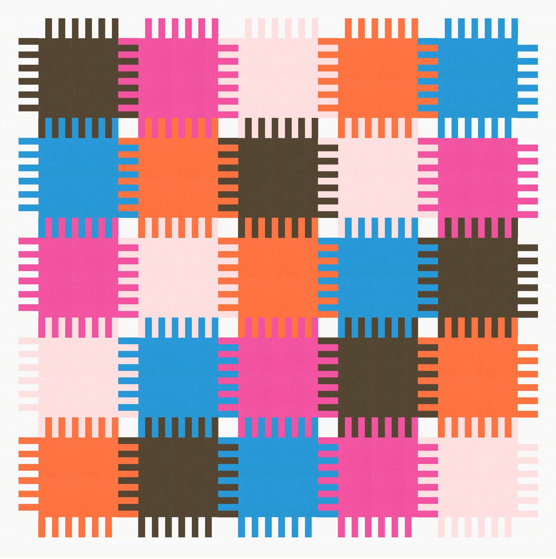 I also played around with how the bristles on adjacent blocks interact: do they interlock fully or only partially? I tried fully interlocking first, which reveals the background colour only at the corners of the blocks.