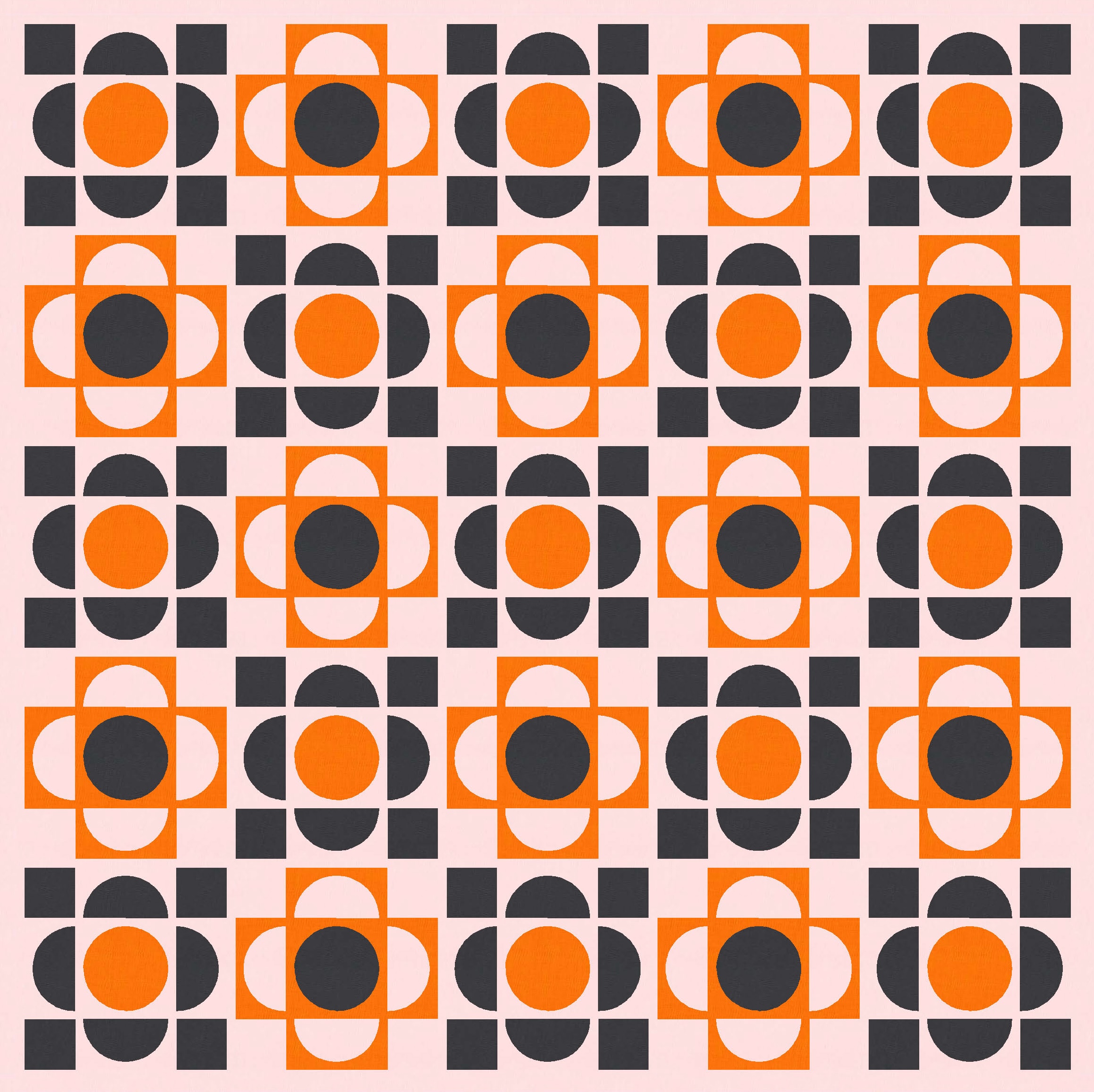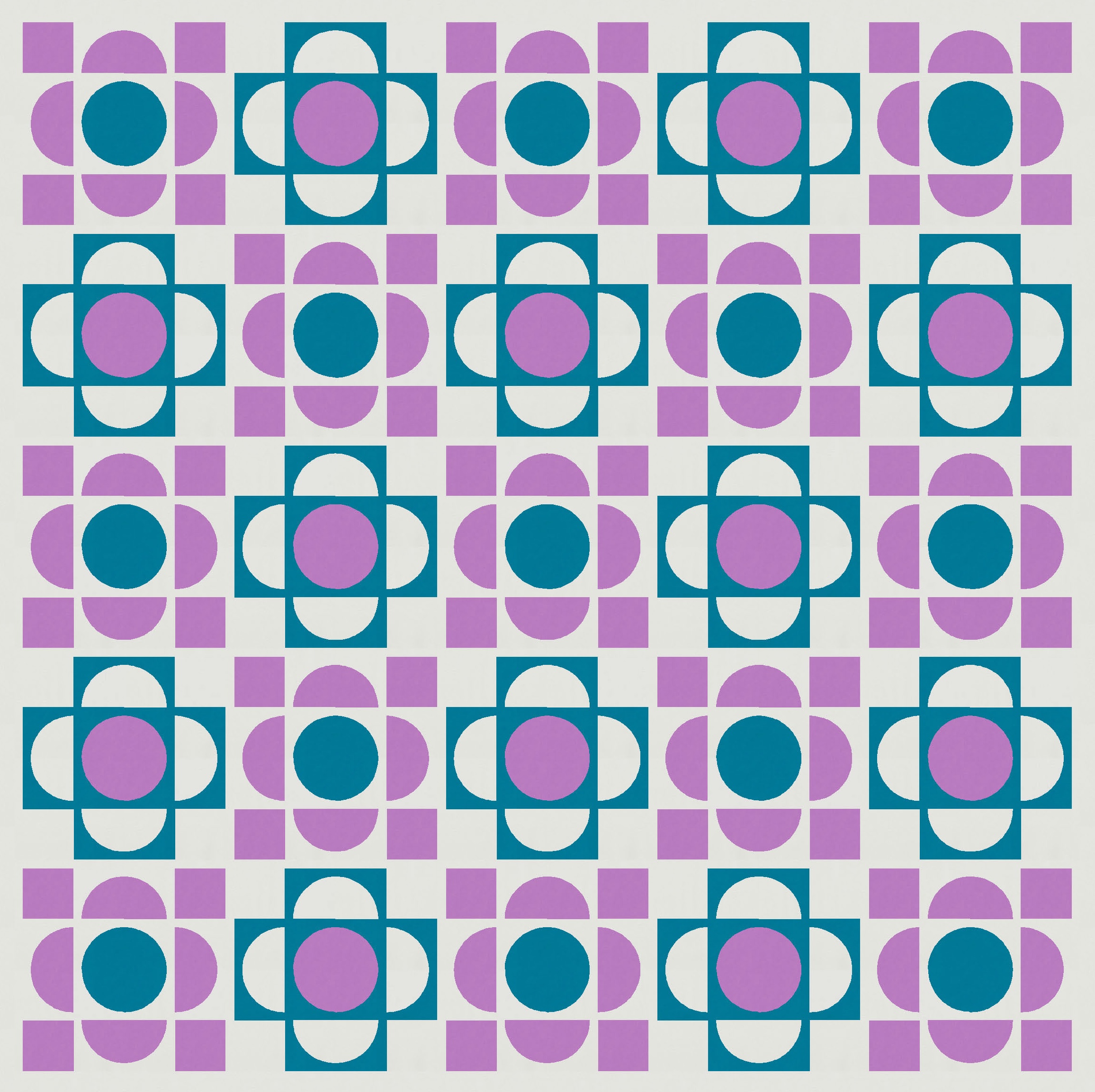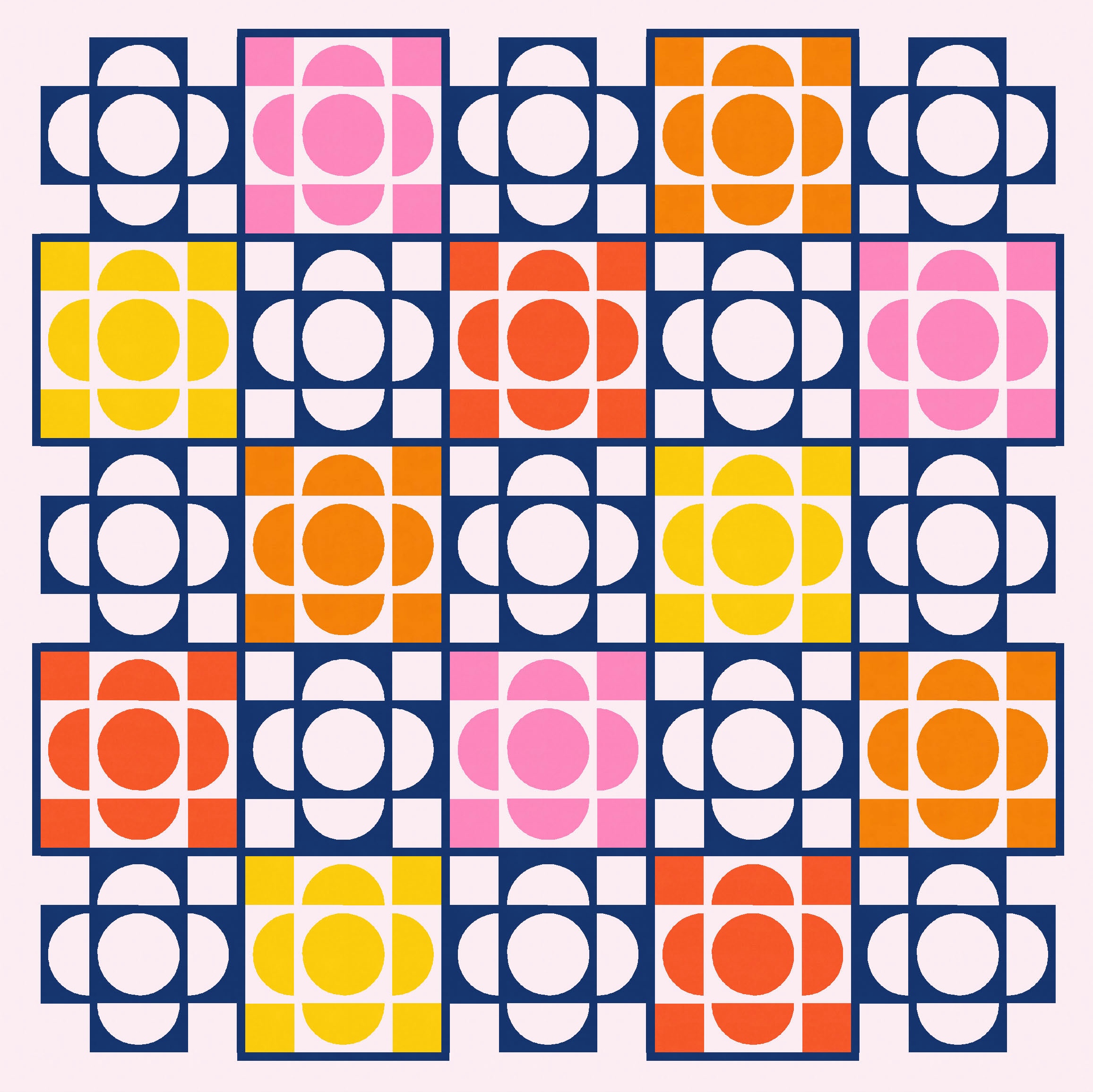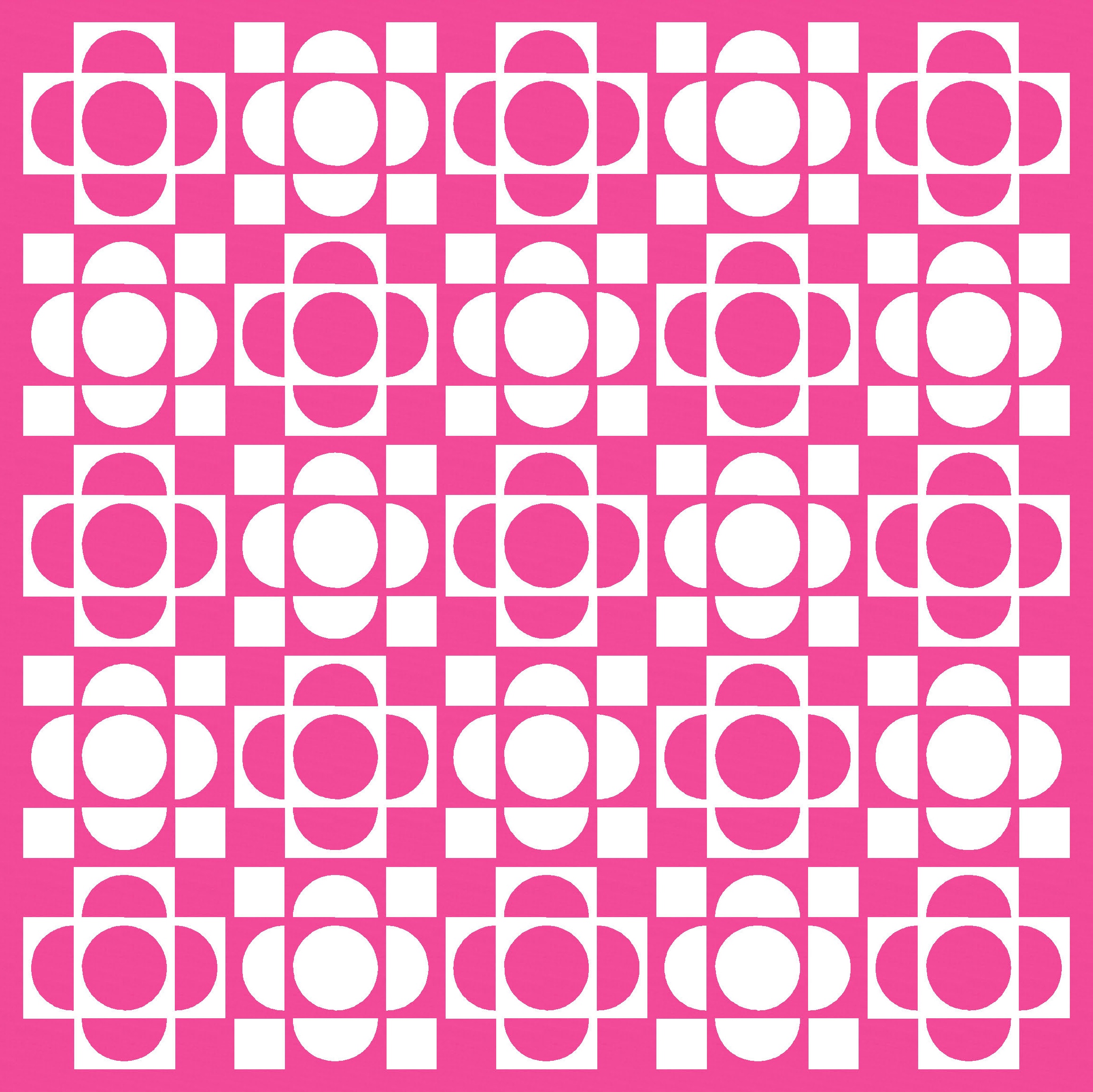 Depending on how you count them, the blocks have up to 5 different elements: the corner squares, the concave part of the half-circles, the convex part, the full circle in the middle, and its square border. So, lots of ways these blocks could be coloured. I stepped up to a three-colour palette next.