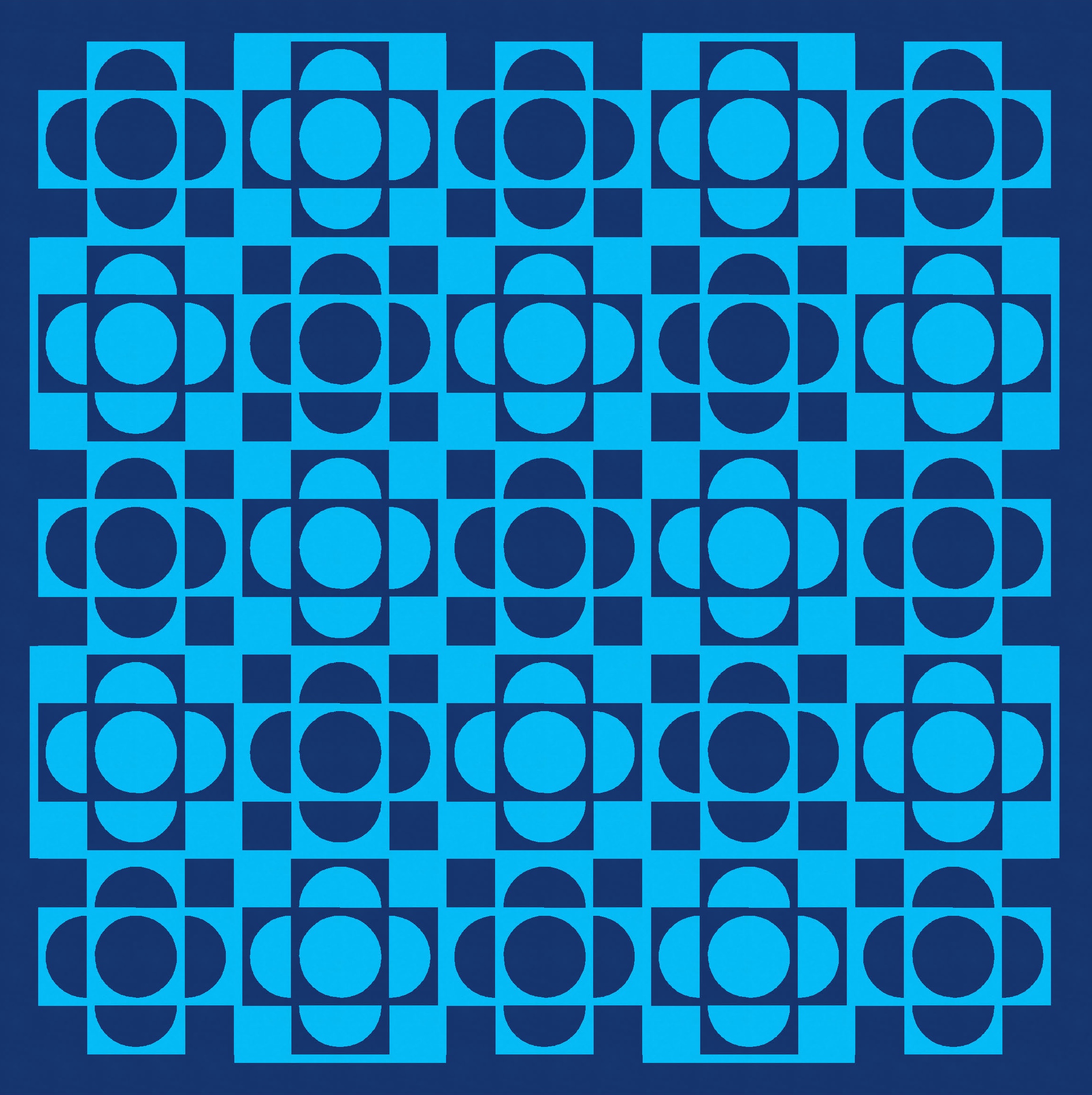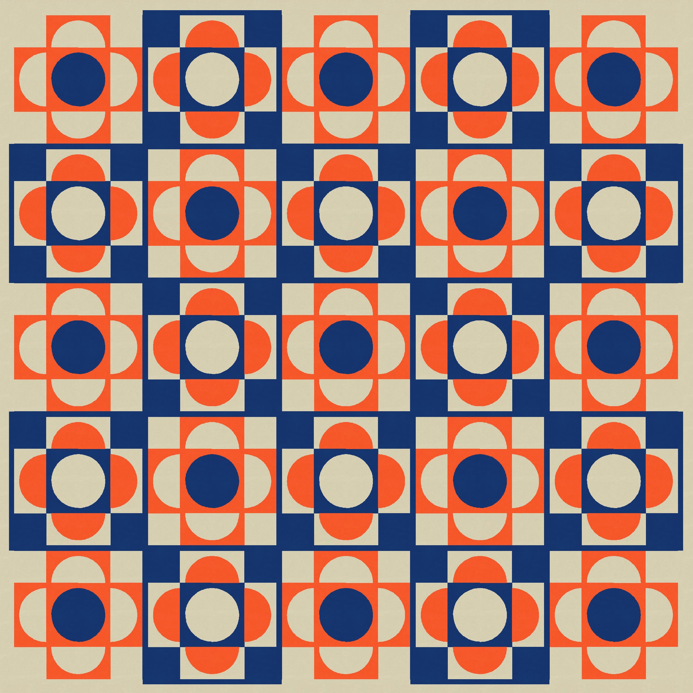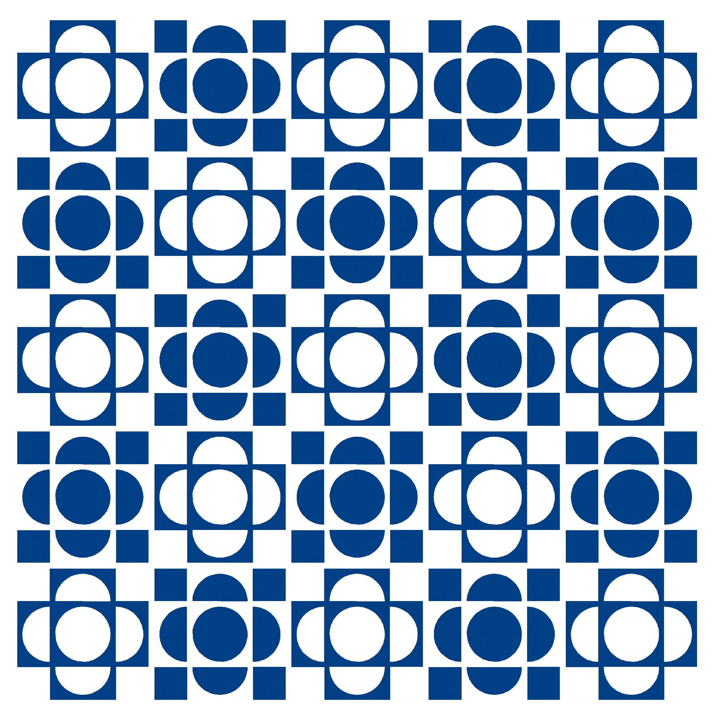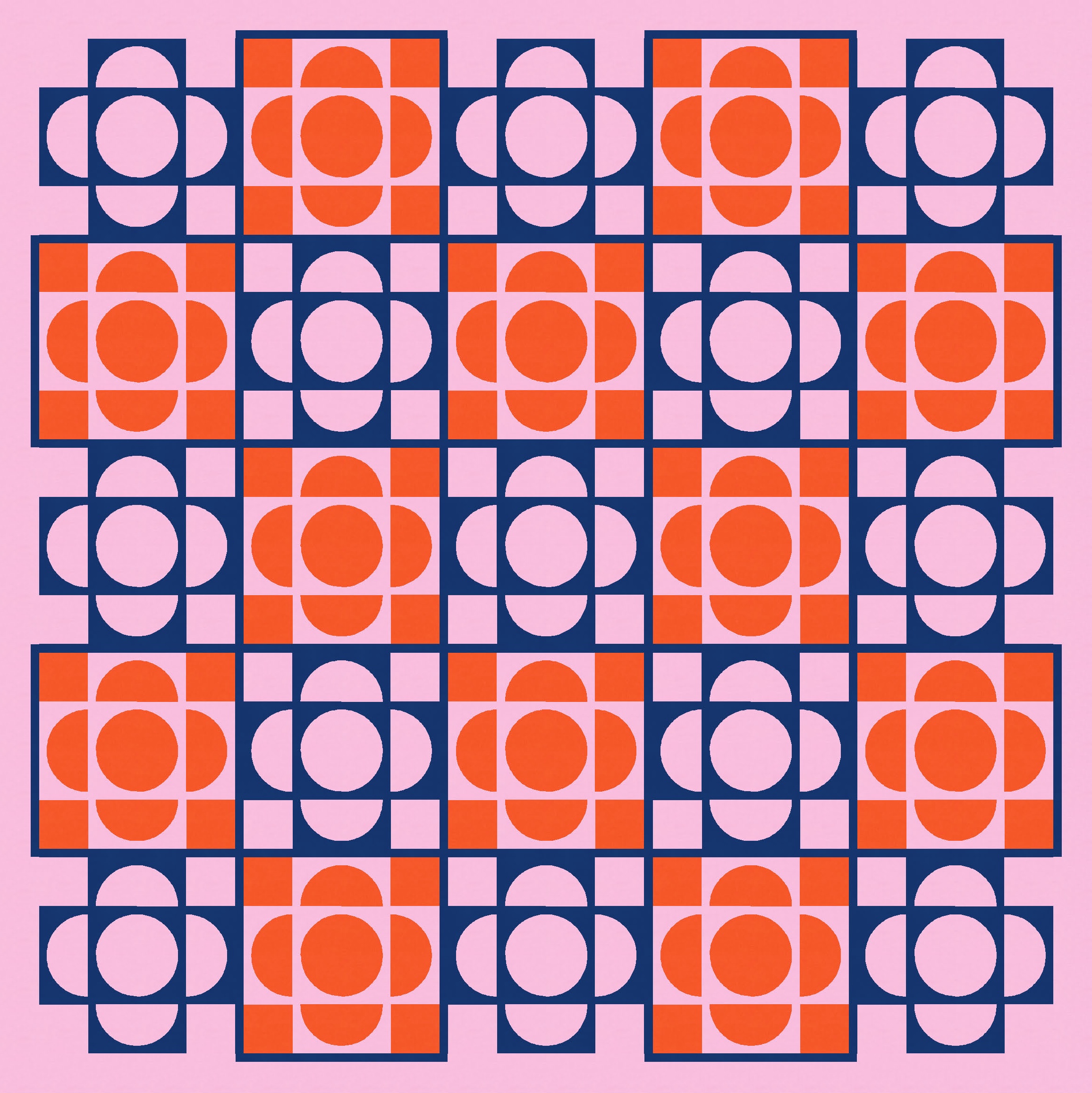 Depending on how you count them, the blocks have up to 5 different elements: the corner squares, the concave part of the half-circles, the convex part, the full circle in the middle, and its square border. So, lots of ways these blocks could be coloured. I stepped up to a three-colour palette next.