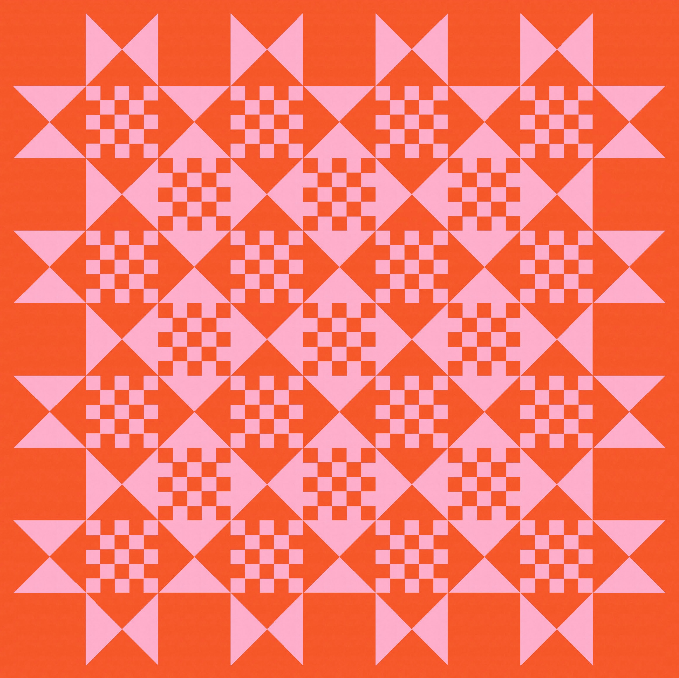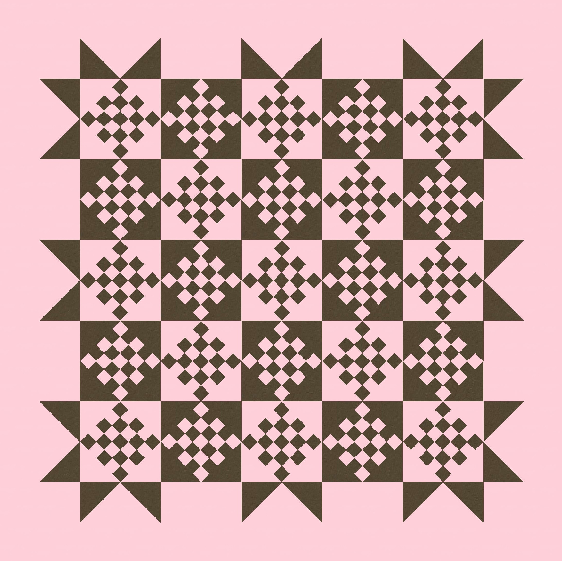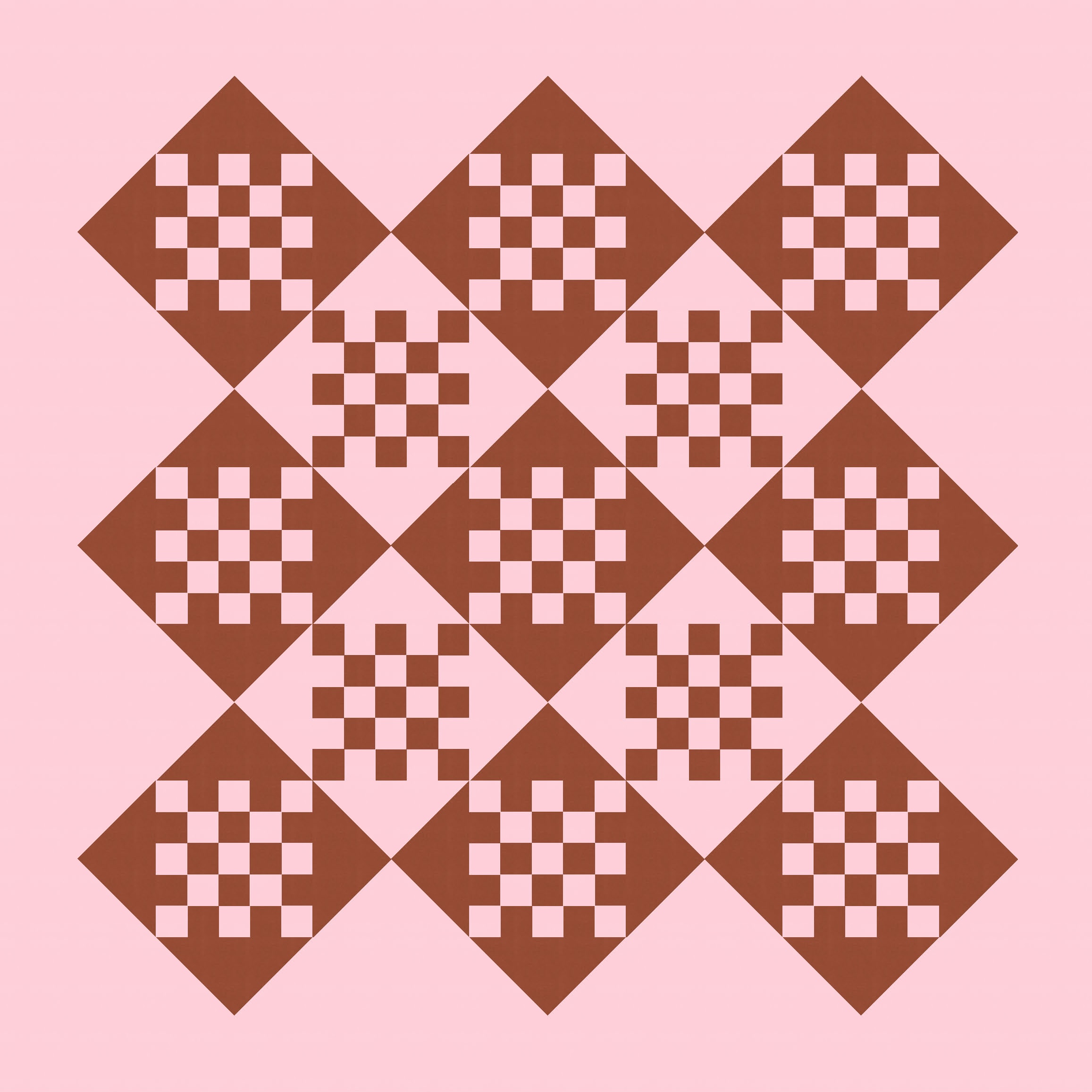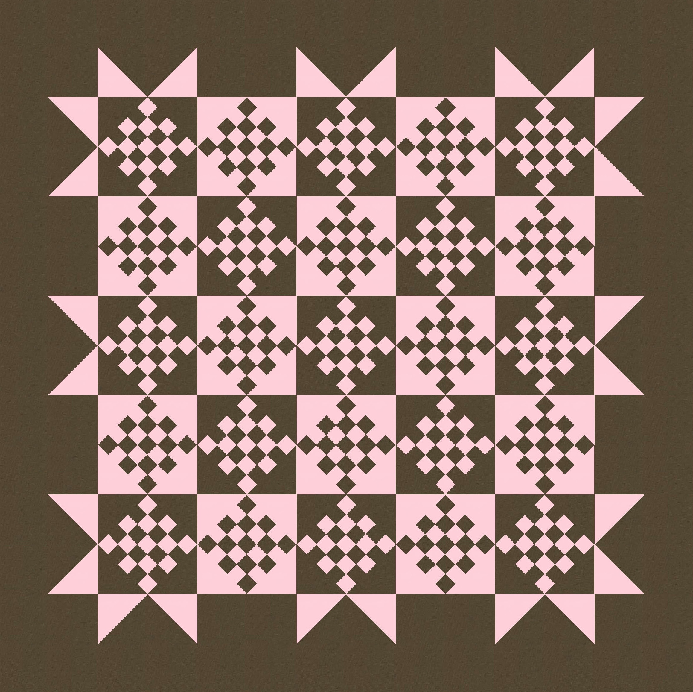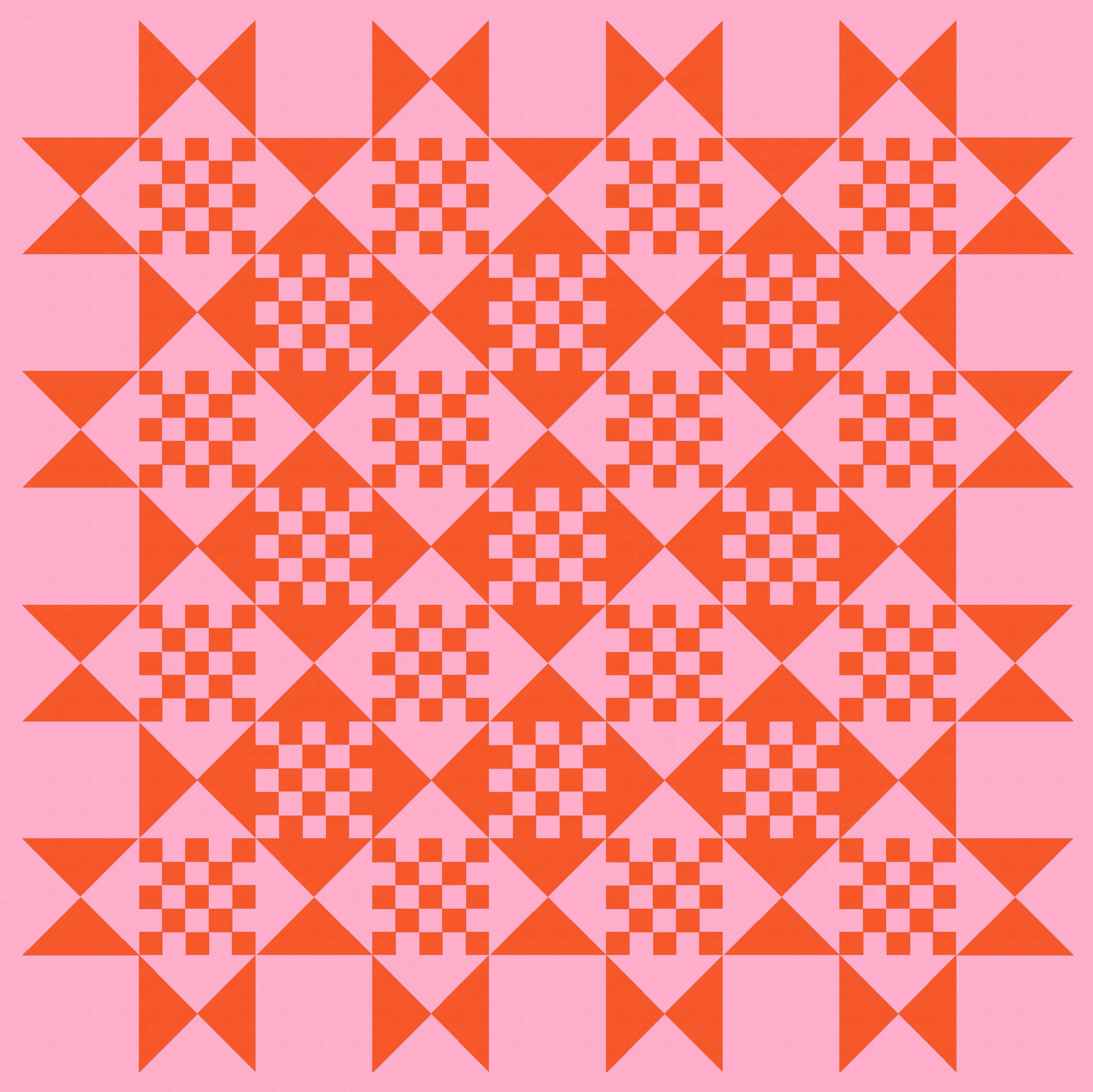 I switch back and forth between preferring this version and opting instead for its on-point equivalent. The standard layout would be slightly easier to make because it wouldn’t require the setting or corner triangles that on-point layouts require. But otherwise they’d both / all be easy to make into actual quilts. You’d just need to make checkerboard blocks (squares, squares and more squares, but you could save yourself lots of time by making strip sets and sub-cutting), quarter-square triangle units, and a few solid squares.