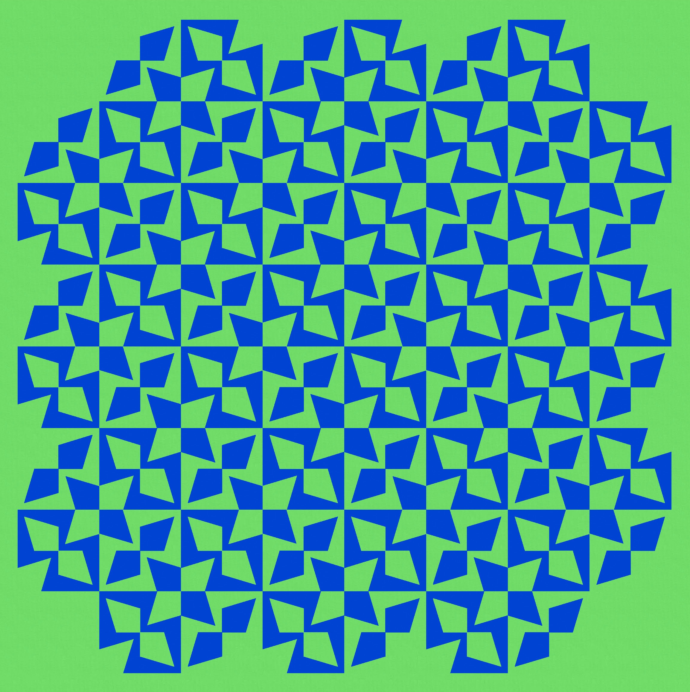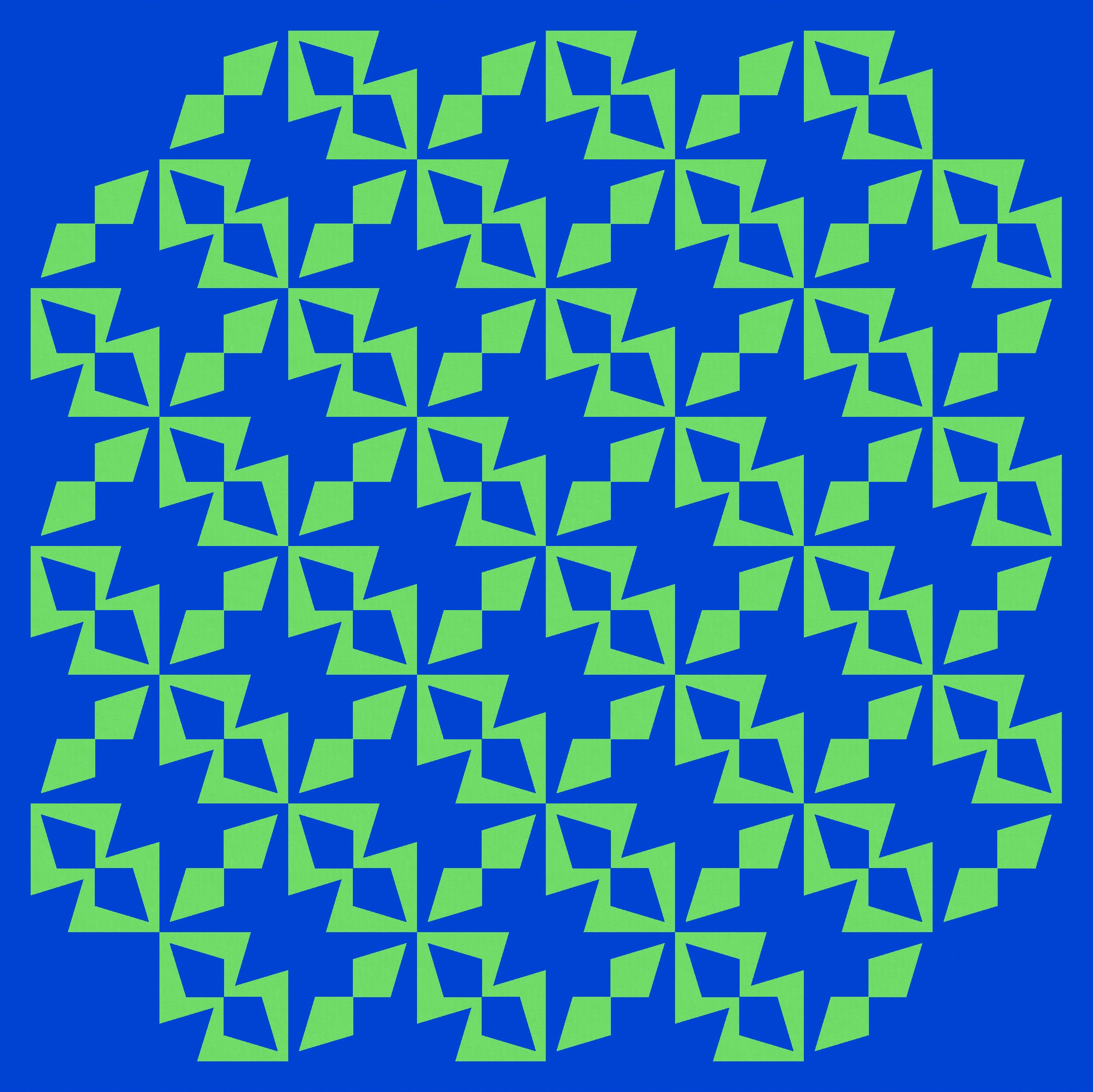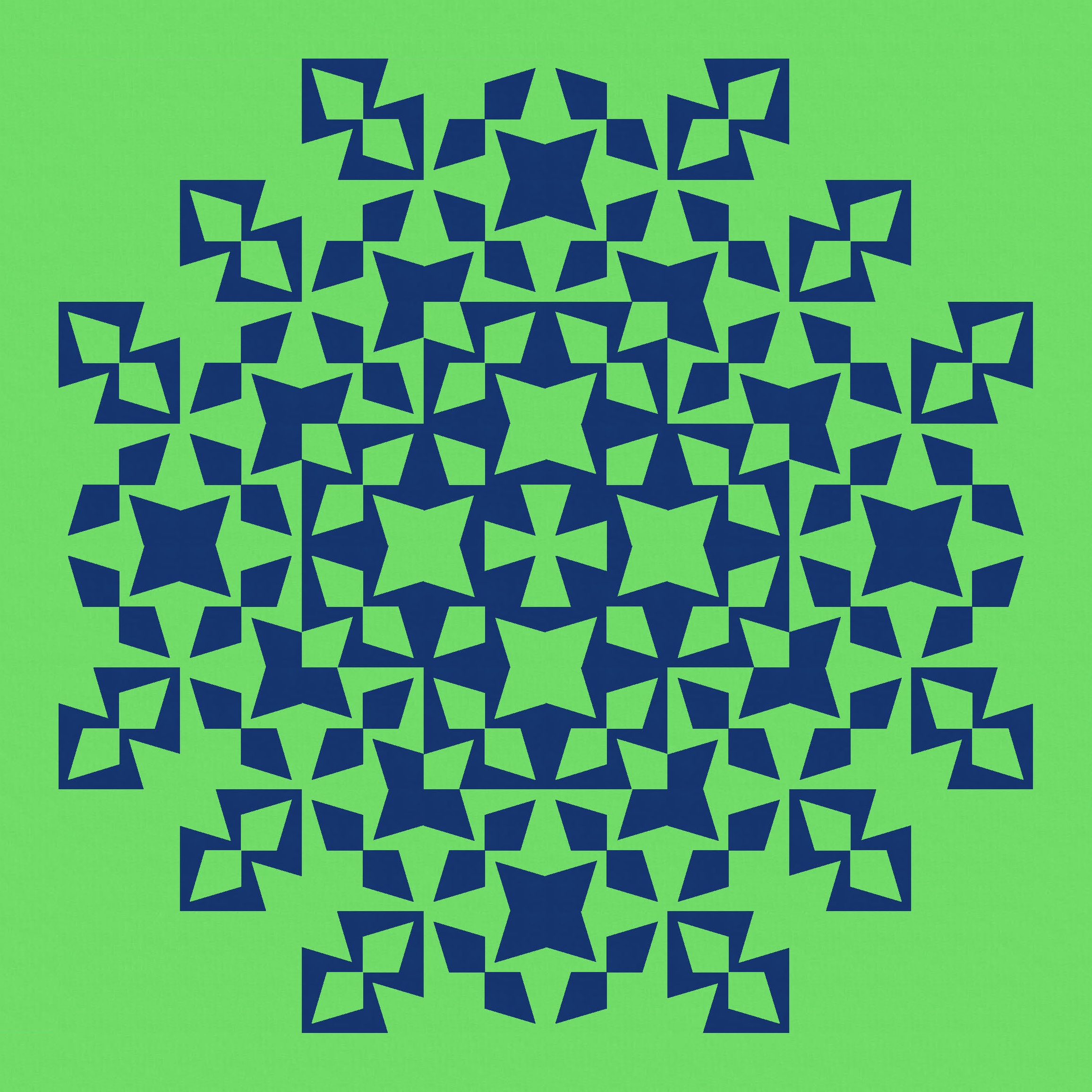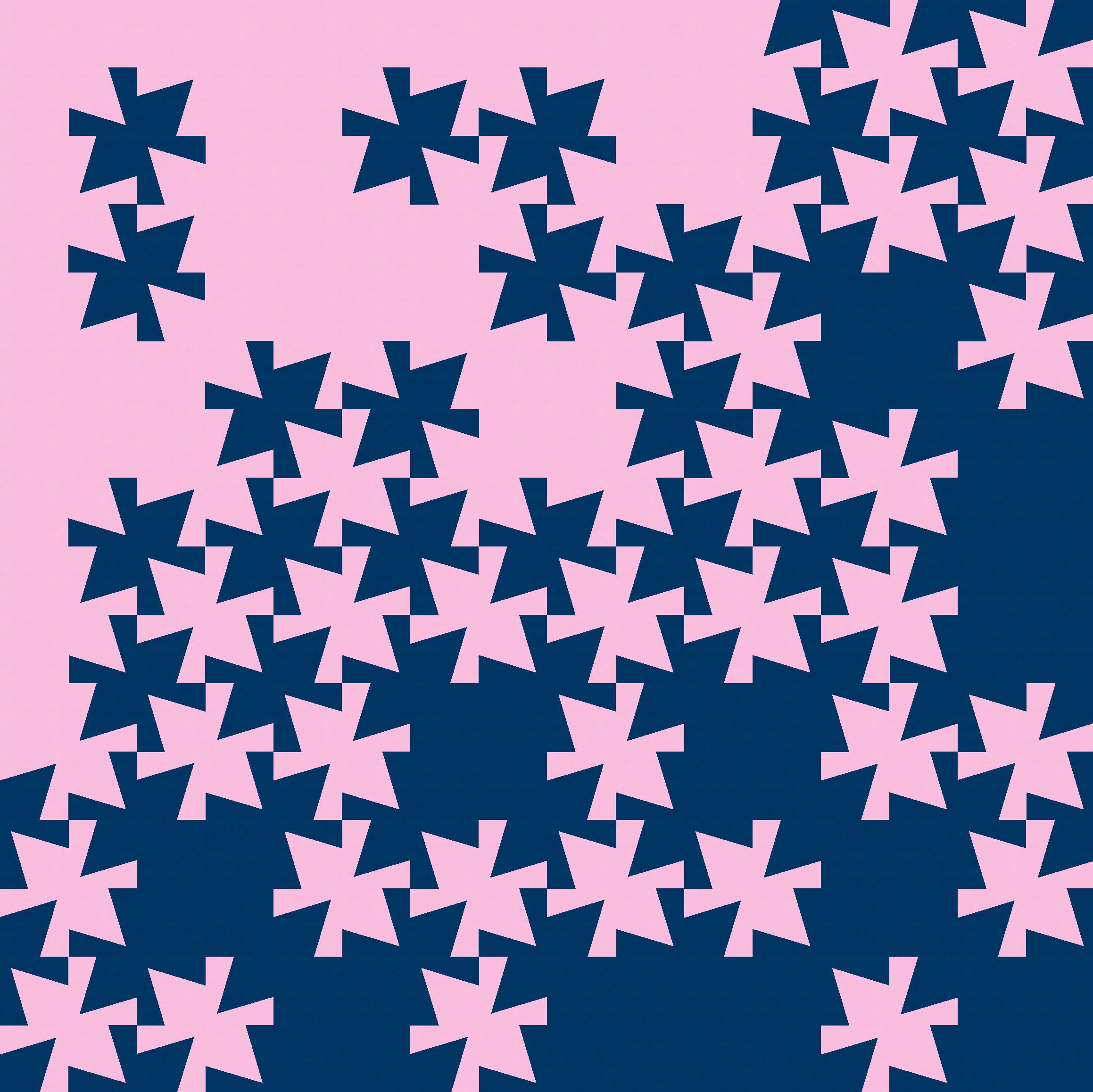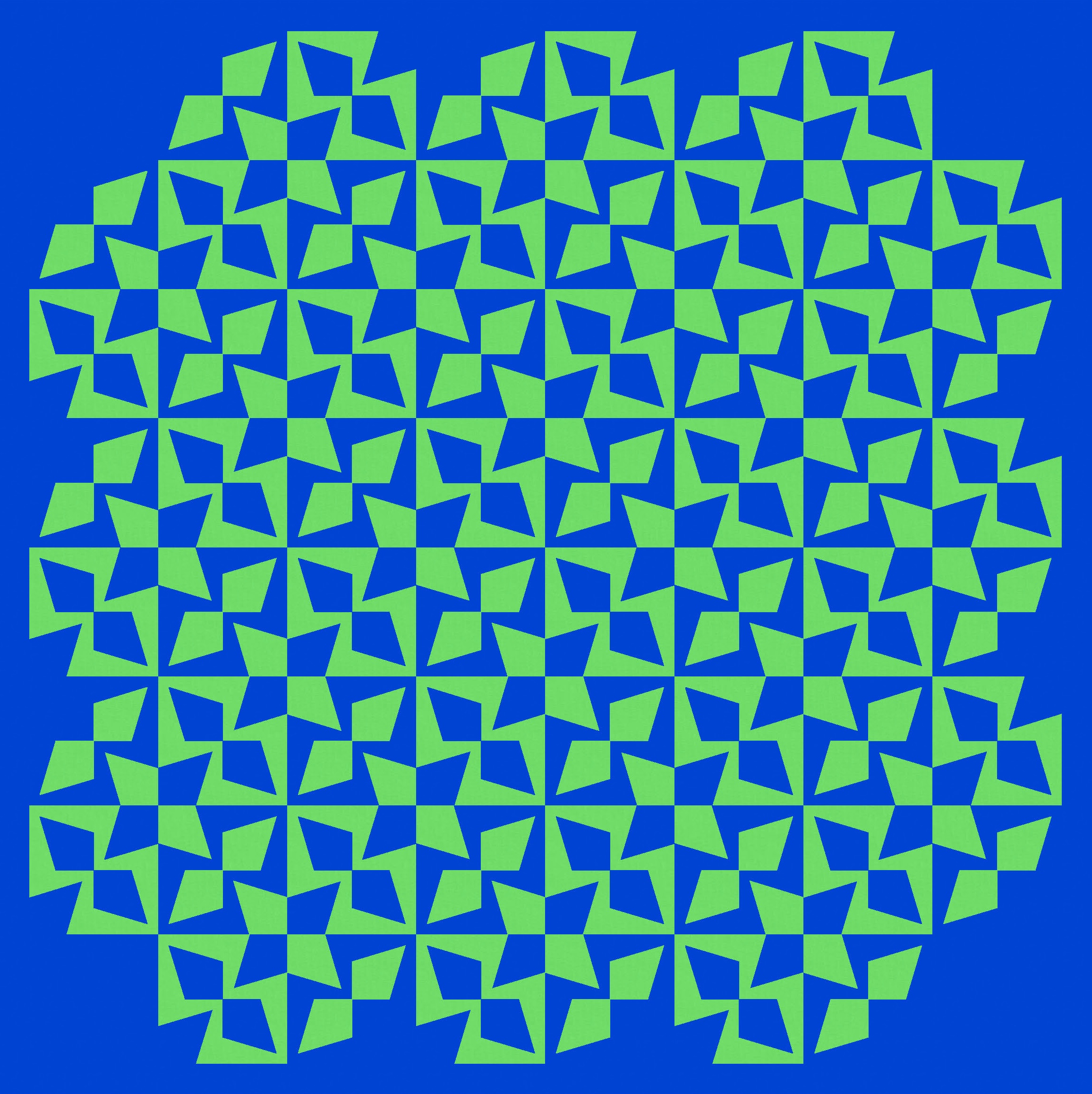 Tiling the first version, in an alternating colourway, reveals some fun new shapes… some circle-like shapes created by the diagonal kite pairs, and those stars in the corners between 4 blocks.