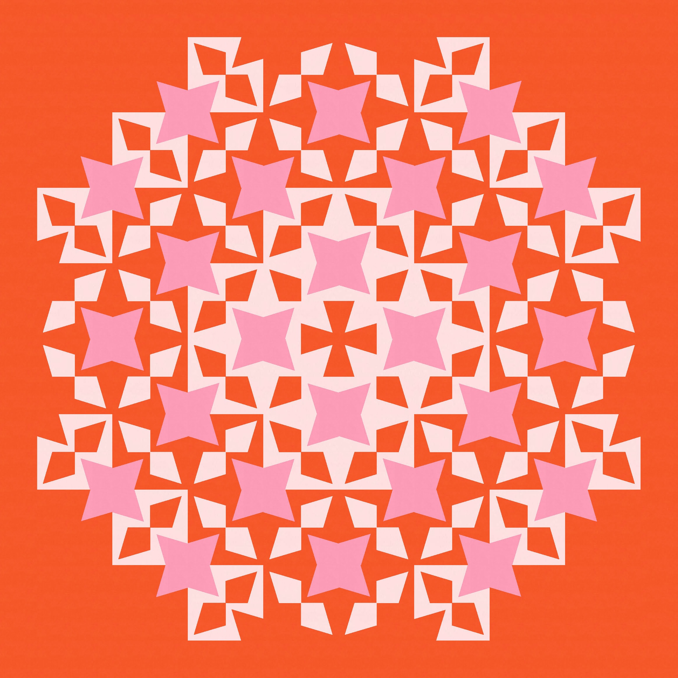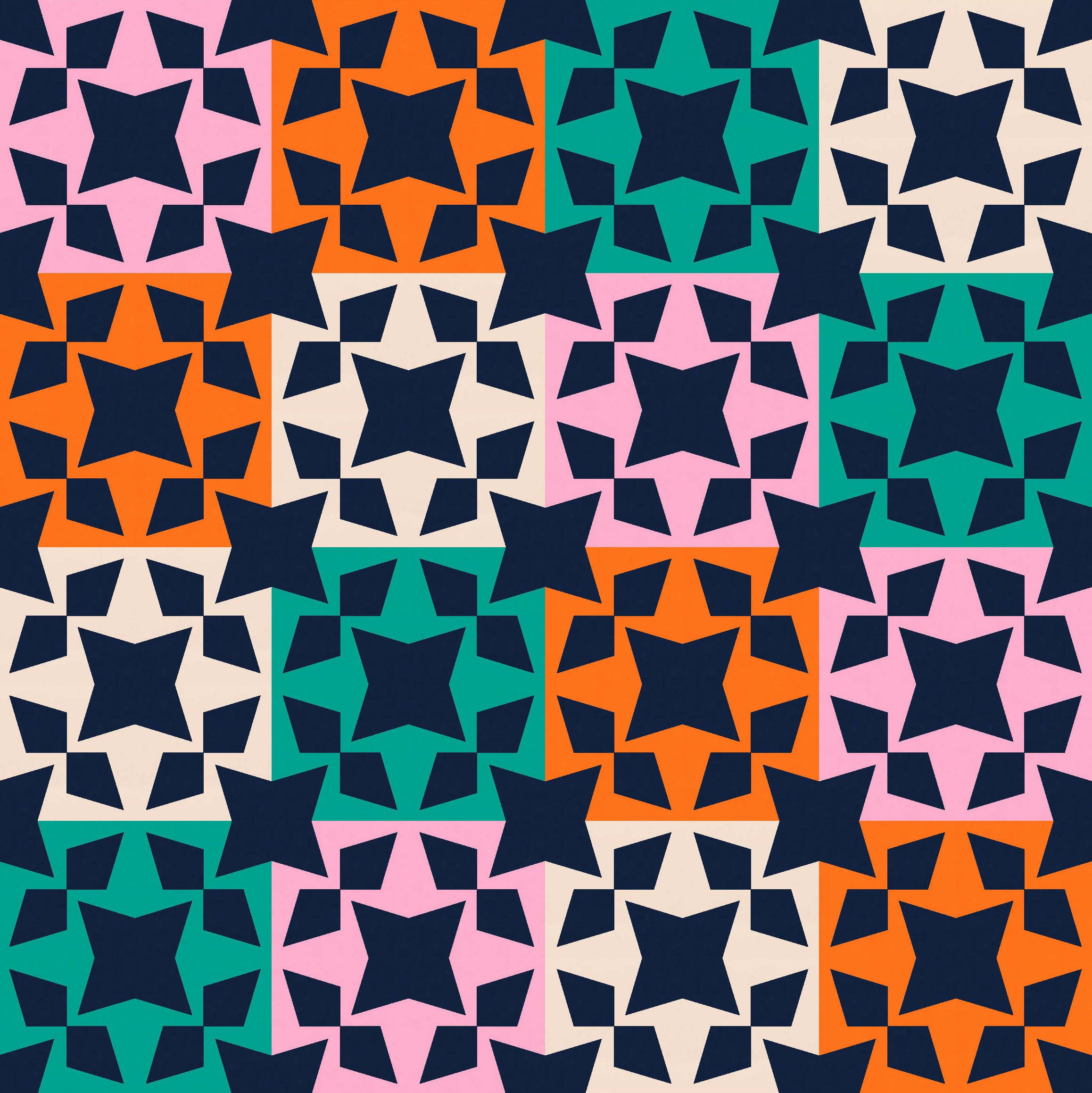 A two-colour palette also works, but I don’t love those stars at the corners between 4 blocks. That’s just a personal preference – I will almost always try to change a shape like that, cos I just don’t love it. I have no idea why! Something about the vertical and horizontal lines cutting through a shape… it just doesn’t do it for me. (I guess if I create a design where a shape extends beyond the block’s edges, I don’t want the edges to be obvious.)