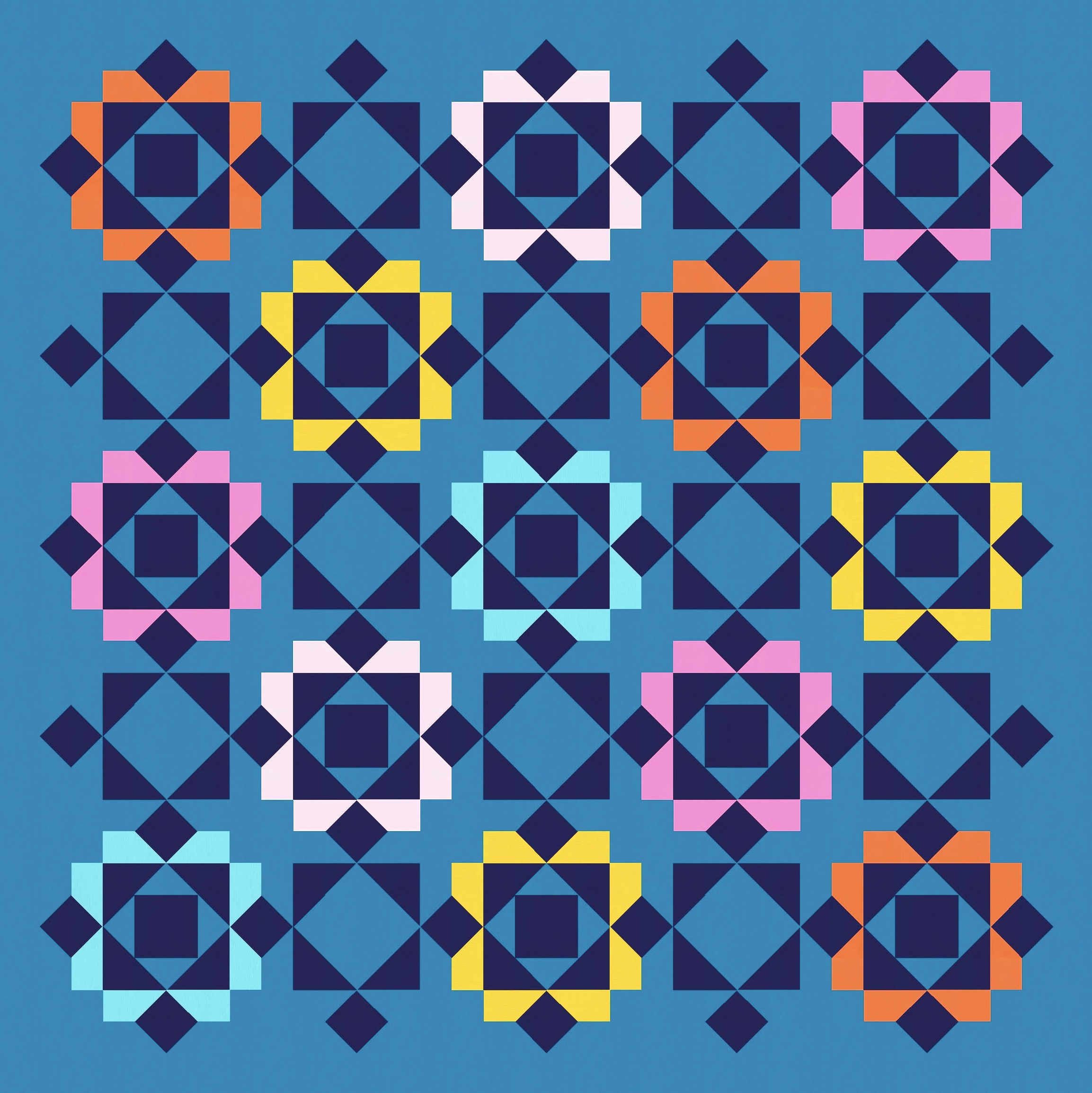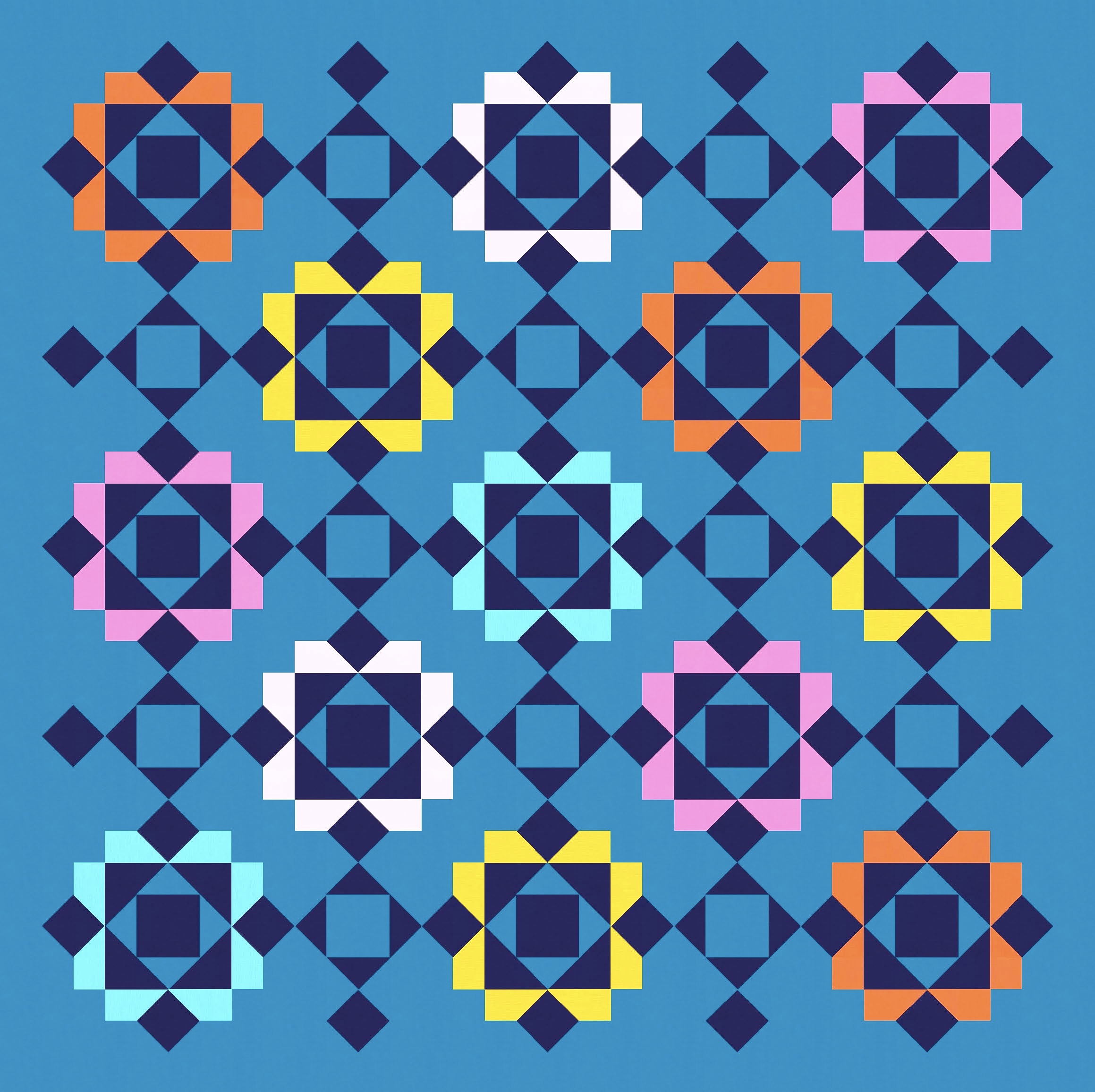 There are lots of different ways you could construct this design as an actual quilt. In a standard layout, you could use economy blocks, large and small square-in-a-square units, and some squares. If you treated the layout as if it were on point, you could use square-in-a-square units, flying geese, squares and some smaller flying geese or quarter-square triangles. I’d probably opt for the former.
