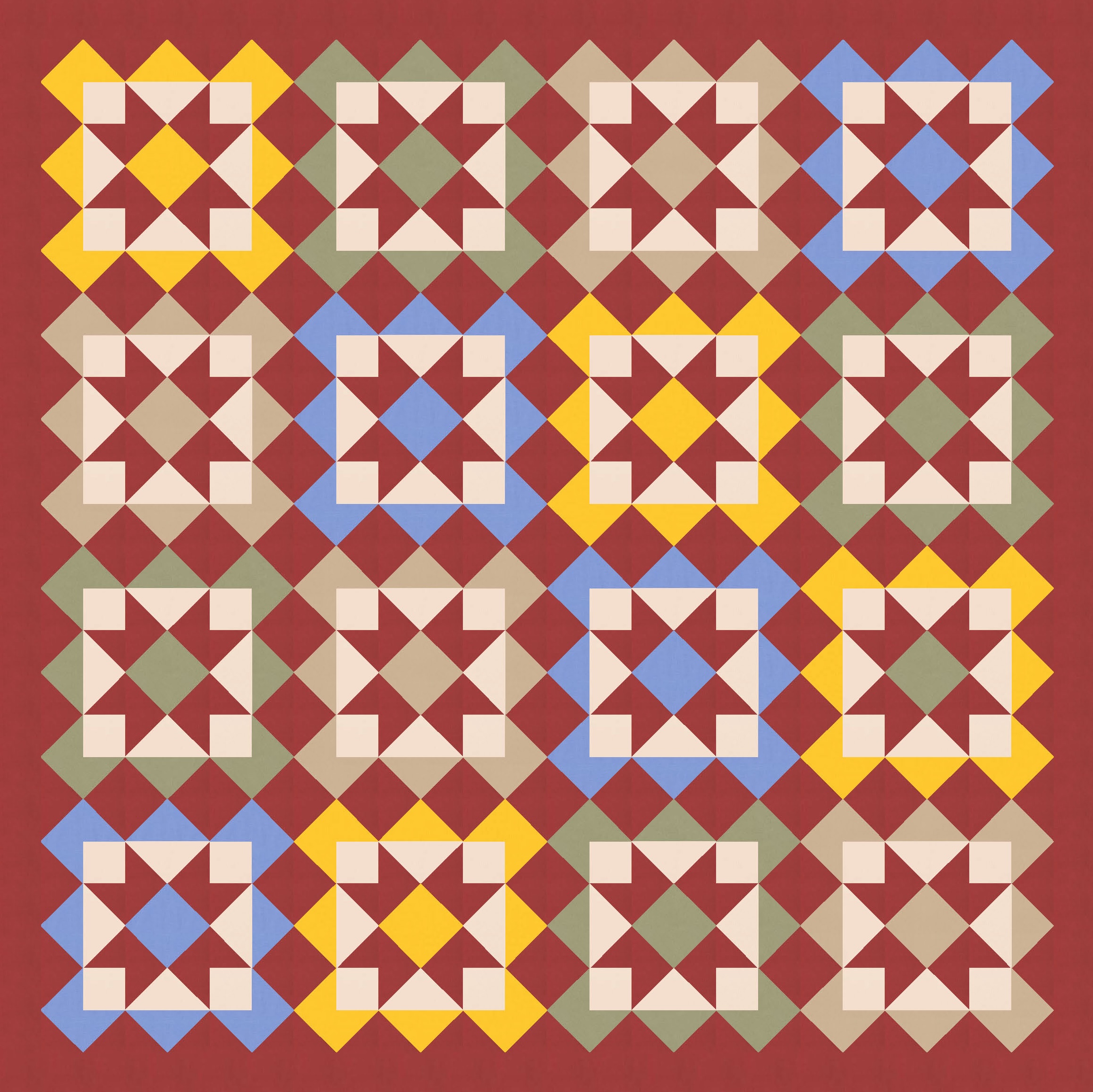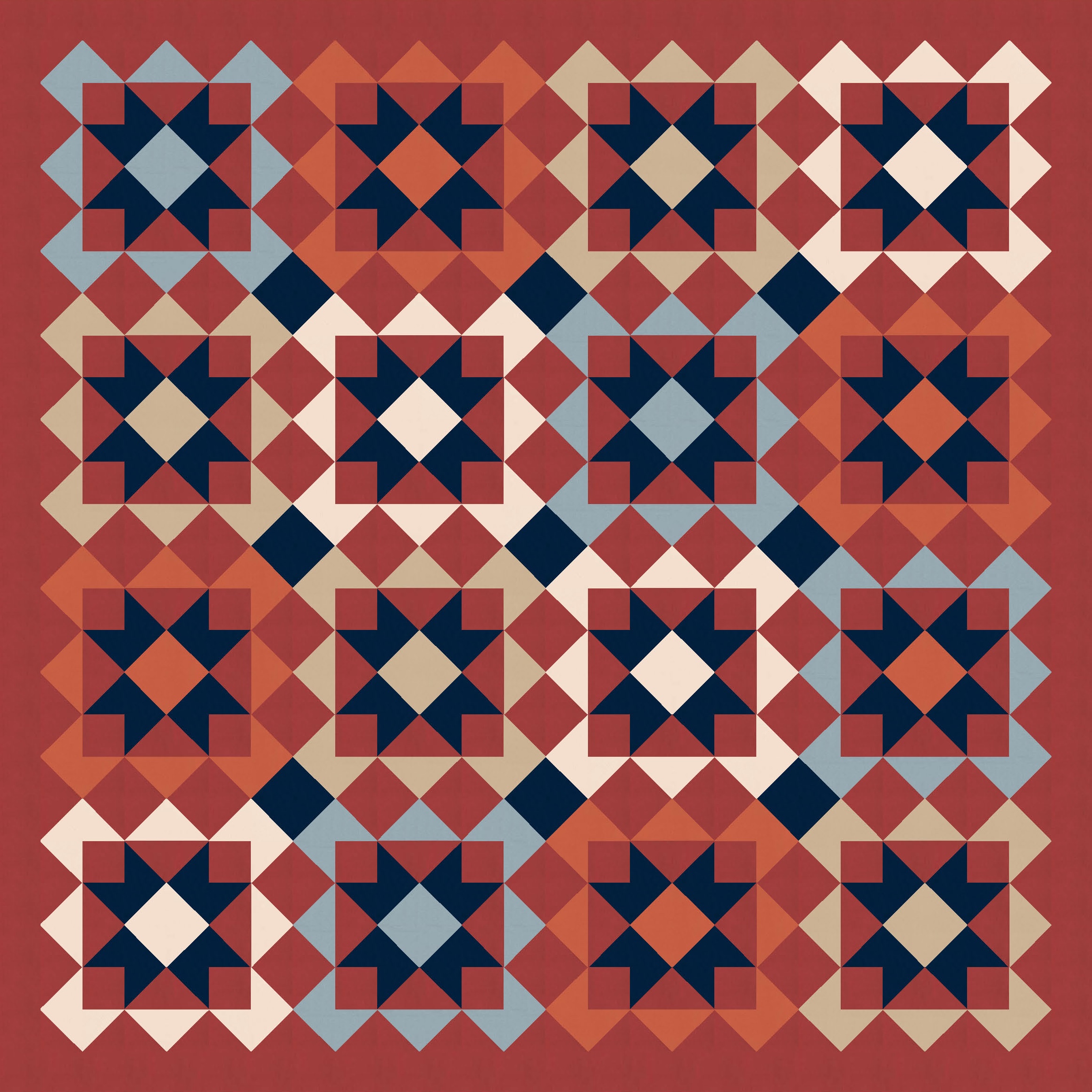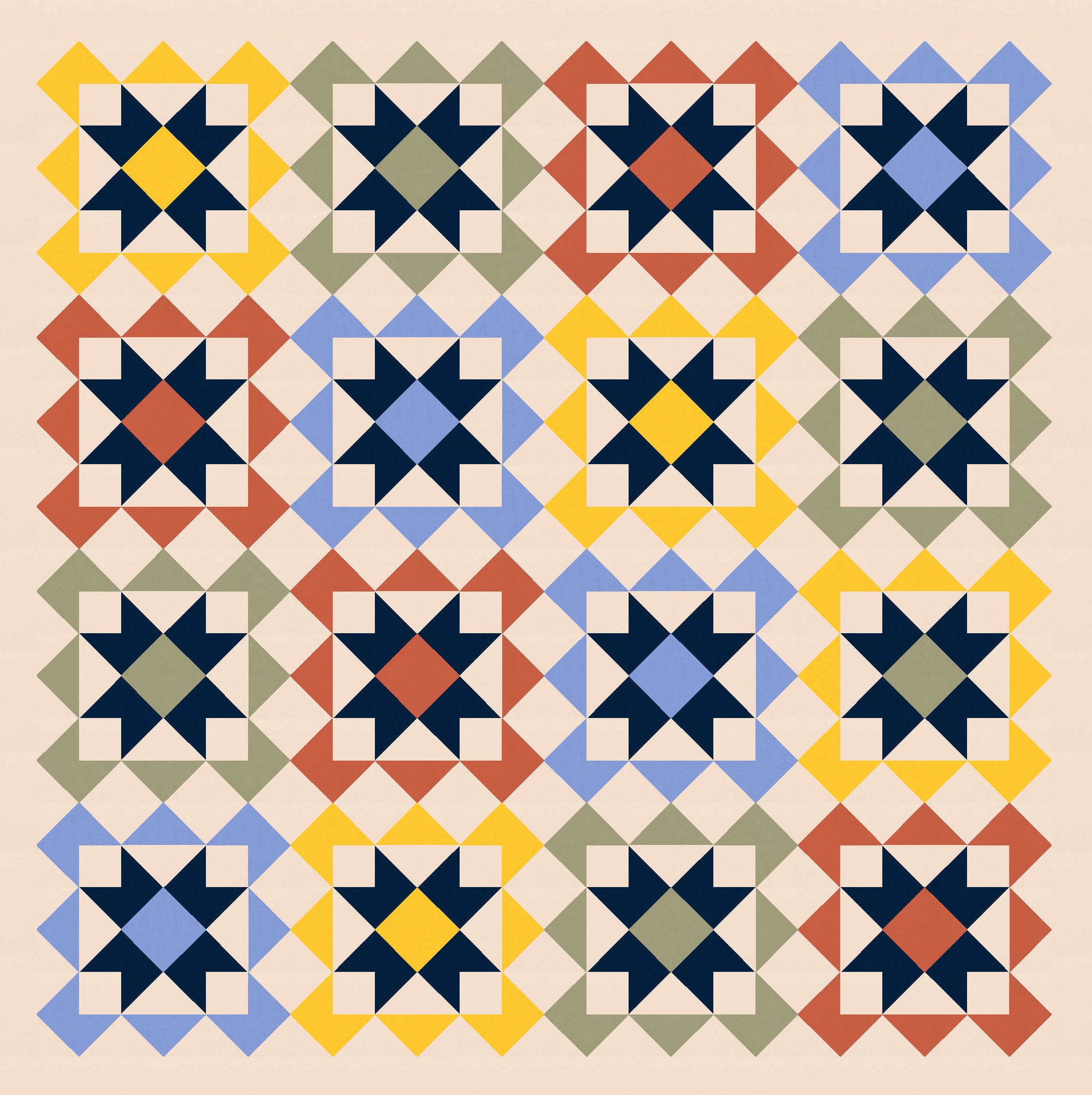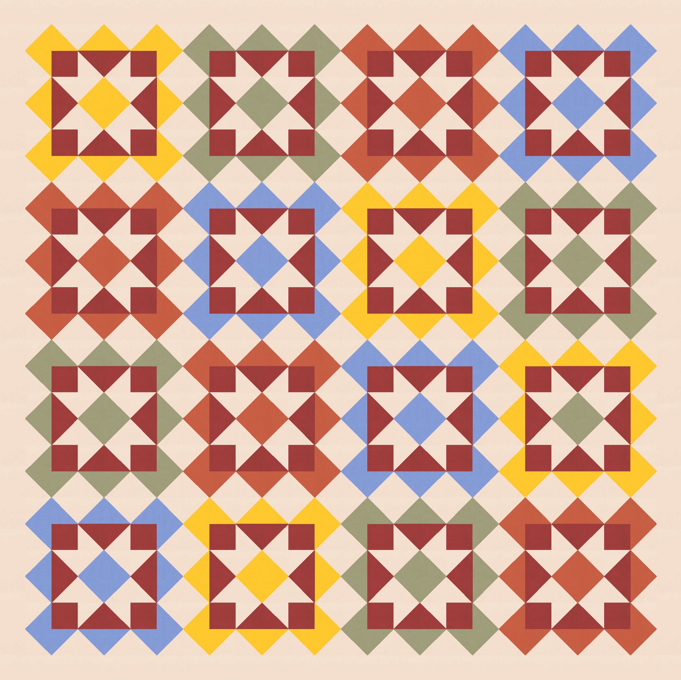 Anyway, I also tried a larger palette and colouring the blocks differently. I’ve used the background colour consistently across all blocks, as well as that darker colour to tie things together. I like how colouring those squares in the middle (the ones on point, between the blocks’ corners) connects the blocks diagonally too.