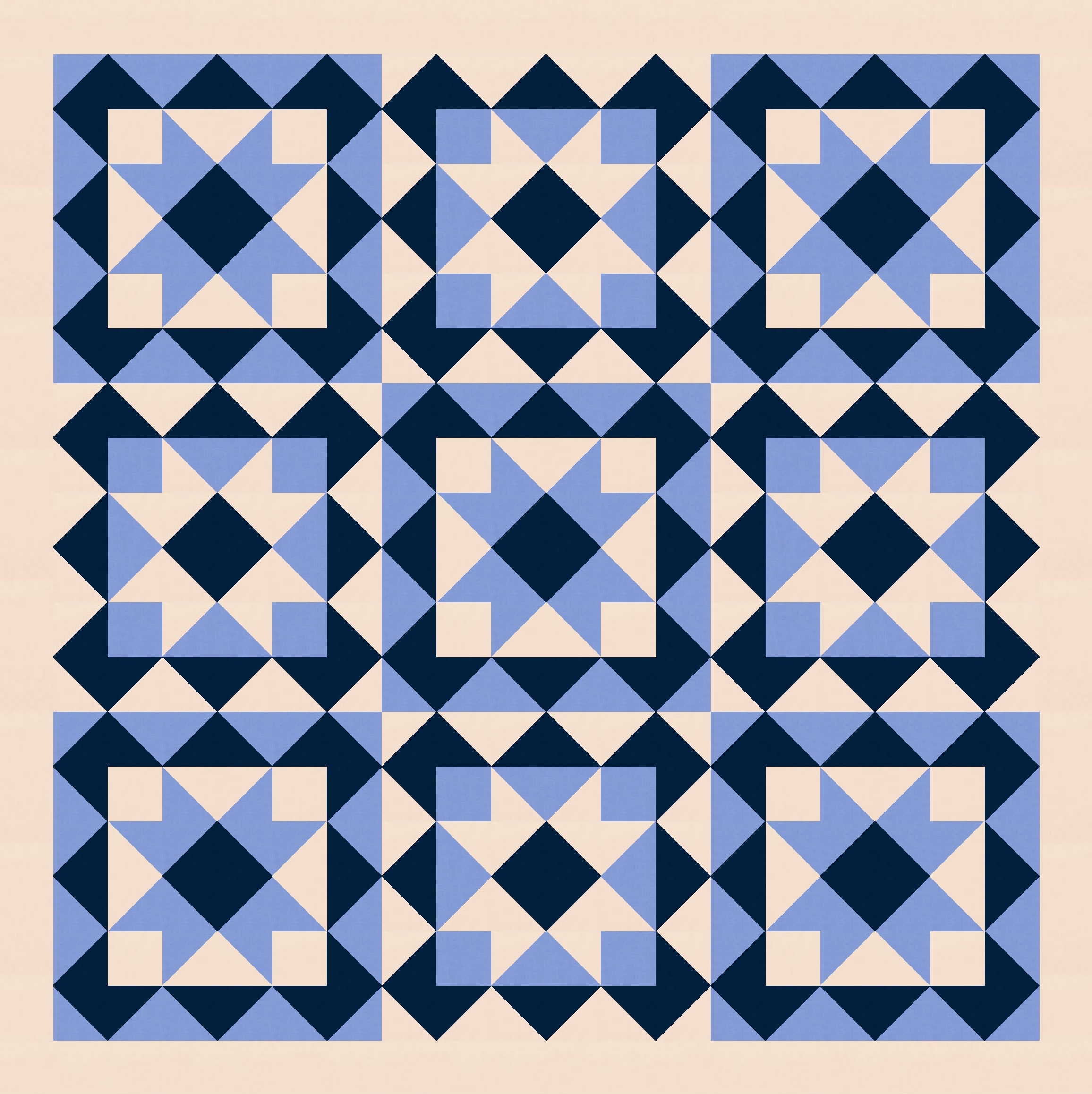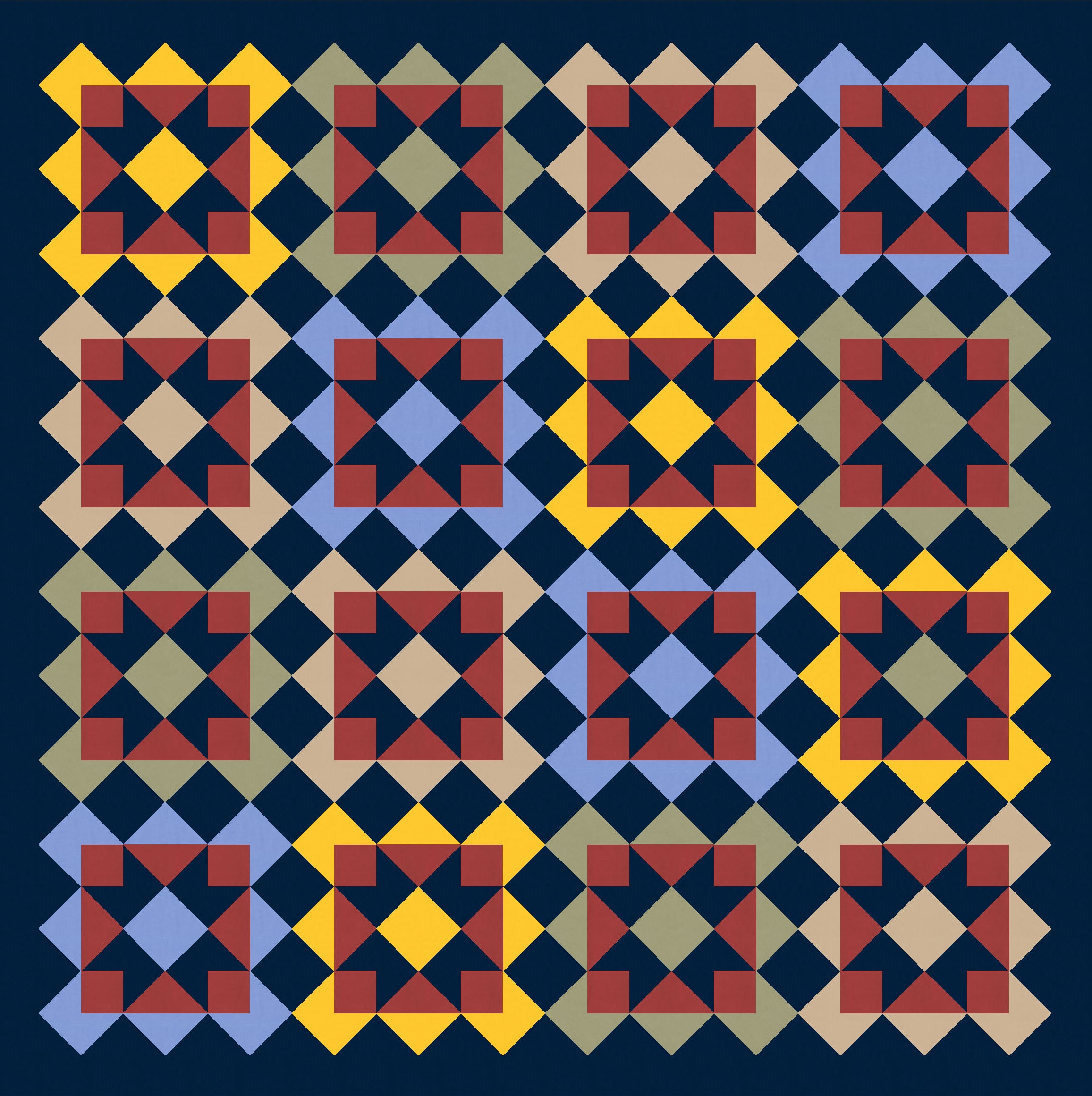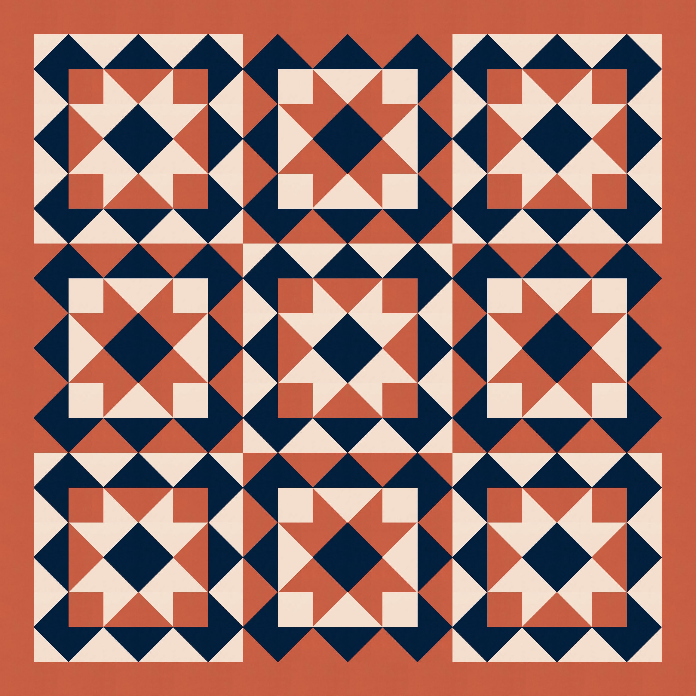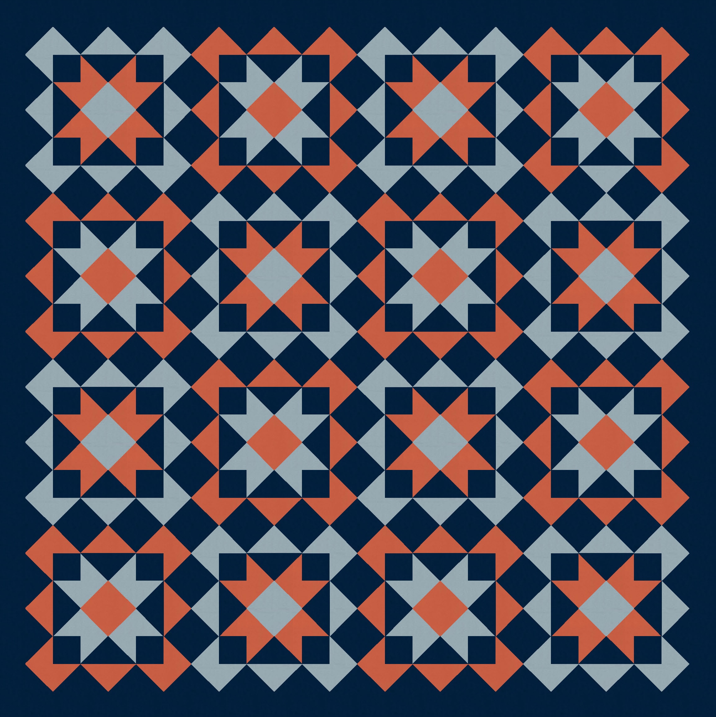 Anyway, I also tried a larger palette and colouring the blocks differently. I’ve used the background colour consistently across all blocks, as well as that darker colour to tie things together. I like how colouring those squares in the middle (the ones on point, between the blocks’ corners) connects the blocks diagonally too.